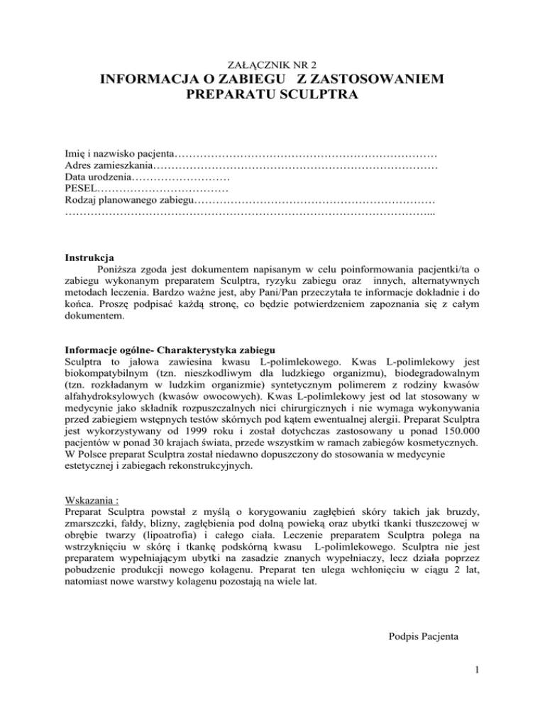 ZAŁĄCZNIK NR 2 INFORMACJA O ZABIEGU Z ZASTOSOWANIEM PREPARATU SCULPTRA Imię i nazwisko pacjenta……………………………………………………………… Adres zamieszkania…………………………………………………………………… Data urodzenia……………………… PESEL……………………………… Rodzaj planowanego zabiegu………………………………………………………… ………………………………………………………………………………………... Instrukcja Poniższa zgoda jest dokumentem napisanym w celu poinformowania pacjentki/ta o zabiegu wykonanym preparatem Sculptra, ryzyku zabiegu oraz innych, alternatywnych metodach leczenia. Bardzo ważne jest, aby Pani/Pan przeczytała te informacje dokładnie i do końca. Proszę podpisać każdą stronę, co będzie potwierdzeniem zapoznania się z całym dokumentem. Informacje ogólne- Charakterystyka zabiegu Sculptra to jałowa zawiesina kwasu L-polimlekowego. Kwas L-polimlekowy jest biokompatybilnym (tzn. nieszkodliwym dla ludzkiego organizmu), biodegradowalnym (tzn. rozkładanym w ludzkim organizmie) syntetycznym polimerem z rodziny kwasów alfahydroksylowych (kwasów owocowych). Kwas L-polimlekowy jest od lat stosowany w medycynie jako składnik rozpuszczalnych nici chirurgicznych i nie wymaga wykonywania przed zabiegiem wstępnych testów skórnych pod kątem ewentualnej alergii. Preparat Sculptra jest wykorzystywany od 1999 roku i został dotychczas zastosowany u ponad 150.000 pacjentów w ponad 30 krajach świata, przede wszystkim w ramach zabiegów kosmetycznych. W Polsce preparat Sculptra został niedawno dopuszczony do stosowania w medycynie estetycznej i zabiegach rekonstrukcyjnych. Wskazania : Preparat Sculptra powstał z myślą o korygowaniu zagłębień skóry takich jak bruzdy, zmarszczki, fałdy, blizny, zagłębienia pod dolną powieką oraz ubytki tkanki tłuszczowej w obrębie twarzy (lipoatrofia) i całego ciała. Leczenie preparatem Sculptra polega na wstrzyknięciu w skórę i tkankę podskórną kwasu L-polimlekowego. Sculptra nie jest preparatem wypełniającym ubytki na zasadzie znanych wypełniaczy, lecz działa poprzez pobudzenie produkcji nowego kolagenu. Preparat ten ulega wchłonięciu w ciągu 2 lat, natomiast nowe warstwy kolagenu pozostają na wiele lat. Podpis Pacjenta 1 Jak poinformował Panią/ Pana lekarz, w zależności od powierzchni i nasilenia ubytków, ilości podanego preparatu Sculptra oraz miejsca wstrzykiwania, efekt leczenia preparatem Sculptra może się utrzymywać nawet przez 2 lata, jednak w niektórych przypadkach może być krótszy lub dłuższy. Korekcja większości partii twarzy wymaga przeprowadzenia kilku zabiegów. Zazwyczaj optymalny efekt korekcji osiąga się po wykonaniu 3 zabiegów w odstępach czasu wynoszących nie mniej niż 4 tygodnie. Z uwagi na fakt, że indywidualne reakcje pacjentów na preparat Sculptra mogą być różne, nie jest możliwe określenie zawczasu dokładnej liczby zabiegów, jakie trzeba będzie wykonać. Ponadto utrzymanie pożądanego stopnia korekcji może wymagać wykonywania co pewien czas niewielkich zabiegów retuszujących. Leczenie alternatywne : Leczenie alternatywne obejmuje zastosowanie laseroterapii, mezoterapii i innych preparatów poprawiających strukturę skóry i wpływających na pobudzenie produkcji nowego kolagenu. W celu poprawy napięcia skóry mogą być również wykonywane zabiegi operacyjne. Celem proponowanego zabiegu jest :…………………………………………………………... ………………………………………………………………………………………………….. ………………………………………………………………………………………………….. Dające się przewidzieć następstwa zabiegu : 1. Krwawienie – Stosowanie leków przeciwzapalnych, substancji obniżających krzepliwość krwi lub aspiryny może spowodować krwawienie z miejsca wkłucia lub powstanie większego zasinienia. Aby zmniejszyć ryzyko wystąpienia krwawienia nie można zażywać aspiryny i leków przeciwzapalnych co najmniej 21 dni przed planowanym zabiegiem. 2. Blizny – Każde postępowanie chirurgiczne powoduje powstawanie blizn, które czasami nie są ładne. Nieprawidłowe blizny mogą występować na powierzchni skóry i tkankach położonych głębiej. Blizny mogą mieć kolor różniący się od koloru otaczającej skóry. W celu korekcji tych blizn może być konieczna dodatkowa korekcja. 3. Przebarwienia skóry/obrzęk – zasinienia skóry i obrzęk mogą występować po zabiegu wstrzyknięcia preparatu Sculptra. Skóra w operowanej okolicy może wydawać się jaśniejsza lub ciemniejsza niż otaczająca skóra. Rzadko zdarza się jednak, że to przebarwienie skóry może utrzymywać się przez długi okres czasu lub może pozostać na zawsze. 4. Odległe wyniki – Zmiany kształtu ciała mogą być związane z wiekiem, odchudzaniem się lub tyciem, ciążą lub z innymi zmianami w organizmie zachodzącymi niezależnie od przebytego wcześniej zabiegu. 5. Ból – Po zabiegu może występować ból o różnym nasileniu. Przewlekły ból występuje rzadko i związany jest zazwyczaj z pociąganiem nerwów przez powstającą bliznę. Po lekach przeciwbólowych nie wolno prowadzić samochodu, nie wolno podejmować ważnych decyzji, nie wolno pić alkoholu. Podpis Pacjenta 2 6. Sculptra jest podawana w postaci roztworu zawierającego wodę, zatem bezpośrednio po zabiegu należy spodziewać się opuchlizny (obrzęku), która będzie widoczna przez co najmniej kilka godzin, a może utrzymać się nawet przez kilka dni. Efekt ten jest przejściowy i nie ma wpływu na długoterminową reakcję tkanki na leczenie. 7. Po iniekcji/iniekcjach wystąpią najprawdopodobniej reakcje powszechnie występujące w następstwie zastrzyku, takie jak obrzęk, zaczerwienienie, bolesność, swędz