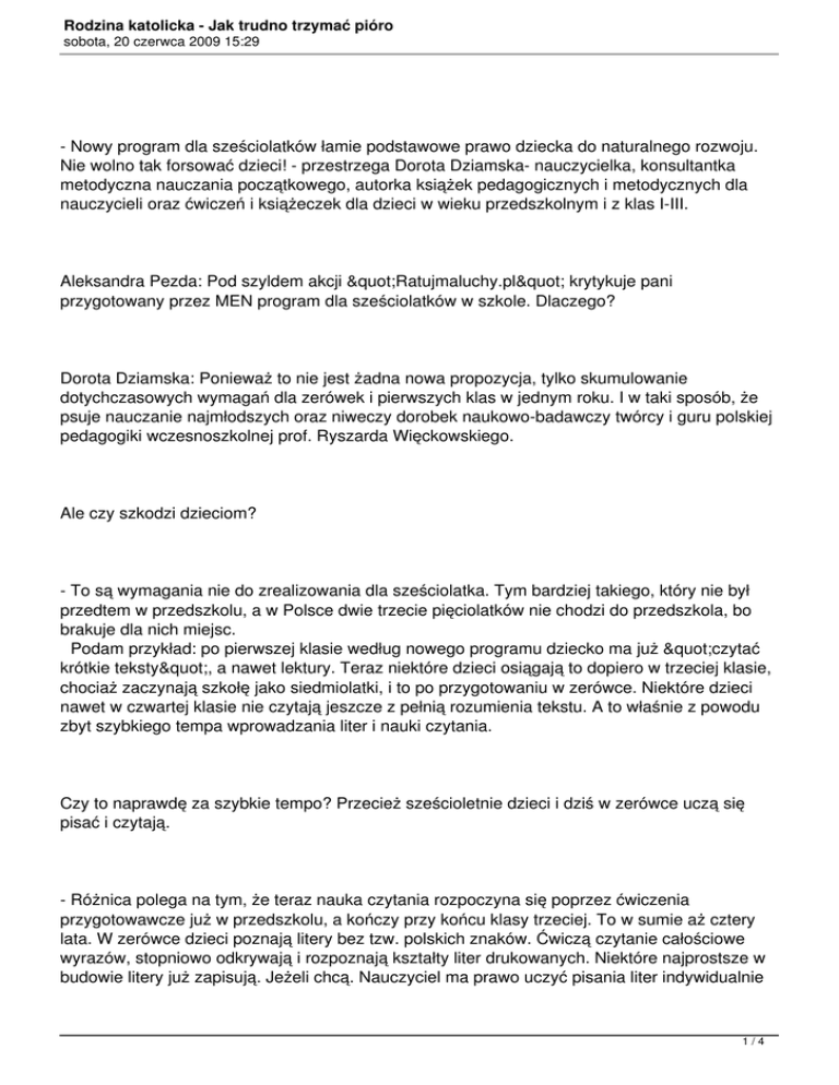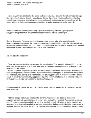 Rodzina katolicka - Jak trudno trzymać pióro sobota, 20 czerwca 2009 15:29 - Nowy program dla sześciolatków łamie podstawowe prawo dziecka do naturalnego rozwoju. Nie wolno tak forsować dzieci! - przestrzega Dorota Dziamska- nauczycielka, konsultantka metodyczna nauczania początkowego, autorka książek pedagogicznych i metodycznych dla nauczycieli oraz ćwiczeń i książeczek dla dzieci w wieku przedszkolnym i z klas I-III. Aleksandra Pezda: Pod szyldem akcji "Ratujmaluchy.pl" krytykuje pani przygotowany przez MEN program dla sześciolatków w szkole. Dlaczego? Dorota Dziamska: Ponieważ to nie jest żadna nowa propozycja, tylko skumulowanie dotychczasowych wymagań dla zerówek i pierwszych klas w jednym roku. I w taki sposób, że psuje nauczanie najmłodszych oraz niweczy dorobek naukowo-badawczy twórcy i guru polskiej pedagogiki wczesnoszkolnej prof. Ryszarda Więckowskiego. Ale czy szkodzi dzieciom? - To są wymagania nie do zrealizowania dla sześciolatka. Tym bardziej takiego, który nie był przedtem w przedszkolu, a w Polsce dwie trzecie pięciolatków nie chodzi do przedszkola, bo brakuje dla nich miejsc. Podam przykład: po pierwszej klasie według nowego programu dziecko ma już "czytać krótkie teksty", a nawet lektury. Teraz niektóre dzieci osiągają to dopiero w trzeciej klasie, chociaż zaczynają szkołę jako siedmiolatki, i to po przygotowaniu w zerówce. Niektóre dzieci nawet w czwartej klasie nie czytają jeszcze z pełnią rozumienia tekstu. A to właśnie z powodu zbyt szybkiego tempa wprowadzania liter i nauki czytania. Czy to naprawdę za szybkie tempo? Przecież sześcioletnie dzieci i dziś w zerówce uczą się pisać i czytają. - Różnica polega na tym, że teraz nauka czytania rozpoczyna się poprzez ćwiczenia przygotowawcze już w przedszkolu, a kończy przy końcu klasy trzeciej. To w sumie aż cztery lata. W zerówce dzieci poznają litery bez tzw. polskich znaków. Ćwiczą czytanie całościowe wyrazów, stopniowo odkrywają i rozpoznają kształty liter drukowanych. Niektóre najprostsze w budowie litery już zapisują. Jeżeli chcą. Nauczyciel ma prawo uczyć pisania liter indywidualnie 1/4 Rodzina katolicka - Jak trudno trzymać pióro sobota, 20 czerwca 2009 15:29 te dzieci, których dłoń i ramię wytrzymują stosowne napięcie mięśniowe. W pierwszej klasie utrwalają poznane kształty liter i poznają kolejne litery. Tak naprawdę część dzieci dopiero w siódmym, a nawet w ósmym roku życia dokładnie słyszy wszystkie dźwięki mowy. Np. potrafi wyróżnić głoskę przedstawiającą dwuznak "dź" na początku czy na końcu wyrazu. Jeśli sześciolatka zapytamy, co słyszy na początku słowa "dźwig", powie "ćf ". A na końcu? Powie "k". Czasami nic nie powie, bo nie umie wyróżnić lub w ogóle go to jeszcze nie interesuje. A w wyniku reformy będzie musiał poprawnie nazwać głoski w tym wyrazie i je zapisać, ponieważ już przy końcu klasy pierwszej ma znać wszystkie litery i zapisywać je! Pisanie zgodnie z metodyką nauczania jest konsekwencją nauki czytania. Dzieci nie mogą zapisywać tego, czego nie rozumieją i w oderwaniu od doświadczeń słuchowych. Dla dziecka to problem - dlaczego ma zapisać literkę "g" w miejscu, gdzie słyszy "k"? Sześciolatek nie dostrzeże w tym logiki. Nauka języka polskiego wymaga wielu ćwiczeń i powtórzeń, aby zakorzenić w umyśle dziecka właściwe umiejętności. Jednak według ekspertów powołanych przez MEN do opracowania nowych programów nauczania te powtórki materiału są stratą czasu. Właśnie powtarzanie ministerstwo chce zlikwidować w całej edukacji. - To bzdura, w każdym razie jeśli chodzi o edukację wczesnoszkolną. Dzieci potrzebują powtórek. Po to, żeby przesunąć zdobyte doświadczenia z pamięci krótkotrwałej do długotrwałej. Bez powtórek uczniowie nie utrwalą ogromu doświadczeń, nie zapamiętają liter, nie opanują czytania i pisania. Chodzi również o fizjologię - trzeba powoli stymulować układ mięśniowy i przygotowywać do pisania. Tego się nie da przeskoczyć, bo nagle jakiejś grupie reformatorów wydaje się, że tak by było prościej i piękniej. W dodatku nowa podstawa programowa zrywa z zasadą nauczania zintegrowanego, bo wyznacza konkretne efekty do osiągnięcia dziecku już po pierwszej klasie. Teraz jest tak: dajemy dziecku możliwość dojścia do konkretnego efektu w dłuższym okresie. Jedno dziecko poradzi sobie z tym zadaniem szybciej, drugie wolniej. Ale stawiamy na to, żeby każde rozwijało się we własnym tempie. Na tym dokładnie polega istota tzw. edukacji zintegrowanej, która mogłaby być sukcesem polskiej szkoły po reformie z 1999 r. Jednak MEN zamierza właśnie wyodrębnić pierwszą klasę z całego etapu edukacji wczesnoszkolnej... Tak ma być po to, żeby nauczyciele lepiej wiedzieli, czego uczyć sześciolatki. To nowe zadanie - mówią w MEN - dlatego trzeba je precyzyjnie określić. - Tylko że to wbrew osiągnięciom najnowszej pedagogiki. Wyprodukujemy przez to 2/4 Rodzina katolicka - Jak trudno trzymać pióro sobota, 20 czerwca 2009 15:29 dyslektyków, dysgrafików i mnóstwo zahamowań u dzieci. Z powodu przyspieszonego tempa mniej ważne stanie się to, co w istocie najważniejsze w rozwoju małych dzieci, czyli równomierny rozwój motoryczny, emocjonalny i społeczny. Proszę sobie wyobrazić młodego nauczyciela tuż po studiach. On ma w nowym programie napisane: "dziecko po pierwszej klasie ma znać wszystkie litery, czytać ze zrozumieniem krótkie teksty, nawet lektury, pisać krótkie zdania, przepisywać z pamięci, dbać o estetykę i poprawność graficzną, przestrzegać zasad kaligrafii". To brzmi jak jakaś tresura. Ale tymi zadaniami nauczyciel będzie się kierował - z realizacji podstawy rozliczać go bowiem będzie wizytator, dyrektor i komisja od awansu zawodowego. Będzie więc trzymał dzieci w ławkach i ćwiczył kaligrafię oraz czytanie. A podręcznik
