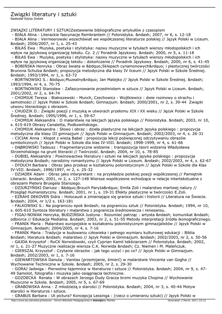 Związki literatury i sztuki Nadesłał Edyta Dobek ZWIĄZKI LITERATURY I SZTUKIZestawienie bibliograficzne artykułów z czasopism - BIAŁA Alina : Literackie fascynacje Rembrantem // Polonistyka. – 2007, nr 6, s. 12-18 - BIAŁA Alina : Vermeerowski wszechświat we współczesnej literaturze polskiej // Język Polski w Liceum. – 2006/2007, nr 1, s. 25-43 - BIŁAS Ewa : Muzyka, poetyka i stylistyka: nazwy muzyczne w tytułach wierszy młodopolskich i ich wpływ na językową organizację tekstu. Cz. 2 // Poradnik Językowy. – 2000, nr 5, s. 11-18 - BIŁAS Ewa : Muzyka, poetyka i stylistyka: nazwy muzyczne w tytułach wierszy młodopolskich i ich wpływ na językową organizację tekstu : dokończenie // Poradnik Językowy. – 2000, nr 6, s. 41-45 - BOBIŃSKA Henryka : Obraz świata w „Sklepach cynamonowych” i plastycznej twórczości Brunona Schulza – propozycja metodyczna dla klasy IV liceum // Język Polski w Szkole Średniej. – 1993/1994, nr 1, s. 63-72 - BORTNOWSKI S.: „Muzealny” Jan Matejko // Język Polski w Szkole Średniej. – 1993/1994, nr 4, s. 70-75 - BORTNOWSKI Stanisław : Zafascynowanie przedmiotem w sztuce // Język Polski w Liceum. – 2001/2002, nr 2, s. 64-74 - CHOMIUK Teresa : Białoszewski - Munch, Czechowicz - Wojtkiewicz : dwie rozmowy o strachu i samotności // Język Polski w Szkole – Gimnazjum. – 2000/2001, nr 2, s. 39-44 Związki utworu literackiego z obrazem. - CHUDZIK D.: Związki poezji z muzyką w utworach przełomu XIX i XX wieku // Język Polski w Szkole Średniej. – 1995/1996, nr 1, s. 59-67 - CHOMIUK Aleksandra : O malarstwie na lekcjach języka polskiego // Polonistyka. – 2003, nr 10, s. 615-619 Obrazy Canaletta, Podkowińskiego. - CHOMIUK Aleksandra : Słowo i obraz : dzieła plastyczne na lekcjach języka polskiego : propozycja metodyczna dla klasy III gimnazjum // Język Polski w Gimnazjum. – 2002/2003, nr 4, s. 26-31 - CICIAK Anna : Kłopot z wieżą Babel : propozycja lekcji poświęconej odczytywaniu obrazów symbolicznych // Język Polski w Szkole dla klas IV-VIII. – 1998-1999, nr 4, s. 61-66 - DĄBROWSKI Tadeusz : Fragmentaryczne widzenie : transpozycja teorii widzenia Władysława Strzemińskiego na grunt literacki // Twórczość. – 2004, nr 10, s. 78-85 - DUBIEL Aleksandra : Powinowactwa literatury i sztuki na lekcjach języka polskiego : propozycja metodyczna – narodziny romantyzmu // Język Polski w Liceum. – 2002/2003, nr 4, s. 62-67 - DYDUCH Barbara : Obraz jako przekaz w kształceniu polonistycznym // Język Polski w Szkole dla Klas IV-VIII. – 1996/1997, nr 2, s. 25-32 - DZIADEK Adam : Obraz jako interpretant : na przykładzie polskiej poezji współczesnej // Pamiętnik Literacki. – 2001, nr 2, s. 127-148 Wiersze współczesne wchodzące w relacje intertekstualne z obrazami Pietera Bruegela Starszego. - DZIURZYŃSKI Dariusz : „Brzuch Paryża” Emila Zoli i malarstwo martwej natury // Przegląd Humanistyczny. – 2001, nr 1, s. 19-31 Efekty plastyczne w twórczości E.Zoli. - EZRAHI DEKOVEN Sidra : Holocaust a zmieniające się granice sztuki i historii // Literatura na Świecie. – 2004, nr 1/2 s. 163-181 - FALKOWSKI S.: Na pograniczu epok – na pograniczu sztuk // Polonistyka. – 1994, nr 10, s. 605-610 Synteza literatury i malarstwa z pogranicza średniowiecza i renesansu. - FIGAJ-NOWAK Henryka, BUDZIŃSKA Justyna : Rozumieć patrząc : artysta – komunikat – odbiorca // Edukacja Medialna. – 2003, nr 2, s. 51-55 Metody interpretacji źródła ikonograficznego. - FRANIK Maria : Malarstwo europejskie w kształceniu polonistycznym gimnazjalistów // Język Polski w Gimnazjum. – 2004/2005, nr 4, s. 7-16 - FRANIK Maria : Tradycja w budowaniu człowieka i pełnego wymiaru kulturowej edukacji : Biblia – literatura – malarstwo // Język Polski w Gimnazjum. – 2002/2003, nr 2, s. 50-56 - GAJDA Krzysztof : RoCK Norwidowski, czyli Cyprian Kamil tekściarzem // Polonistyka. – 2002, nr 1, s. 21-27 Muzyczne realizacje wiersza C.K. Norwida – Cz. Niemen i M. Maleńczuk. - GIERSZAL Krzysztof : Czytanie obrazów : jak tego uczyć i po co? // Język Polski w Gimnazjum. – 2002/2003, nr 1, s. 7-16 - GIEWARTOWSKA Danuta : Vanitas (przemijanie, śmierć) w malarstwie Vincenta van Gogha // Wychowanie Techniczne w Szkole. – 2005, nr 2, s. 29-30 - GORAJ Jadwiga : Pierwotne tajemnice w literaturze i sztuce // Polonistyka. – 2004, nr 9, s. 4749 Samolot, fotografia i muzyka jako osiągnięcia techniczne. - GOZDECKA Renata : W obrazach Jerzego Dudy Gracza brzmi muzyka Chopina // Wychowanie Muzyczne w Szkole. – 2005, nr 5, s. 67-69 - GRABOWSKA Anna : Z młodzieżą o starości // Polonistyka. – 2004, nr 3, s. 40-44 Motyw starości w literaturze i sztuce. - GRABUS Barbara : Ut pictura? Koncepcja Lessinga : (rzecz o umieraniu sztuki) // Język Polski w http://www.bp.ostroleka.pl/testowy - Serwis Biblioteki Pedagogicznej w Ostrołęce Powered by Mambo Generated: 2 March, 2017, 23:12 Liceum. – 2004/2005, nr 3, s. 42-49 - GRODECKA Aneta : Alfabet języka plastycznego i muzycznego // Polonistyka. – 2003, nr 5, s. 275-278 - GRODECKA Aneta : O możliwościach edukacyjnych ekfrazy poetyckiej // Polonistyka. – 2008, nr 10, s. 24-31 Poezja a malarstwo. - HENDRYKOWSKI Marek : Film i literatura – nowy paradygmat // Polonistyka. – 2002, nr 7, s. 388-391 Związki literatury i filmu. - JANUS-SITARZ Anna : Ideał kobiecej urody w malarstwie i literaturze baroku // Język Polski w Szkole Średniej. – 2000/2001, nr 1, s. 244-32 - JĘDRYCHOWSKA Maria : Międzytekstowe zderzenia i dydaktyczne zdarzenia // Polonistyka. – 2001, nr 1, s. 4-10 Związki dzieła literackiego z tekstami ikonicznymi. - KASZUBA Małgorzata : Jak patrzeć na obraz malarski?// Język Polski w Szkole dla k. IV-VI. – 1999/2000, nr 2, s. 36-37 - KOŁOSIŃSKA Monika : Sacrum i dzieło – lekcja z obrazem // Polonistyka. – 2001, nr 9, s. 554-557 Propozycja dwugodzinnych zajęć dotyczących obrazu Piero della Francesca „Naro