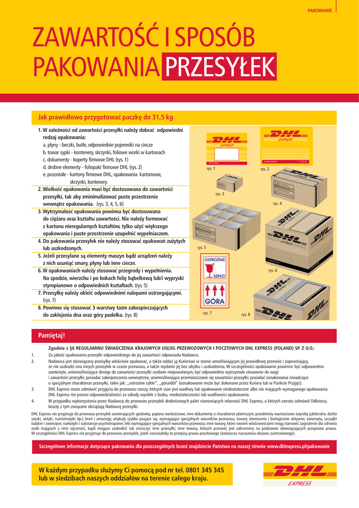 PAKOWANIE ZAWARTOŚĆ I SPOSÓB PAKOWANIA PRZESYŁEK Jak prawidłowo przygotować paczkę do 31,5 kg Proszę sprawdzić zgodność numeru koperty z zapisem na liście przewozowym SPRAWDZ DROG¢ SWOJEJ PRZESY¸KI FOLIOPAK EKSPRESOWY www.servisco.com.pl KOPERTA EKSPRESOWA rys. 1 rys. 2 S MAŁY (245x M ŚRED 235x105) NI (49 L DUŻY 5x235x210) (495x XL BARD 470x210) S MAŁY (245x 235x1 05) M ŚREDN I (495x 235x2 10) L DUŻY (495x 470x2 10) XL BARD ZO DUŻY (495x 470x4 20) rys. 3 ZO DU ŻY (49 5x47 0x42 0) rys. 4 ZO DU ŻY (49 5x47 X L (4 9 5 x4 7 0 x4 2 0 ) S MAŁY (245x M ŚRED 235x105) NI (49 L DUŻY 5x235x210) (495x XL BARD 470x210) 0x42 0) rys. 5 XL (4 95x470 x420) (4 XL x42 470 95x 0) L (4 9 5 x4 7 0 x4 2 0 ) rys. 6 X 1. W zależności od zawartości przesyłki należy dobrać odpowiedni rodzaj opakowania: a. płyny - beczki, butle, odpowiednie pojemniki na ciecze b. towar sypki - kontenery, skrzynki, foliowe worki w kartonach c. dokumenty - koperty firmowe DHL (rys. 1) d. drobne elementy - foliopaki firmowe DHL (rys. 2) e. pozostałe - kartony firmowe DHL, opakowania kartonowe, skrzynki, kontenery. 2. Wielkość opakowania musi być dostosowana do zawartości przesyłki, tak aby zminimalizować puste przestrzenie wewnątrz opakowania. (rys. 3, 4, 5, 6) 3. Wytrzymałość opakowania powinna być dostosowana do ciężaru oraz kształtu zawartości. Nie należy formować z kartonu nieregularnych kształtów, tylko użyć większego opakowania i puste przestrzenie uzupełnić wypełniaczem. 4. Do pakowania przesyłek nie należy stosować opakowań zużytych lub uszkodzonych. 5. Jeżeli przesyłane są elementy maszyn bądź urządzeń należy z nich usuniąć smary, płyny lub inne ciecze. 6. W opakowaniach należy stosować przegrody i wypełnienia. Na spodzie, wierzchu i po bokach folię bąbelkową lub/i wypryski styropianowe o odpowiednich kształtach. (rys. 5) 7. Przesyłkę należy okleić odpowiednimi nalepami ostrzegającymi. (rys. 7) 8. Powinno się stosować 3 warstwy taśm zabezpieczających do zaklejenia dna oraz góry pudełka. (rys. 8) rys. 7 rys. 8 Pamiętaj! Zgodnie z §6 REGULAMINU ŚWIADCZENIA KRAJOWYCH USŁUG PRZEWOZOWYCH I POCZTOWYCH DHL EXPRESS (POLAND) SP. Z O.O.: 1. 2. 3. 4. Za jakość opakowania przesyłki odpowiedniego do jej zawartości odpowiada Nadawca. Nadawca jest obowiązany przesyłkę właściwie opakować, a także oddać ją Kurierowi w stanie umożliwiającym jej prawidłowy przewóz i zapewniający, że nie uszkodzi ona innych przesyłek w czasie przewozu, a także wydanie jej bez ubytku i uszkodzenia. W szczególności opakowanie powinno: być odpowiednio zamknięte, uniemożliwiające dostęp do zawartości przesyłki osobom niepowołanym; być odpowiednio wytrzymałe stosownie do wagi i zawartości przesyłki; posiadać zabezpieczenia wewnętrzne, uniemożliwiające przemieszczanie się zawartości przesyłki; posiadać oznakowania świadczące o specjalnym charakterze przesyłki, takie jak: „ostrożnie szkło”, „góra/dół” (oznakowanie może być dokonane przez Kuriera lub w Punkcie Przyjęć). DHL Express może odmówić przyjęcia do przewozu rzeczy, których stan jest wadliwy lub opakowanie niedostateczne albo nie mających wymaganego opakowania. DHL Express nie ponosi odpowiedzialności za szkody wynikłe z braku, niedostateczności lub wadliwości opakowania. W przypadku wykorzystania przez Nadawcę do przewozu przesyłek drobnicowych palet stanowiących własność DHL Express, a których zwrotu odmówił Odbiorca, koszty z tym związane obciążają Nadawcę przesyłki. DHL Express nie przyjmuje do przewozu przesyłek zawierających: gotówkę, papiery wartościowe, inne dokumenty o charakterze płatniczym; przedmioty wartościowe (wyroby jubilerskie, dzieła sztuki, antyki, numizmatyki itp.); broń i amunicję; artykuły szybko psujące się, wymagające specjalnych warunków przewozu; towary chemicznie i biologicznie aktywne; zwierzęta, szczątki ludzkie i zwierzęce; narkotyki i substancje psychotropowe; leki wymagające specjalnych warunków przewozu; inne towary, które swoimi właściwościami mogą stanowić zagrożenie dla zdrowia osób mających z nimi styczność, bądź mogące uszkodzić lub zniszczyć inne przesyłki; inne towary, których przewóz jest zabroniony na podstawie obowiązujących przepisów prawa. W szczególności DHL Express nie przyjmuje do przewozu przesyłek, jeżeli naruszałoby to przepisy prawa pocztowego (zwłaszcza naruszenia obszaru zastrzeżonego). Szczegółowe informacje dotyczące pakowania dla poszczególnych branż znajdziecie Państwo na naszej stronie www.dhlexpress.pl/pakowanie W każdym przypadku służymy Ci pomocą pod nr tel. 0801 345 345 lub w siedzibach naszych oddziałów na terenie całego kraju. PAKOWANIE JAK PRAWIDŁOWO PRZYGOTOWAĆ PRZESYŁKĘ DROBNICOWĄ Jak prawidłowo przygotować przesyłki zawierające elementy powyżej 31,5 kg 800 mm rys. 1 144 mm 1200 mm rys. 2 rys. 3 TAK NIE rys. 4 rys. 5 wys. maks. 2100 mm 1. Do transportu przyjmowane są wyłącznie palety nieuszkodzone (preferowne są palety EURO lub identyczne wymiarowo i jakościowo). (rys. 1) 2. Przesyłka powinna być trwale umocowana do palety przy pomocy folii stretch i/lub taśm bindujących. (rys. 2) 3. Przesyłka powinna być zafoliowana min. trzykrotnie folią stretch ze wszystkich stron (również z góry).Wskazane firmowe taśmy zabezpieczające. 4. Elementy przesyłki nie mogą wystawać poza obręb palety. Jeśli jakaś część przesyłki nietypowej wystaje poza obrys palety musi być bezwzględnie tak opakowana, by nie mogła sama zostać uszkodzona i/lub uszkodzić innej przesyłki. (rys. 3) 5. Elementy (np. kartony) lżejsze przesyłki powinny być układane na elementach ciężkich. 6. Środek ciężkości przesyłki należy zlokalizować centralnie. 7.Wszystkie naroża przesyłki należy zabezpieczyć tekturowymi narożnikami. (rys. 4) 8. Maksymalna wysokość przesyłki wynosi do 2100 mm (pr