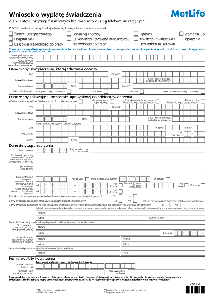 Wniosek o wypłatę świadczenia dla klientów instytucji finansowych lub dostawców usług telekomunikacyjnych z tytułu (należy zaznaczyć rodzaj zdarzenia, którego dotyczy niniejszy wniosek) Śmierci Ubezpieczonego Hospitalizacji Czasowej niezdolności do pracy Poważnej choroby Całkowitego i trwałego inwalidztwa / Niezdolności do pracy Złamania lub oparzenia Operacji Trwałego inwalidztwa / Uszczerbku na zdrowiu Towarzystwo umożliwia zgłoszenie roszczenia w formie kopii lub skanu, jednocześnie zastrzega sobie prawo do żądania oryginalnych dokumentów lub oryginalnie poświadczonych kopii dokumentów. Numer polisy/pożyczki/ karty kredytowej/umowy Nazwa instytucji finansowej/dostawcy usług telekomunikacyjnych Dane osoby ubezpieczonej, której zdarzenie dotyczy Imię Nazwisko Seria i numer dowodu osobistego / paszportu1) Nazwisko rodowe Data urodzenia Zdarzenie dotyczy2): D D M M R R R R Zawód1) PESEL Ubezpieczonego Głównego Małżonka Partnera Dziecka Ubezpieczonego Głównego Dane osoby zgłaszającej roszczenie, uprawnionej do odbioru świadczenia W jakim charakterze zgłasza Pan/i roszczenie2)? Uprawnionego / Uposażonego Ubezpieczonego Imię Przedstawiciela Ustawowego Uprawnionego / Uposażonego Pełnomocnika Uprawnionego / Uposażonego3) Nazwisko Nazwisko rodowe Data urodzenia D D M M R R R R Seria i numer dowodu osobistego / paszportu PESEL Adres korespondencyjny w sprawie roszczenia Ulica Nr domu Nr lokalu Kod pocztowy Miejscowość – E-mail Telefon Dane dotyczące zdarzenia Data zdarzenia D D M M R R R R Miejsce zdarzenia (nazwa, adres) Okoliczności, przebieg zdarzenia, opis obrażeń odniesionych w wypadku lub rozpoznanie choroby Opis obecnego stanu zdrowia Data wystąpienia Nie dotyczy Data rozpoznania choroby pierwszych D D M M R R R R objawów choroby Nie Okres zwolnienia lekarskiego od D D M M R R R R do D D M M R R R R dotyczy Okres całkowitej / Nie czasowej niezdolności od D D M M R R R R do D D M M R R R R dotyczy do pracy4) Czy zdarzenie nastąpiło po spożyciu alkoholu, narkotyków lub innych substancji toksycznych? Tak Czy w związku ze zdarzeniem pracodawca sporządził protokół powypadkowy? D D M M R R R R Data zakończenia leczenia i rehabilitacji Nie dotyczy D D M M R R R R Nie dotyczy W trakcie Nie Tak Nie Jeśli tak, prosimy o załączenie kopii protokołu powypadkowego. Czy w związku ze zdarzeniem na miejscu wypadku była obecna policja lub czy policja, prokuratura lub sąd prowadziły lub prowadzą postępowanie? Nie Tak Jeśli tak, prosimy o przesłanie kopii dokumentacji w sprawie, a w przypadku jej braku wskazanie pełnego adresu jednostek prowadzących postępowanie oraz sygnatury akt sprawy. Nazwa Numer sprawy Adres Dane placówek medycznych, w których prowadzono leczenie w związku ze zdarzeniem. Pierwsza pomoc Nazwa medyczna (nazwa, adres placówki, data ) Adres Pozostałe adresy placówek, w których prowadzono leczenie Okres: od Nazwa Nazwa Adres Adres D D M M R R R R Dane placówki podstawowej opieki zdrowotnej (lekarz rodzinny). Nazwa Adres Forma wypłaty świadczenia Przelew na wskazany numer rachunku bankowego Numer rachunku bankowego Nazwisko i imię właściciela rachunku Adres właściciela rachunku Rekomendujemy powyższą formę wypłaty ze względu na szybkość i bezpieczeństwo realizacji świadczenia. W przypadku braku wskazania formy wypłaty świadczenia środki zostaną wypłacone przekazem pocztowym na adres do korespondencji w sprawie roszczenia podany w niniejszym formularzu. 2016 FO 1) 2) Nie dotyczy w przypadku śmierci. Właściwe zaznaczyć. 3) 4) Należy dołączyć dokument pełnomocnictwa. Niepotrzebne skreślić. Oświadczenia Przyjmuję do wiadomości, że MetLife TUnŻiR S.A. przetwarzać będzie moje dane osobowe na podstawie przepisów Ustawy o działalności ubezpieczeniowej i reasekuracyjnej oraz Ustawy o przeciwdziałaniu praniu pieniędzy oraz finansowaniu terroryzmu w celu wykonania obowiązków wynikających z ich treści. Wyrażam zgodę na przekazywanie mi drogą elektroniczną na podany przeze mnie numer telefonu i adres e-mail informacji związanych z wykonaniem zawartej umowy ubezpieczenia, w szczególności dotyczących zgłoszonych roszczeń. Tak Nie Jestem świadomy/a, iż podanie moich danych osobowych jest dobrowolne, oraz że mam prawo wglądu do moich danych osobowych oraz prawo ich poprawiania. Świadomy/a odpowiedzialności karnej za składanie fałszywych zeznań wynikającej z art. 233 k.k. oświadczam, że przesłane przeze mnie kopie dokumentów są zgodne z oryginałami, które posiadam, a informacje i odpowiedzi na pytania zawarte na 1 i 2 stronie formularza są prawdziwe i zgodne ze stanem faktycznym. W razie poświadczenia nieprawdy zobowiązuję się zwrócić otrzymane świadczenie w terminie 14 dni od daty wezwania przez Towarzystwo. Zostałem/am poinformowany/a przez MetLife TUnŻiR S.A., że wszelkie reklamacje wynikające z umowy ubezpieczenia winny być przesyłane do Towarzystwa pisemnie, elektronicznie na adres e-mail wskazany przez Towarzystwo, telefonicznie na numer wskazany przez Towarzystwo (do protokołu) lub osobiście w siedzibie Towarzystwa lub Agencji MetLife (do protokołu). W przypadku zaś nieuznania reklamacji przez Towarzystwo, organem właściwym do rozpatrzenia reklamacji jest Miejski i Powiatowy Rzecznik Konsumenta, Rzecznik Finansowy, Komisja Nadzoru Finansowego lub istnieje możliwość wystąpienia z powództwem do sądu powszechnego. Reklamacje Klientów będących osobami fizycznymi rozpatrywane są w ciągu 30 dni od dnia ich otrzymania przez Towarzystwo. W sprawach szczególnie skomplikowanych wspomniany powyżej termin może ulec wydłużeniu maksymalnie do 60 dni, o czym osoba składająca reklamację zostanie poinformowana. Polityka rozpatrywania reklamacji jest dostępna na stronie internetowej Towarzystwa www.metlife.pl. Oświadczenie osoby ubezpieczonej, której zdarzenie dotyczy Upoważniam każdego lekarza, personel medyczny, 