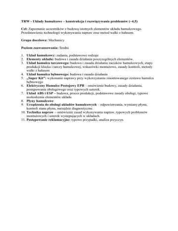 TRW - Układy hamulcowe – konstrukcja i rozwiązywanie problemów (~4,5) Cel: Zapoznanie uczestników z budową istotnych elementów układu hamulcowego. Przedstawienie technologii wykonywania napraw oraz metod walki z hałasem. Grupa docelowa: Mechanicy Poziom zaawansowania: Średni 1. Układ hamulcowy: zadania, podstawowe rodzaje 2. Elementy układu: budowa i zasada działania poszczególnych elementów. 3. Układ hamulca tarczowego: budowa i zasada działania zacisków hamulcowych, etapy produkcji klocka i tarczy hamulcowej, wskazówki montażowe, zasady kontroli, metody walki z hałasem 4. Układ hamulca bębnowego: budowa i zasada działania 5. „Super Kit”: wykonanie naprawy przy wykorzystaniu zmontowanego zestawu hamulca bębnowego 6. Elektryczny Hamulce Postojowy EPB – omówienie budowy, zasady działania, postępowania obsługowego oraz typowych usterek. 7. Układ ABS i ESP – budowa, proces produkcji, podstawowe zasady obsługi, typowe uszkodzenia elementów układu 8. Płyny hamulcowe 9. Urządzenia do obsługi układów hamulcowych – odpowietrzania, wymiany płynu, kontroli stanu płynu, narzędzie diagnostyczne. 10. Technika napraw – omówienie zasad wykonywania napraw, typowych problemów montażowych i usterek występujących w układach. 11. Postępowanie reklamacyjne: typowe przypadki, analiza przyczyn.