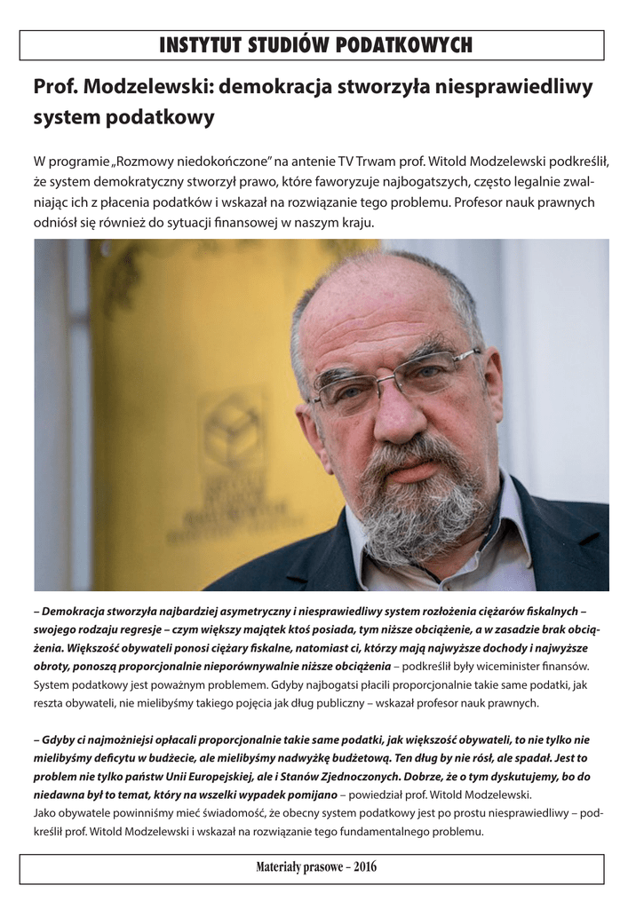 INSTYTUT STUDIÓW PODATKOWYCH Prof. Modzelewski: demokracja stworzyła niesprawiedliwy system podatkowy W programie „Rozmowy niedokończone” na antenie TV Trwam prof. Witold Modzelewski podkreślił, że system demokratyczny stworzył prawo, które faworyzuje najbogatszych, często legalnie zwalniając ich z płacenia podatków i wskazał na rozwiązanie tego problemu. Profesor nauk prawnych odniósł się również do sytuacji finansowej w naszym kraju. – Demokracja stworzyła najbardziej asymetryczny i niesprawiedliwy system rozłożenia ciężarów fiskalnych – swojego rodzaju regresje – czym większy majątek ktoś posiada, tym niższe obciążenie, a w zasadzie brak obciążenia. Większość obywateli ponosi ciężary fiskalne, natomiast ci, którzy mają najwyższe dochody i najwyższe obroty, ponoszą proporcjonalnie nieporównywalnie niższe obciążenia – podkreślił były wiceminister finansów. System podatkowy jest poważnym problemem. Gdyby najbogatsi płacili proporcjonalnie takie same podatki, jak reszta obywateli, nie mielibyśmy takiego pojęcia jak dług publiczny – wskazał profesor nauk prawnych. – Gdyby ci najmożniejsi opłacali proporcjonalnie takie same podatki, jak większość obywateli, to nie tylko nie mielibyśmy deficytu w budżecie, ale mielibyśmy nadwyżkę budżetową. Ten dług by nie rósł, ale spadał. Jest to problem nie tylko państw Unii Europejskiej, ale i Stanów Zjednoczonych. Dobrze, że o tym dyskutujemy, bo do niedawna był to temat, który na wszelki wypadek pomijano – powiedział prof. Witold Modzelewski. Jako obywatele powinniśmy mieć świadomość, że obecny system podatkowy jest po prostu niesprawiedliwy – podkreślił prof. Witold Modzelewski i wskazał na rozwiązanie tego fundamentalnego problemu. Materia³y prasowe – 2016 INSTYTUT STUDIÓW PODATKOWYCH – Jeżeli my się z takim prawem nie zgadzamy i chcemy przestać zwiększać swoje zadłużenie, to musimy znaleźć te pieniądze tam, gdzie są one niepłacone, a nie tam, gdzie są one płacone. Musimy więc zawrzeć pewien sojusz. Dostrzegam pewną wolę klasy politycznej, by rozwiązać ten problem. Musimy jednak pamiętać, że z tego rodzaju siłą, za którą stoją różnego rodzaju koncerny, politycy są bardzo słabi. Dlatego politycy muszą mieć bardzo silne wsparcie obywateli, bo tylko z obywateli mogą czerpać siłę. Jeżeli będą w tym sporze sami, będą na przegranej pozycji – podkreślił były wiceminister finansów. Władza na świecie wchodzi w jakiś dziwny sojusz, bo akceptuje ona tworzenie prawa, które pozwala na niepłacenie podatków – wskazał profesor. Ktoś to prawo napisał, przeszło ono formalne procedury i na końcu się okazało, że nikt nie powiedział obywatelom, że takie prawo jest tworzone. Ci, którzy wiedzieli do kogo jest to prawo adresowane, potrafili z tego korzystać – powiedział prof. Modzelewski i dodał, że takie działanie zostało nazwane międzynarodowym biznesem podatkowym. – Biznes podatkowy polega na tym, że jest jakaś działalność gospodarcza na ogromną skalę, której zapewnia się niepłacenie podatków. Liberałowie często mówią, że podatki stały się w demokracji towarem – można kupić niepłacenie podatków. Zatem podatki są też towarem. Skoro podatki są towarem, to i prawo jest towarem, bo podatki to prawo. Idąc tym tropem, również władza jest towarem. Można nie płacić podatków, ale to kosztuje, bo kosztuje ustawa, stworzenie jakiegoś wehikułu optymalizacyjnego, czyli stworu, który tylko po to został wymyślony, żeby można było ukryć dochody. Problem więc bardziej ma charakter politologiczny, niż prawny – zaznaczył profesor nauk prawnych. Program „Rodzina 500 plus”, obniżenie wieku emerytalnego, podwyższenie kwoty wolnej od podatku, obniżenie podatku CIT – to tylko niektóre programy bądź projekty, które wprowadził bądź zamierza wprowadzić obecny rząd. Jak podkreślił prof. Modzelewski, pieniądze na tego typu projekty są, ale należy zmienić złe i niesprawiedliwe prawo. – Wcale nie trzeba podwyższać podatków. Trzeba tylko rozłożyć ich ciężar w ten sposób, aby każdy świadczył na rzecz dobra publicznego. Wtedy byśmy mieli pieniądze na wszystko. To nie jest tak, że my nie mamy pieniędzy, bo je mamy, ale te pieniądze są legalnie niepobrane. Zostało zalegalizowane złe prawo, które ktoś stworzył, według którego można legalnie nie płacić podatków – podkreślił wiceminister finansów. Profesor odniósł się również do programu „Rodzina 500 plus” i podkreślił, że nie jest to polityka socjalna, ale demograficzna. – Państwa tzw. Starej Europy już dawno podjęły działania, które mają na celu wspieranie rodzin, chcących mieć i wychowywać dzieci. Nikt nie miał wątpliwości, że to kosztuje, ale dokonano tego. W Polsce dopiero dzisiaj zauważyliśmy, że program „Rodzina 500 plus” to nie jest polityka socjalna, chociaż ma wymiar socjalny, ale jest to polityka demograficzna. Osoby, które posiadają dzieci są pod szczególną ochroną państwa – zaznaczył prof. Witold Modzelewski. Cały program Rozmowy Niedokończone można zobaczyć : http://www.radiomaryja.pl/multimedia/ciezary-fiskalne-a-dobro-publiczne Materia³y prasowe – 2016
