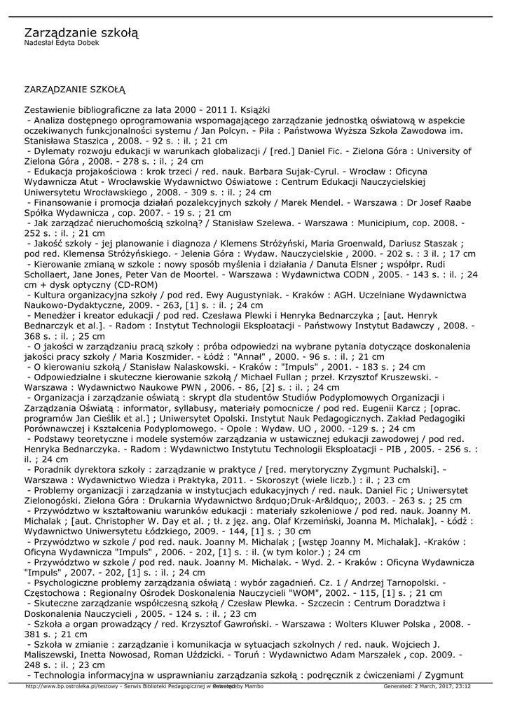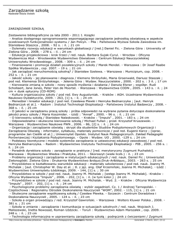 Zarządzanie szkołą Nadesłał Edyta Dobek ZARZĄDZANIE SZKOŁĄ Zestawienie bibliograficzne za lata 2000 - 2011 I. Książki - Analiza dostępnego oprogramowania wspomagającego zarządzanie jednostką oświatową w aspekcie oczekiwanych funkcjonalności systemu / Jan Polcyn. - Piła : Państwowa Wyższa Szkoła Zawodowa im. Stanisława Staszica , 2008. - 92 s. : il. ; 21 cm - Dylematy rozwoju edukacji w warunkach globalizacji / [red.] Daniel Fic. - Zielona Góra : University of Zielona Góra , 2008. - 278 s. : il. ; 24 cm - Edukacja projakościowa : krok trzeci / red. nauk. Barbara Sujak-Cyrul. - Wrocław : Oficyna Wydawnicza Atut - Wrocławskie Wydawnictwo Oświatowe : Centrum Edukacji Nauczycielskiej Uniwersytetu Wrocławskiego , 2008. - 309 s. : il. ; 24 cm - Finansowanie i promocja działań pozalekcyjnych szkoły / Marek Mendel. - Warszawa : Dr Josef Raabe Spółka Wydawnicza , cop. 2007. - 19 s. ; 21 cm - Jak zarządzać nieruchomością szkolną? / Stanisław Szelewa. - Warszawa : Municipium, cop. 2008. 252 s. : il. ; 21 cm - Jakość szkoły - jej planowanie i diagnoza / Klemens Stróżyński, Maria Groenwald, Dariusz Staszak ; pod red. Klemensa Stróżyńskiego. - Jelenia Góra : Wydaw. Nauczycielskie , 2000. - 202 s. : 3 il. ; 17 cm - Kierowanie zmianą w szkole : nowy sposób myślenia i działania / Danuta Elsner ; współpr. Rudi Schollaert, Jane Jones, Peter Van de Moortel. - Warszawa : Wydawnictwa CODN , 2005. - 143 s. : il. ; 24 cm + dysk optyczny (CD-ROM) - Kultura organizacyjna szkoły / pod red. Ewy Augustyniak. - Kraków : AGH. Uczelniane Wydawnictwa Naukowo-Dydaktyczne, 2009. - 263, [1] s. : il. ; 24 cm - Menedżer i kreator edukacji / pod red. Czesława Plewki i Henryka Bednarczyka ; [aut. Henryk Bednarczyk et al.]. - Radom : Instytut Technologii Eksploatacji - Państwowy Instytut Badawczy , 2008. 368 s. : il. ; 25 cm - O jakości w zarządzaniu pracą szkoły : próba odpowiedzi na wybrane pytania dotyczące doskonalenia jakości pracy szkoły / Maria Koszmider. - Łódź : "Annał" , 2000. - 96 s. : il. ; 21 cm - O kierowaniu szkołą / Stanisław Nalaskowski. - Kraków : "Impuls" , 2001. - 183 s. ; 24 cm - Odpowiedzialne i skuteczne kierowanie szkołą / Michael Fullan ; przeł. Krzysztof Kruszewski. Warszawa : Wydawnictwo Naukowe PWN , 2006. - 86, [2] s. : il. ; 24 cm - Organizacja i zarządzanie oświatą : skrypt dla studentów Studiów Podyplomowych Organizacji i Zarządzania Oświatą : informator, syllabusy, materiały pomocnicze / pod red. Eugenii Karcz ; [oprac. programów Jan Cieślik et al.] ; Uniwersytet Opolski. Instytut Nauk Pedagogicznych. Zakład Pedagogiki Porównawczej i Kształcenia Podyplomowego. - Opole : Wydaw. UO , 2000. -129 s. ; 24 cm - Podstawy teoretyczne i modele systemów zarządzania w ustawicznej edukacji zawodowej / pod red. Henryka Bednarczyka. - Radom : Wydawnictwo Instytutu Technologii Eksploatacji - PIB , 2005. - 256 s. : il. ; 24 cm - Poradnik dyrektora szkoły : zarządzanie w praktyce / [red. merytoryczny Zygmunt Puchalski]. Warszawa : Wydawnictwo Wiedza i Praktyka, 2011. - Skoroszyt (wiele liczb.) : il. ; 23 cm - Problemy organizacji i zarządzania w instytucjach edukacyjnych / red. nauk. Daniel Fic ; Uniwersytet Zielonogóski. Zielona Góra : Drukarnia Wydawnictwo ”Druk-Ar“, 2003. - 263 s. ; 25 cm - Przywództwo w kształtowaniu warunków edukacji : materiały szkoleniowe / pod red. nauk. Joanny M. Michalak ; [aut. Christopher W. Day et al. ; tł. z jęz. ang. Olaf Krzemiński, Joanna M. Michalak]. - Łódź : Wydawnictwo Uniwersytetu Łódzkiego, 2009. - 144, [1] s. ; 30 cm - Przywództwo w szkole / pod red. nauk. Joanny M. Michalak ; [wstęp Joanny M. Michalak]. -Kraków : Oficyna Wydawnicza "Impuls" , 2006. - 202, [1] s. : il. (w tym kolor.) ; 24 cm - Przywództwo w szkole / pod red. nauk. Joanny M. Michalak. - Wyd. 2. - Kraków : Oficyna Wydawnicza "Impuls" , 2007. - 202, [1] s. : il. ; 24 cm - Psychologiczne problemy zarządzania oświatą : wybór zagadnień. Cz. 1 / Andrzej Tarnopolski. Częstochowa : Regionalny Ośrodek Doskonalenia Nauczycieli "WOM", 2002. - 115, [1] s. ; 21 cm - Skuteczne zarządzanie współczesną szkołą / Czesław Plewka. - Szczecin : Centrum Doradztwa i Doskonalenia Nauczycieli , 2005. - 124 s. : il. ; 23 cm - Szkoła a organ prowadzący / red. Krzysztof Gawroński. - Warszawa : Wolters Kluwer Polska , 2008. 381 s. ; 21 cm - Szkoła w zmianie : zarządzanie i komunikacja w sytuacjach szkolnych / red. nauk. Wojciech J. Maliszewski, Inetta Nowosad, Roman Uździcki. - Toruń : Wydawnictwo Adam Marszałek , cop. 2009. 248 s. : il. ; 23 cm - Technologia informacyjna w usprawnianiu zarządzania szkołą : podręcznik z ćwiczeniami / Zygmunt http://www.bp.ostroleka.pl/testowy - Serwis Biblioteki Pedagogicznej w Ostrołęce Powered by Mambo Generated: 2 March, 2017, 23:12 Apiecionek ; pod red. Janusza Trawki ; Akademia Ekonomiczna im. Karola Adamieckiego. Kolegium Zarządzania. -Katowice : AE. KZ , 2000. - 71, 33 s. : il. ; 25 cm - Wielowymiarowość zarządzania i komunikacji społecznej w szkole / pod red. Kazimierza Czerwińskiego, Jana Kubiczka, Barbary Kutrowskiej. - Toruń : Wydawnictwo Adam Marszałek, 2010. - 436 s. : il. ; 23 cm - Zarys teorii i praktyki organizacji i kierowania procesem dydaktyczno-wychowawczym / Henryk Budzeń ; Politechnika Radomska im. Kazimierza Pułaskiego. - Radom : PR , 2001. - 205 s. ; 20 cm - Zarządzanie kompetencjami w jednostkach oświaty : aspekty empiryczne i teoretyczne / Sylwia Domagalska. - Dąbrowa Górnicza : Wyższa Szkoła Biznesu, 2009. - 152 s. ; 24 cm - Zarządzanie personelem nauczycielskim w oświacie / Katarzyna Piwowar-Sulej. - Warszawa ; Kraków : Wolters Kluwer Polska , 2009. - 203 s. : il. ; 21 cm - Zarządzanie placówką oświatową / Krzysztof Gawroński, Arkadiusz Stefan. - Wyd. 2. -Warszawa : Dom Wydawniczy ABC. Wolters Kluwer Polska , 2006. - 335 s. ; 21 cm + dysk optyczny (CD-ROM) - Zarządzanie placówką oświatową / Krzysz