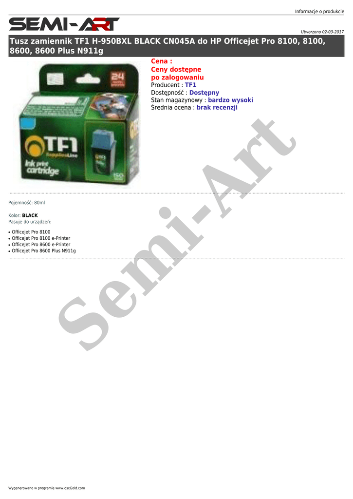 Informacje o produkcie Utworzono 02-03-2017 Tusz zamiennik TF1 H-950BXL BLACK CN045A do HP Officejet Pro 8100, 8100, 8600, 8600 Plus N911g Cena : Ceny dostępne po zalogowaniu Ar t Producent : TF1 Dostępność : Dostępny Stan magazynowy : bardzo wysoki Średnia ocena : brak recenzji Pojemność: 80ml ● ● Se ● Officejet Pro 8100 Officejet Pro 8100 e-Printer OfficeJet Pro 8600 e-Printer Officejet Pro 8600 Plus N911g m ● i- Kolor: BLACK Pasuje do urządzeń: Wygenerowano w programie www.oscGold.com