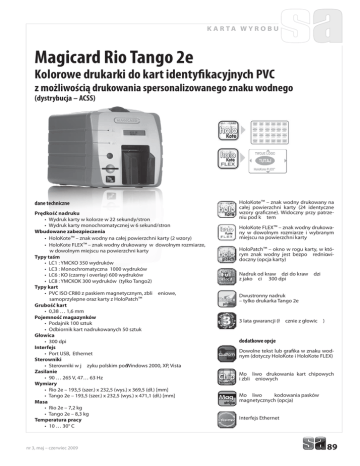k a r ta w y r o b u Magicard Rio Tango 2e Kolorowe drukarki do kart identyfikacyjnych PVC z możliwością drukowania spersonalizowanego znaku wodnego (dystrybucja – ACSS) dane techniczne Prędkość nadruku • Wydruk karty w kolorze w 22 sekundy/stronę • Wydruk karty monochromatycznej w 6 sekund/stronę Wbudowane zabezpieczenia • HoloKote™ – znak wodny na całej powierzchni karty (2 wzory) • HoloKote FLEX™ – znak wodny drukowany w dowolnym rozmiarze, w dowolnym miejscu na powierzchni karty Typy taśm • LC1 : YMCKO 350 wydruków • LC3 : Monochromatyczna 1000 wydruków • LC6 : KO (czarny i overlay) 600 wydruków • LC8 : YMCKOK 300 wydruków (tylko Tango2) Typy kart • PVC ISO CR80 z paskiem magnetycznym, zbli eniowe, samoprzylepne oraz karty z HoloPatch™ Grubość kart • 0,38 … 1,6 mm Pojemność magazynków • Podajnik 100 sztuk • Odbiornik kart nadrukowanych 50 sztuk Głowica • 300 dpi Interfejs • Port USB, Ethernet Sterowniki • Sterowniki w języku polskim podWindows 2000, XP, Vista Zasilanie • 90 … 265 V, 47… 63 Hz Wymiary • Rio 2e – 193,5 (szer.) x 232,5 (wys.) x 369,5 (dł.) [mm] • Tango 2e – 193,5 (szer.) x 232,5 (wys.) x 471,1 (dł.) [mm] Masa • Rio 2e – 7,2 kg • Tango 2e – 8,3 kg Temperatura pracy • 10 … 30° C nr 3, maj – czerwiec 2009 HoloKote™ – znak wodny drukowany na całej powierzchni karty (24 identyczne wzory graficzne). Widoczny przy patrzeniu pod k tem HoloKote FLEX™ – znak wodny drukowany w dowolnym rozmiarze i wybranym miejscu na powierzchni karty HoloPatch™ – okno w rogu karty, w którym znak wodny jest bezpo redniowidoczny (opcja karty) Nadruk od krawędzi do krawędzi z jako ci 300 dpi Dwustronny nadruk – tylko drukarka Tango 2e 3 lata gwarancji (ł cznie z głowic ) dodatkowe opcje Dowolne tekst lub grafika w znaku wodnym (dotyczy HoloKote i HoloKote FLEX) Mo liwo drukowania kart chipowych i zbli eniowych Mo liwo kodowania pasków magnetycznych (opcja) Interfejs Ethernet 89