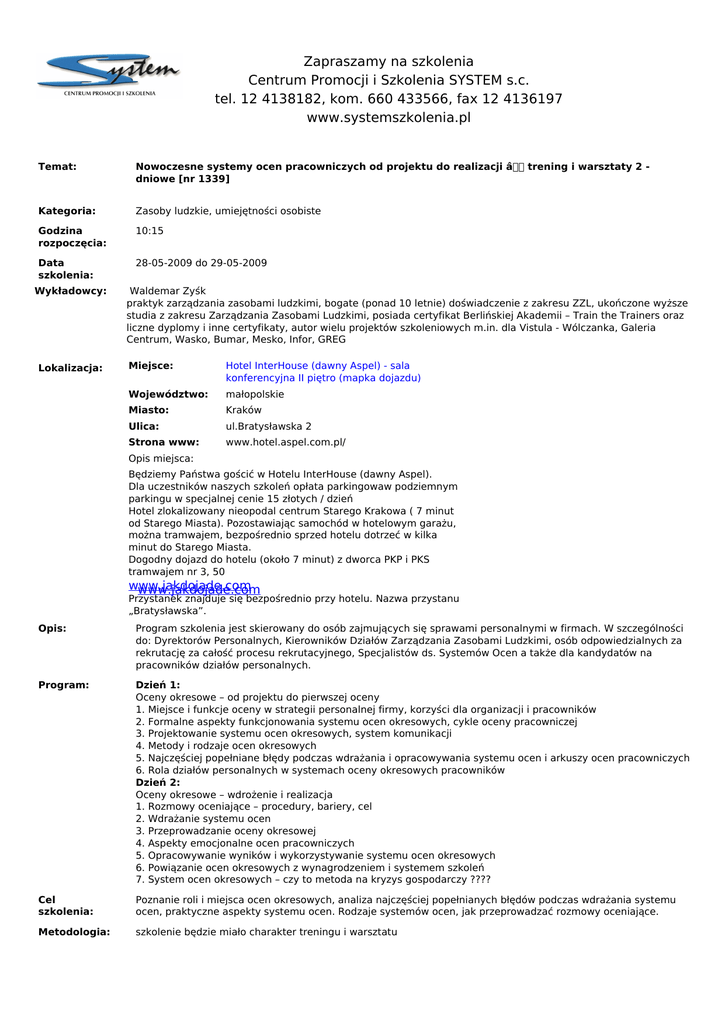 Zapraszamy na szkolenia Centrum Promocji i Szkolenia SYSTEM s.c. tel. 12 4138182, kom. 660 433566, fax 12 4136197 www.systemszkolenia.pl Temat: Nowoczesne systemy ocen pracowniczych od projektu do realizacji â trening i warsztaty 2 dniowe [nr 1339] Kategoria: Zasoby ludzkie, umiejętności osobiste Godzina rozpoczęcia: 10:15 Data szkolenia: 28-05-2009 do 29-05-2009 Wykładowcy: Lokalizacja: Waldemar WaldemarZyśk Zyśk praktyk praktykzarządzania zarządzaniazasobami zasobamiludzkimi, ludzkimi,bogate bogate(ponad (ponad10 10letnie) letnie)doświadczenie doświadczeniezzzakresu zakresuZZL, ZZL,ukończone ukończonewyższe wyższe studia studiazzzakresu zakresuZarządzania ZarządzaniaZasobami ZasobamiLudzkimi, Ludzkimi,posiada posiadacertyfikat certyfikatBerlińskiej BerlińskiejAkademii Akademii– –Train Trainthe theTrainers Trainersoraz oraz liczne licznedyplomy dyplomyi iinne innecertyfikaty, certyfikaty,autor autorwielu wieluprojektów projektówszkoleniowych szkoleniowychm.in. m.in.dla dlaVistula Vistula- -Wólczanka, Wólczanka,Galeria Galeria Centrum, Centrum,Wasko, Wasko,Bumar, Bumar,Mesko, Mesko,Infor, Infor,GREG GREG Miejsce: Miejsce: Hotel InterHouse (dawny Aspel) - sala Hotel InterHouse (dawny Aspel) - sala konferencyjna II piętro (mapka dojazdu) konferencyjna II piętro (mapka dojazdu) Województwo: Województwo: małopolskie małopolskie Miasto: Kraków Miasto: Kraków Ulica: ul.Bratysławska 22 Ulica: ul.Bratysławska Strona www: www.hotel.aspel.com.pl/ Strona www: www.hotel.aspel.com.pl/ Opis miejsca: Opis miejsca: Będziemy Państwa gościć ww Hotelu InterHouse (dawny Aspel). Będziemy Państwa gościć Hotelu InterHouse (dawny Aspel). Dla uczestników naszych szkoleń opłata parkingowaw podziemnym Dla uczestników naszych szkoleń opłata parkingowaw podziemnym parkingu ww specjalnej cenie 1515 złotych / dzień parkingu specjalnej cenie złotych / dzień Hotel zlokalizowany nieopodal centrum Starego Krakowa ( 7( 7 minut Hotel zlokalizowany nieopodal centrum Starego Krakowa minut odod Starego Miasta). Pozostawiając samochód w hotelowym garażu, Starego Miasta). Pozostawiając samochód w hotelowym garażu, można tramwajem, bezpośrednio sprzed hotelu dotrzeć ww kilka można tramwajem, bezpośrednio sprzed hotelu dotrzeć kilka minut do Starego Miasta. minut do Starego Miasta. Dogodny dojazd dodo hotelu (około 77 minut) z dworca PKP i PKS Dogodny dojazd hotelu (około minut) z dworca PKP i PKS tramwajem nr 3, 50 tramwajem nr 3, 50 www.jakdojade.com www.jakdojade.com Przystanek znajduje sięsię bezpośrednio przy hotelu. Nazwa przystanu Przystanek znajduje bezpośrednio przy hotelu. Nazwa przystanu „Bratysławska”. „Bratysławska”. Opis: Program szkolenia jest skierowany do osób zajmujących się sprawami personalnymi w firmach. W szczególności do: Dyrektorów Personalnych, Kierowników Działów Zarządzania Zasobami Ludzkimi, osób odpowiedzialnych za rekrutację za całość procesu rekrutacyjnego, Specjalistów ds. Systemów Ocen a także dla kandydatów na pracowników działów personalnych. Program: Dzień 1: Oceny okresowe – od projektu do pierwszej oceny 1. Miejsce i funkcje oceny w strategii personalnej firmy, korzyści dla organizacji i pracowników 2. Formalne aspekty funkcjonowania systemu ocen okresowych, cykle oceny pracowniczej 3. Projektowanie systemu ocen okresowych, system komunikacji 4. Metody i rodzaje ocen okresowych 5. Najczęściej popełniane błędy podczas wdrażania i opracowywania systemu ocen i arkuszy ocen pracowniczych 6. Rola działów personalnych w systemach oceny okresowych pracowników Dzień 2: Oceny okresowe – wdrożenie i realizacja 1. Rozmowy oceniające – procedury, bariery, cel 2. Wdrażanie systemu ocen 3. Przeprowadzanie oceny okresowej 4. Aspekty emocjonalne ocen pracowniczych 5. Opracowywanie wyników i wykorzystywanie systemu ocen okresowych 6. Powiązanie ocen okresowych z wynagrodzeniem i systemem szkoleń 7. System ocen okresowych – czy to metoda na kryzys gospodarczy ???? Cel szkolenia: Poznanie roli i miejsca ocen okresowych, analiza najczęściej popełnianych błędów podczas wdrażania systemu ocen, praktyczne aspekty systemu ocen. Rodzaje systemów ocen, jak przeprowadzać rozmowy oceniające. Metodologia: szkolenie będzie miało charakter treningu i warsztatu Certyfikaty: Cena: Cena zawiera: Warunki uczestnictwa: tak Liczba osób z jednej firmy Cena jedna osoba z firmy 780.00 netto zł./osobę (959.40 zł. brutto) dwie i więcej 730.00 netto zł./osobę (897.90 zł. brutto) materiały szkoleniowe, poczęstunek w przerwie kawowej, lunch, imienne zaświadczenie uczestnictwa Zgłoszenia uczestnictwa można dokonać przez: - formularz elektroniczny na WWW (zalecane) - telefonicznie - pisemnie, faksem - przez e-mail • Ogólna „Karta zgłoszenia na szkolenie” jest także dostępna na naszej stronie [Dokumenty do pobrania] • Zgłoszenie traktujemy jako potwierdzenie uczestnictwa w szkoleniu • Ewentualnych rezygnacji z udziału w szkoleniu prosimy dokonywać wyłącznie pisemnie (faksem lub pocztą elektroniczną) najpóźniej na trzy dni robocze przed terminem jego rozpoczęcia • Rezygnacja w terminie późniejszym lub nieobecność na szkoleniu wiąże się z koniecznością dokonania opłaty w wysokości 100%. Centrum Promocji i Szkolenia SYSTEM s.c. ul. Wiarusa 11 lok. 1, 32-087 Zielonki Zgłoszenia przyjmujemy mailem: [email protected] lub [email protected] lub telefonicznie 12 4138182, kom. 660 433566, fax 12 4136197 www.systemszkolenia.pl Konto bankowe: BZ WBK S.A. 9 Oddział Kraków nr 35 1090 1665 0000 0001 1994 1539 Powered by TCPDF (www.tcpdf.org)
