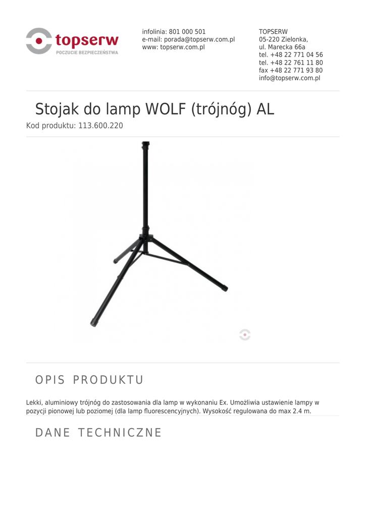 infolinia: 801 000 501 e-mail: [email protected] www: topserw.com.pl TOPSERW 05-220 Zielonka, ul. Marecka 66a tel. +48 22 771 04 56 tel. +48 22 761 11 80 fax +48 22 771 93 80 [email protected] Stojak do lamp WOLF (trójnóg) AL Kod produktu: 113.600.220 OPIS PRODUKTU Lekki, aluminiowy trójnóg do zastosowania dla lamp w wykonaniu Ex. Umożliwia ustawienie lampy w pozycji pionowej lub poziomej (dla lamp fluorescencyjnych). Wysokość regulowana do max 2.4 m. DANE TECHNICZNE