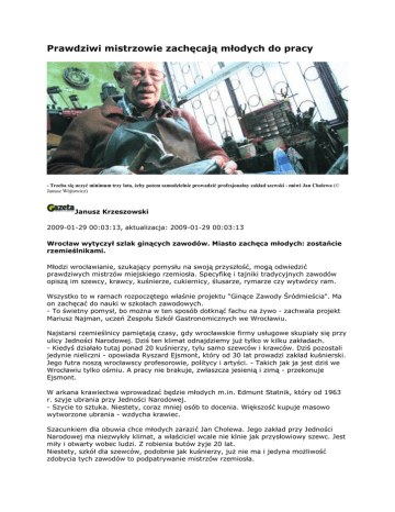 Prawdziwi mistrzowie zachęcają młodych do pracy - Trzeba się uczyć minimum trzy lata, Ŝeby potem samodzielnie prowadzić profesjonalny zakład szewski - mówi Jan Cholewa (© Janusz Wójtowicz) Janusz Krzeszowski 2009-01-29 00:03:13, aktualizacja: 2009-01-29 00:03:13 Wrocław wytyczył szlak ginących zawodów. Miasto zachęca młodych: zostańcie rzemieślnikami. Młodzi wrocławianie, szukający pomysłu na swoją przyszłość, mogą odwiedzić prawdziwych mistrzów miejskiego rzemiosła. Specyfikę i tajniki tradycyjnych zawodów opiszą im szewcy, krawcy, kuśnierze, cukiernicy, ślusarze, rymarze czy wytwórcy ram. Wszystko to w ramach rozpoczętego właśnie projektu "Ginące Zawody Śródmieścia". Ma on zachęcać do nauki w szkołach zawodowych. - To świetny pomysł, bo moŜna w ten sposób dotknąć fachu na Ŝywo - zachwala projekt Mariusz Najman, uczeń Zespołu Szkół Gastronomicznych we Wrocławiu. Najstarsi rzemieślnicy pamiętają czasy, gdy wrocławskie firmy usługowe skupiały się przy ulicy Jedności Narodowej. Dziś ten klimat odnajdziemy juŜ tylko w kilku zakładach. - Kiedyś działało tutaj ponad 20 kuśnierzy, tylu samo szewców i krawców. Dziś pozostali jedynie nieliczni - opowiada Ryszard Ejsmont, który od 30 lat prowadzi zakład kuśnierski. Jego futra noszą wrocławscy profesorowie, politycy i artyści. - Takich jak ja jest dziś we Wrocławiu tylko ośmiu. A pracy nie brakuje, zwłaszcza jesienią i zimą - przekonuje Ejsmont. W arkana krawiectwa wprowadzać będzie młodych m.in. Edmunt Statnik, który od 1963 r. szyje ubrania przy Jedności Narodowej. - Szycie to sztuka. Niestety, coraz mniej osób to docenia. Większość kupuje masowo wytworzone ubrania - wzdycha krawiec. Szacunkiem dla obuwia chce młodych zarazić Jan Cholewa. Jego zakład przy Jedności Narodowej ma niezwykły klimat, a właściciel wcale nie klnie jak przysłowiowy szewc. Jest miły i otwarty wobec ludzi. Z robienia butów Ŝyje 20 lat. Niestety, szkół dla szewców, podobnie jak kuśnierzy, juŜ nie ma i jedyna moŜliwość zdobycia tych zawodów to podpatrywanie mistrzów rzemiosła. - Trzeba się uczyć minimum trzy lata, Ŝeby potem samodzielnie prowadzić profesjonalny zakład szewski - mówi Jan Cholewa. Ze swojego fachu dumni są teŜ Jan i Lidia Cichutowie. Przejęli po rodzicach zakład oprawy obrazów i luster. Obrazy w wykonanych przez nich ramach wiszą m.in. we wrocławskich urzędach i kościołach. - W tym zawodzie człowiek uczy się całe Ŝycie. Do kaŜdego obrazu pasuje inna rama. Jak sukienka do kobiety - opowiada Lidia Cichuta. Zakłady rzemieślników, biorących udział we wrocławskim projekcie, moŜna zwiedzać równieŜ wirtualnie na stronie: www.ginacezawody.org. Oryginalny tekst moŜna znaleźć po adresem: http://polskatimes.pl/gazetawroclawska/fakty24/81519,prawdziwi-mistrzowie-zachecajamlodych-do-pracy,id,t.html