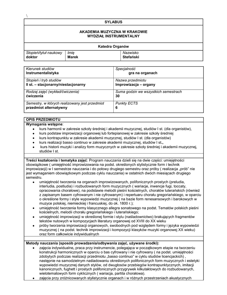 \ SYLABUS AKADEMIA MUZYCZNA W KRAKOWIE WYDZIAŁ INSTRUMENTALNY Katedra Organów Stopień/tytuł naukowy doktor Imię Marek Nazwisko Stefański Kierunek studiów Instrumentalistyka Specjalność gra na organach Stopień i tryb studiów II st. – stacjonarny/niestacjonarny Nazwa przedmiotu Improwizacja – organy Rodzaj zajęć (wykład/ćwiczenia) ćwiczenia Suma godzin we wszystkich semestrach 30 Semestry, w których realizowany jest przedmiot przedmiot alternatywny Punkty ECTS 6 OPIS PRZEDMIOTU Wymagania wstępne: kurs harmonii w zakresie szkoły średniej i akademii muzycznej, studiów I st. (dla organistów), kurs podstaw improwizacji organowej lub fortepianowej w zakresie szkoły średniej kurs kontrapunktu w zakresie akademii muzycznej, studiów I st. (dla organistów) kurs realizacji basso continuo w zakresie akademii muzycznej, studiów I st., kurs historii muzyki i analizy form muzycznych w zakresie szkoły średniej i akademii muzycznej, studiów I st. Treści kształcenia i tematyka zajęć: Program nauczania dzieli się na dwie części: umiejętności obowiązkowe ( umiejętność improwizowania na podst. określonych stylistycznie form i technik improwizacji) w I semestrze nauczania i do połowy drugiego semestru oraz próby ( realizacja „prób” nie jest wymaganiem obowiązkowym podczas cyklu nauczania) w ostatnich dwóch miesiącach drugiego semestru. umiejętność tworzenia na organach improwizowanych, polifonicznych prostych (preludia, interludia, postludia) i rozbudowanych form muzycznych ( wariacje, inwencje fugi, toccaty, opracowania chorałowe), na podstawie melodii pieśni kościelnych, chorałów luterańskich (również z zapisanym basem cyfrowanym i nie cyfrowanym) i repertuaru chorału gregoriańskiego, w oparciu o określone formy i style wypowiedzi muzycznej ( na bazie form renesansowych i barokowych w muzyce polskiej, niemieckiej i francuskiej, do ok. 1800 r.); umiejętność tworzenia formy klasycznego allegra sonatowego na podst. Tematów polskich pieśni kościelnych, melodii chorału gregoriańskiego i luterańskiego; umiejętność improwizacji w określonej formie i stylu (naśladownictwo) brakujących fragmentów tekstów nutowych w kompozycjach literatury organowej od XVIII do XX wieku próby tworzenia improwizacji organowych, swobodnych pod względem formy i języka wypowiedzi muzycznej ( na podst. technik improwizacji i kompozycji klasyków muzyki organowej XX wieku) oraz form całkowicie indywidualnych Metody nauczania (sposób prowadzenia/odbywania zajęć, używane środki): zajęcia indywidualne, praca przy instrumencie, polegająca w początkowym etapie na tworzeniu konstrukcji harmonicznych w oparciu o bas cyfrowany i nie cyfrowany ( na podst. umiejętności zdobytych podczas realizacji przedmiotu „basso continuo” w cyklu studiów licencjackich) , następnie na samodzielnym naśladowaniu określonych polifonicznych form muzycznych i estetyki wypowiedzi muzycznej danych stylów, od dwugłosów przebiegów kontrapunktycznych, imitacji kanonicznych, fughett i prostych polifonicznych przygrywek kilkutaktowych do rozbudowanych, wielotematowych form cyklicznych ( wariacja, partita chorałowa). zajęcia przy zróżnicowanych stylistycznie organach i w różnych przestrzeniach akustycznych przydatna w pracy aparatura odtwarzająca i nagrywająca dźwięk Cele nauczania i efekty kształcenia (oczekiwane rezultaty nauczania, nabyte przez studentów umiejętności i wiedza). Semestr I i część ( dwa miesiące) semestru II: umiejętność harmonizowania melodii polskich pieśni kościelnych i wybranych chorałów luterańskich we wszystkich tonacjach; umiejętność harmonizowania w czterogłosie melodii polskich pieśni kościelnych i wybranych melodii chorałów luterańskich z c f w sopranie, w oparciu o bas cyfrowany i nie cyfrowany (również w postaci samodzielnego akompaniamentu do danego cantus firmus – bez dublowania melodii); umiejętność harmonizowania polskich melodii pieśni kościelnych i wybranych chorałów luterańskich z wydzielonym cantus firmus w sopranie ( w tym z c f kolorowanym), alcie, tenorze i basie; umiejętność tworzenia akompaniamentu czterogłosowego ( harmonicznego i polifonicznego) do melodii polskich pieśni kościelnych i chorałów luterańskich, bez umieszczania cantus firmus w jakimkolwiek głosie; umiejętność tworzenia przebiegów kontrapunktycznych (2,3 i 4-głosowych) do melodii polskich pieśni kościelnych i wybranych chorałów luterańskich; umiejętność tworzenia przebiegów kanonicznych i innych imitacji (2,3 i 4-głosowych) na podst. melodii polskich pieśni kościelnych i wybranych chorałów luterańskich oraz form nie determinowanych cytowanym tematem; umiejętność tworzenia prostych polifonicznych preludiów, interludiów i postludiów do melodii polskich pieśni kościelnych i wybranych chorałów luterańskich; umiejętność tworzenia prostych form swobodnych (fantazyjnych), w oparciu o style w muzyce oraz estetykę muzycznej wypowiedzi (od renesansu polskiego – preludia, interludia i postludia, przygrywki chorałowe, przez wiek XVII i XVIII w muzyce włoskiej - toccata, niemieckiej – toccata i preludium i francuskiej – części suity instrumentalnej, po wiek XIX w muzyce niemieckiej – preludium , fantazja), ze szczególnym uwzględnieniem formy jednoczęściowej przygrywki chorałowej; umiejętność tworzenia cyklicznych, polifonicznych form wariacyjnych, ze szczególnym uwzględnieniem form wariacji (partity) chorałowej, ricercaru, ciaccony i passacaglii, w oparciu o melodie polskich pieśni kościelnych, wybranych chorałów luterańskich i tematy własne; umiejętność tworzenia klasycznej formy allegra sonatowego w oparciu o melodie pieśni polskich kościelnych, wybranych chorałów luterańskich i tematy własne; umiejętność improwizacji z tekstem nutowym – improwizowanie w określonej formie i stylu brakujących fragmentów tekstu nutowego w utworach lite