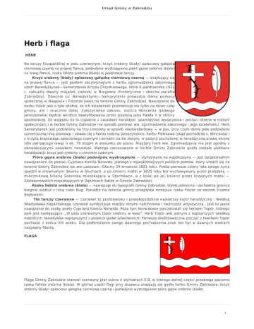 Urząd Gminy w Zabrodziu Herb i flaga HERB Na tarczy hiszpańskiej w polu czerwonym: krzyż srebrny (biały) opleciony gałązką cierniową czarną na prawej flance, podwójnie wystrzępione pióro gęsie srebrne (białe) na lewej flance, rzeka falista srebrna (biała) w podstawie tarczy. Krzyż srebrny (biały) opleciony gałązką cierniową czarną — znajdujący się na prawej flance — jest godłem zaczerpniętym z herbu zgromadzenia zakonnego sióstr Benedyktynek—Samarytanek Krzyża Chrystusowego, które 6 października 1931 r. zakupiły dawny majątek ziemski w Niegowie (historyczna i obecna parafia Zabrodzia). Obecnie ss. Benedyktynki—Samarytanki prowadzą domy pomocy społecznej w Niegowie i Fiszorze (wieś na terenie Gminy Zabrodzie). Nawiązanie do herbu Sióstr jest o tyle istotne, że Ich działalność promieniuje nie tylko na teren całej gminy, ale i znacznie dalej. Założycielka zakonu, siostra Wincenta (Jadwiga Jaroszewska) będzie wkrótce beatyfikowana przez papieżą Jana Pawła II w stolicy apostolskiej. Ze względu na to (zgodnie z zasadami heraldyki: upamiętniać wydarzenia i postaci istotne w historii społeczności,) w herbie Gminy Zabrodzie nie sposób pominąć ww. zgromadzenia zakonnego i jego działalności. Herb Samarytanek jest podzielony na trzy (niestety w sposób niestandardowy — w pas, przy czym dolne pole podzielono symetryczną linią pionową) i składa się z herbu rodziny Jaroszyńskich, herbu Piotrkowa (skąd pochodziła s. Wincenta) i z krzyża brązowego oplecionego czarnym cierniem na tle złotym, w pozycji pochylonej w heraldyczną prawą stronę (dla patrzącego lewą) o ok. 70 stopni w stosunku do pionu. Niestety herb ww. Zgromadzenia nie jest zgodny z obowiązującymi zasadami heraldyki, dlatego zastosowane w herbie Gminy Zabrodzie godło zostało poddane heraldyzacji: krzyż jest srebrny z cierniem czarnym. Pióro gęsie srebrne (białe) podwójnie wystrzępione — stylizowane na współczesne — jest bezpośrednim nawiązaniem do postaci Cypriana Kamila Norwida, jednego z najwybitniejszych polskich poetów, który urodził się na terenie Gminy Zabrodzie we wsi Laskowo—Głuchy 24 września 1821 roku. Poeta pierwsze cztery lata swego życia spędził w drewnianym dworku w Głuchach, a po śmierci matki w 1825 roku był wychowywany przez prababkę — miecznikową Hilarię Sobieską mieszkająca w Stachówce, a z kolei po jej śmierci przez krewnych matki — Zdzieborowskich mieszkających w Dębinkach (także w Gminie Zabrodzie). Rzeka falista srebrna (biała) — nawiązuje do topografii Gminy Zabrodzie, której północno—zachodnia granica biegnie wzdłuż z linią rzeki Bug. Ponadto na terenie gminy przepływa mniejsza rzeka Fiszor ze swoimi trzema dopływami. Tło tarczy czerwone — czerwień to podstawowy i prawdopodobnie najstarszy kolor heraldyczny . Według Władysława Kopalińskiego czerwień symbolizuje między innymi natchnienie i twórczość artystyczną . Jest tu jasne nawiązanie do osoby poety Cypriana Kamila Norwida. Poza tym Norwidowie pieczętowali się herbem Topór, którego opis jest następujący: „W polu czerwonym topór srebrny w lewo”. Herb Topór jest jednym z najstarszych (według niektórych heraldyków najstarszym) z polskich godeł szlacheckich! Pierwsza średniowieczna pieczęć z heerbem Topór pochodzi z końca XIII wieku. Dla podkreślenia swego dawnego pochodzenia znak ten był w dawnych wiekach nazywany Starżą. FLAGA Flagę Gminy Zabrodzie stanowi czerwony płat sukna o wymiarach 5:8, w którego dolnej części przebiega poziomo rzeka falista srebrna (biała). W górnej części flagi przy drzewcu znajdują się godła herbu Gminy Zabrodzie: krzyż srebrny (biały) opleciony gałązką cierniową czarną i podwójnie wystrzępione pióro gęsie srebrne (białe). 1
