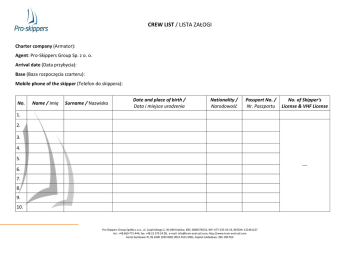 CREW LIST / LISTA ZAŁOGI Charter company (Armator): Agent: Pro-Skippers Group Sp. z o. o. Arrival date (Data przybycia): Base (Baza rozpoczęcia czarteru): Mobile phone of the skipper (Telefon do skippera): No. Name / Imię Surname / Nazwisko Date and place of birth / Data i miejsce urodzenia Nationality / Narodowość Passport No. / Nr. Paszportu No. of Skipper's License & VHF License 1. 2. 3. 4. 5. --- 6. 7. 8. 9. 10. Pro-Skippers Group Spółka z o.o., ul. Czapińskiego 2, 30-048 Kraków, KRS: 0000378232, NIP: 677-235-43-33, REGON: 121461227 tel.: +48 660-771-444, fax: +48 22 379 24 98, e-mail: [email protected], http://www.train-and-sail.com konto bankowe: PL 96 1600 1039 0002 0031 4515 6001, kapitał zakładowy: 396 100 PLN