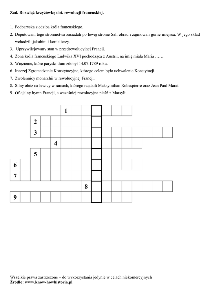Zad. Rozwiąż krzyżówkę dot. rewolucji francuskiej. 1. Podparyska siedziba króla francuskiego. 2. Deputowani tego stronnictwa zasiadali po lewej stronie Sali obrad i zajmowali górne miejsca. W jego skład wchodzili jakobini i kordelierzy. 3. Uprzywilejowany stan w przedrewolucyjnej Francji. 4. Żona króla francuskiego Ludwika XVI pochodząca z Austrii, na imię miała Maria …… 5. Więzienie, które paryski tłum zdobył 14.07.1789 roku. 6. Inaczej Zgromadzenie Konstytucyjne, którego celem było uchwalenie Konstytucji. 7. Zwolennicy monarchii w rewolucyjnej Francji. 8. Silny obóz na lewicy w ramach, którego rządzili Maksymilian Robespierre oraz Jean Paul Marat. 9. Oficjalny hymn Francji, a wcześniej rewolucyjna pieśń z Marsylii. 1 2 3 4 5 6 7 8 9 Wszelkie prawa zastrzeżone – do wykorzystania jedynie w celach niekomercyjnych Źródło: www.know-howhistoria.pl