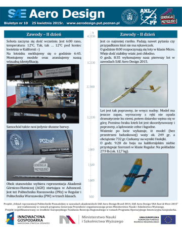 Biuletyn nr 10 25 kwietnia 2015r. www.aerodesign.put.poznan.pl Zawody – II dzień Sobota zaczyna się dość wcześnie. Jest 6:00 rano, temperatura: 12°C. Tak, tak … 12°C pod koniec kwietnia w Kalifornii :-) Na lotnisku meldujemy się o godzinie 6:45. Montujemy modele oraz aranżujemy naszą wizualną identyfikację. ft 42000 Zawody – II dzień 32000 Jest co najmniej rześko. Padają nawet pytania czy przypadkiem ktoś nie ma rękawiczek. O godzinie 8:00 rozpoczynają się loty w klasie Micro. Wieje dość stabilny wiatr, jest chłodno. O godz. 8:35 wykonujemy nasz pierwszy lot w zawodach SAE Aero Design 2015. 22000 12000 Samochód także nosi jedynie słuszne barwy. 2000 Lot jest tak poprawny, że wręcz nudny. Model ma jeszcze zapas, wyrzucony z ręki nie opada dramatycznie ku ziemi, potem dziarsko wpina się w górę. Pomimo braku lotek lot jest skoordynowany i poprawny, a lądowanie celne i łagodne. Ważenie po locie wykazuje, iż model (bez przestrzeni ładunkowej) waży ok. 249 gr, a obciążenie 732 gr. Czekamy na wyniki I kolejki. O godz. 9:28 do boju na kalifornijskim niebie przystępuje Szerszeń w klasie Regular. Na pokładzie 27.9 lb (ok. 12,7 kg). 1500 1000 Obok stanowisko wybiera reprezentacja Akademii Górniczo-Hutniczej (AGH) startująca w Advanced. Jest też Politechnika Rzeszowska (PRz) w Regular i Politechnika Warszawska (PW) w trzech klasach. 500 Projekt „Udział reprezentacji Politechniki Poznańskiej w zawodach akademickich SAE Aero Design Brasil 2014, SAE Aero Design USA East & West 2015” jest realizowany w ramach programu Generacja Przyszłości organizowanego przez Ministerstwo Nauki i Szkolnictwa Wyższego. Projekt współfinansowany ze środków Europejskiego Funduszu Rozwoju Regionalnego w ramach Programu Operacyjnego Innowacyjna Gospodarka. Biuletyn nr 10 25 kwietnia 2015r. www.aerodesign.put.poznan.pl Zawody – II dzień Lot jest bardzo poprawny. W drugim zakręcie wiatr nieco pogłębia przechylenie modelu, ale wszystko przebiega bezpiecznie. Lądowanie bardzo łagodne. Pierwsze loty zatem zaliczone. Działa to dobrze na psychikę ekipy, która po dobrze spełnionym obowiązku zabiera się do konsumpcji spóźnionego śniadania. W międzyczasie w The Home Depot (odpowiednik np. Castoramy) kupujemy dodatkowy kask i ochronne okulary (dla pilota i osoby wyrzucającej w klasie Micro). Organizatorzy znów „po swojemu” zinterpretowali zapisy regulaminu i teraz wszystkie ekipy mają problem z duplikowaniem pojedynczych kompletów. Można by rzec, że jest nudno. Żadnych napraw, gorączkowych remontów, ekspresowych wypraw do sklepów modelarskich czy Home Depot. Oby tak do końca … Loty przeprowadzają reprezentacje PW i PRz. Warszawa udane, Rzeszów prawie - „prawie czyni wielką różnicę” - lot jest poprawny, niestety na dobiegu model gubi jedno kółko. Skąd my to znamy … i wiemy jak to boli. Pojawiają się wyniki Micro po pierwszej kolejce. Z czwartego wskakujemy na drugie miejsce w klasyfikacji generalnej. Przed nami … Politechnika Warszawska. Miło widzi się dwie polskie ekipy na pierwszych miejscach, ale dlaczego w tej kolejności?! :-) Obiektywnie patrząc Warszawa ma naprawdę dobry model, bardzo lekki, wykonany z laminatu węglowego - będą tutaj faworytem. Wyniki Micro po I kolejce (17 drużyn): • Politechnika Warszawska 189,4 pkt. • Politechnika Poznańska 176,1 pkt. • University of Windsor, USA 159,4 pkt. Tymczasem loty wykonują samoloty klasy Advanced, wśród nich modele AGH i PW. Kraków udanie zrzuca ładunek dość blisko celu (zadanie dla klasy Advanced), Warszawa wykonuje dłuższy lot, nie zakończony jednak zrzutem. ft 42000 32000 Zawody – II dzień Tymczasem pojawiają się wyniki I kolejki w klasie Regular. Po konkurencjach technicznych zajmowaliśmy miejsce 10. Teraz lądujemy na 6. miejscu, jednak okazuje się, że organizatorzy niepoprawnie policzyli punkty za tzw. payload prediction (prognozowany udźwig). Po przeliczeniu wyników powinniśmy być wyżej, w pierwszej kolejce podnieśliśmy największy ciężar ze wszystkich ekip. 22000 12000 2000 1500 1000 500 Aktualnie dla lotniska wysokość ciśnieniowa to 300 ft, podnieśliśmy 27.9 lb, a prognozowaliśmy 27,4 lb. Ponieważ prognoza była większa niż uzyskany udźwig stracimy ułamek punktów, ale nie jest to sporym problemem. Micro drugi raz leci o godz. 11:45. Na pokładzie trochę większy ładunek. Wieje bardzo silny, stabilny wiatr. Powinno być dobrze i jest. Mocny rzut nie jest potrzebny, model dziarsko pnie się do góry. Lądowanie zakończone cyrklem, jednak bez uszkodzeń modelu. Lot zaliczony. W tym locie w przestrzeni ładunkowej podnieśliśmy 1 lb i 14 oz obciążenia (856 gr). Jest dobrze. Pojawiają się skorygowane wyniki I kolejki w klasie Regular. Wskakujemy na drugie miejsce w klasyfikacji generalnej w gronie 38 drużyn: • Polytechnique Montreal, Kanada 138.1 pkt. • Politechnika Poznańska, Polska 132.9 pkt. • Xian Jiaotong University, Chiny 123.9 pkt Jest dobrze. Projekt „Udział reprezentacji Politechniki Poznańskiej w zawodach akademickich SAE Aero Design Brasil 2014, SAE Aero Design USA East & West 2015” jest realizowany w ramach programu Generacja Przyszłości organizowanego przez Ministerstwo Nauki i Szkolnictwa Wyższego. Projekt współfinansowany ze środków Europejskiego Funduszu Rozwoju Regionalnego w ramach Programu Operacyjnego Innowacyjna Gospodarka. Biuletyn nr 10 25 kwietnia 2015r. www.aerodesign.put.poznan.pl Zawody – II dzień Cały czas na lotnisku jest po prostu … zimno. A w Polsce 22°C, jak donoszą nam nasi krajowi korespondenci. O 12:40 pochodzimy do drugiej kolejki lotów w klasie Regular. Przed lotem z norki wychyla się Gofer. Jak się okazuje przeczuwa niebezpieczeństwo. Ale nie uprzedzajmy faktów. ft 42000 Zawody – II dzień 32000 22000 Na pokładzie jedna sztabka więcej niż w poprzednim locie, ok. 13,3 kg. Model miał poprzednio spory nadmiar mocy, nie było żadny