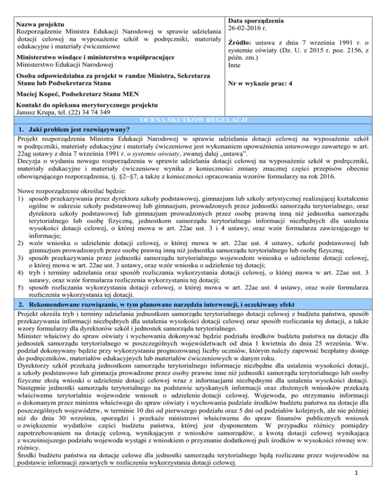1 Nazwa projektu Rozporządzenie Ministra Edukacji Narodowej w