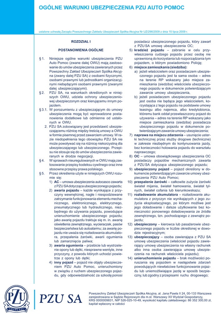 OGÓLNE WARUNKI UBEZPIECZENIA PZU AUTO POMOC ustalone uchwałą Zarządu Powszechnego Zakładu Ubezpieczeń Spółka Akcyjna Nr UZ/296/2009 z dnia 15 lipca 2009 r. ROZDZIAŁ I POSTANOWIENIA OGÓLNE Niniejsze ogólne warunki ubezpieczenia PZU Auto Pomoc (zwane dalej OWU) mają zastosowanie do umów ubezpieczenia zawieranych przez Powszechny Zakład Ubezpieczeń Spółka Akcyjna (zwany dalej PZU SA) z osobami fizycznymi, osobami prawnymi lub jednostkami organizacyjnymi niebędącymi osobami prawnymi (zwanymi dalej ubezpieczającymi). § 2. PZU SA, na warunkach określonych w niniejszych OWU, udziela ochrony ubezpieczeniowej ubezpieczonym oraz kierującemu innym pojazdem. § 3.1. W porozumieniu z ubezpieczającym do umowy ubezpieczenia mogą być wprowadzone postanowienia dodatkowe lub odmienne od ustalonych w OWU. 2. PZU SA zobowiązany jest przedstawić ubezpieczającemu różnicę między treścią umowy a OWU w formie pisemnej przed zawarciem umowy. W razie niedopełnienia tego obowiązku PZU SA nie może powoływać się na różnicę niekorzystną dla ubezpieczającego lub ubezpieczonego. Przepisu nie stosuje się do umów ubezpieczenia zawieranych w drodze negocjacji. § 4. W sprawach nieuregulowanych w OWU mają zastosowanie przepisy kodeksu cywilnego oraz inne stosowne przepisy prawa polskiego. § 5. Przez określenia użyte w niniejszych OWU rozumie się: 1) AC – umowa ubezpieczenia autocasco zawarta z PZU SA dotycząca ubezpieczonego pojazdu; 2) awaria pojazdu – każde wynikające z przyczyny wewnętrznej, nagłe i niespodziewane zatrzymanie funkcjonowania elementu mechanicznego, elektronicznego, elektrycznego, pneumatycznego lub hydraulicznego, niezbędnego do używania pojazdu, powodujące unieruchomienie ubezpieczonego pojazdu; jako awarię pojazdu traktuje się m. in. awarię oświetlenia zewnętrznego, wycieraczek, pasów bezpieczeństwa lub autoalarmu; za awarię pojazdu nie uważa się rozładowania akumulatora, przepalenia żarówki, awarii ogumienia lub zamarznięcia paliwa; 3) awaria ogumienia – przebicie lub wystrzelenie opony lub dętki, niesprawne wentyle, inne przyczyny, z powodu których uchodzi powietrze z opony lub dętki; 4) inny pojazd – pojazd nie objęty ubezpieczeniem PZU Auto Pomoc, unieruchomiony w związku z ruchem ubezpieczonego pojazdu, gdy odpowiedzialność za szkodę ponosi 5) § 1. 6) 7) 8) 9) 10) 11) 12) 13) 14) posiadacz ubezpieczonego pojazdu, który zawarł z PZU SA umowę ubezpieczenia OC; kradzież pojazdu – zabranie w celu przywłaszczenia cudzego pojazdu przez osobę nie uprawnioną do korzystania lub rozporządzania tym pojazdem, o którym powiadomiono Policję; miejsce zamieszkania (siedziba): a) jeżeli właścicielem oraz posiadaczem ubezpieczonego pojazdu jest ta sama osoba – adres na terenie RP wskazany jako miejsce zamieszkania (siedziba) właściciela ubezpieczonego pojazdu w dokumencie potwierdzającym zawarcie umowy ubezpieczenia, b) jeżeli posiadaczem ubezpieczonego pojazdu jest osoba nie będąca jego właścicielem, korzystająca z tego pojazdu na podstawie umowy leasingu albo najemca, albo kredytobiorca, któremu bank oddał przewłaszczony pojazd do używania – adres na terenie RP wskazany jako miejsce zamieszkania (siedziba) posiadacza ubezpieczonego pojazdu w dokumencie potwierdzającym zawarcie umowy ubezpieczenia; naprawa na miejscu zdarzenia – usunięcie usterki technicznej przez służby drogowe (techniczne) w zakresie niezbędnym do kontynuowania jazdy, bez konieczności holowania pojazdu do warsztatu naprawczego; OC – umowa obowiązkowego ubezpieczenia OC posiadaczy pojazdów mechanicznych zawarta z PZU SA dotycząca ubezpieczonego pojazdu; ubezpieczony pojazd – pojazd określony w dokumencie potwierdzającym zawarcie umowy ubezpieczenia PZU Auto Pomoc; przepalenie żarówki – całkowite zużycie żarówki świateł mijania, świateł hamowania, świateł tylnych, świateł cofania lub kierunkowskazu; rozładowanie akumulatora – rozładowanie akumulatora z przyczyn nie wynikających z jego zużycia eksploatacyjnego, po którym możliwe jest jego doładowanie i dalsze użytkowanie bez konieczności ponownego doładowywania ze źródła zewnętrznego, tzn. pochodzącego z zewnątrz pojazdu; ubezpieczony – kierowca lub pasażerowie ubezpieczonego pojazdu w liczbie określonej w dowodzie rejestracyjnym; ubezpieczający – osoba zawierająca z PZU SA umowę ubezpieczenia (właściciel pojazdu zawierający umowę ubezpieczenia na własny rachunek albo inna osoba zawierająca umowę ubezpieczenia na rachunek właściciela pojazdu); unieruchomienie pojazdu – brak możliwości poruszania się pojazdem w następstwie zdarzeń powodujących niewłaściwe funkcjonowanie pojazdu lub uniemożliwiające jazdę w sposób bezpieczny, lub zgodny z przepisami ruchu drogowego; Powszechny Zakład Ubezpieczeń Spółka Akcyjna, al. Jana Pawła II 24, 00-133 Warszawa zarejestrowana w Sądzie Rejonowym dla m.st. Warszawy XII Wydział Gospodarczy, KRS 0000009831, NIP 526-025-10-49, wysokość kapitału zakładowego: 86 352 300,00 zł, kapitał wpłacony w całości 15) uraz ciała – uszkodzenia ciała zaistniałe wskutek wypadku lub innych zdarzeń związanych z ubezpieczonym pojazdem, tj. podczas wsiadania lub wysiadania z pojazdu, bezpośrednio przy jego załadunku lub wyładunku, podczas postoju i naprawy na trasie jazdy – zagrażające życiu kierowcy lub pasażera albo mogące spowodować w krótkim czasie poważne pogorszenie się ich stanu zdrowia, zagrażające ich życiu, jeżeli nie zostanie im szybko udzielona odpowiednia pomoc medyczna; 16) wypadek – zdarzenie, w wyniku którego ubezpieczony pojazd uległ uszkodzeniu lub zniszczeniu, które spowodowało jego unieruchomienie, z wyłączeniem kradzieży pojazdu i awarii; 17) zgon – śmierć kierowcy lub pasażera wskutek wypadku lub innych zdarzeń związanych z pojazdem, o których mowa w pkt 15; 18) PZU Pomoc – jednostka organizacyjna PZU SA 