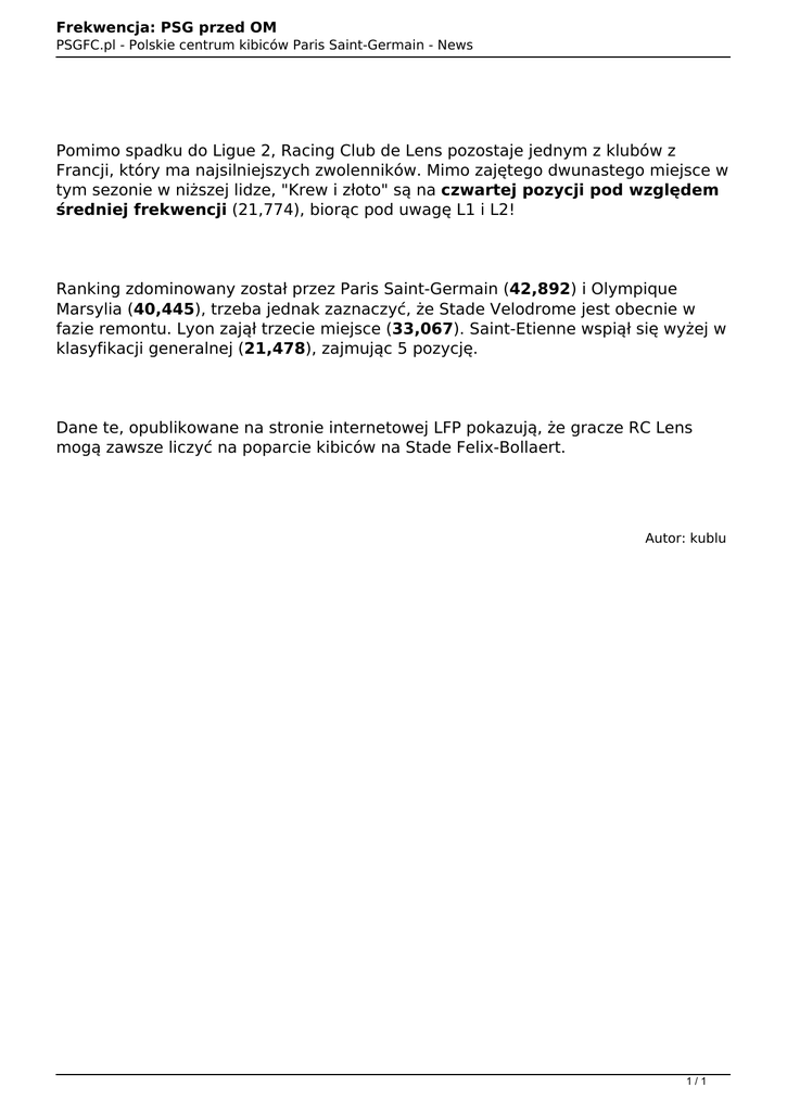 Frekwencja: PSG przed OM PSGFC.pl - Polskie centrum kibiców Paris Saint-Germain - News Pomimo spadku do Ligue 2, Racing Club de Lens pozostaje jednym z klubów z Francji, który ma najsilniejszych zwolenników. Mimo zajętego dwunastego miejsce w tym sezonie w niższej lidze, "Krew i złoto" są na czwartej pozycji pod względem średniej frekwencji (21,774), biorąc pod uwagę L1 i L2! Ranking zdominowany został przez Paris Saint-Germain (42,892) i Olympique Marsylia (40,445), trzeba jednak zaznaczyć, że Stade Velodrome jest obecnie w fazie remontu. Lyon zajął trzecie miejsce (33,067). Saint-Etienne wspiął się wyżej w klasyfikacji generalnej (21,478), zajmując 5 pozycję. Dane te, opublikowane na stronie internetowej LFP pokazują, że gracze RC Lens mogą zawsze liczyć na poparcie kibiców na Stade Felix-Bollaert. Autor: kublu 1/1 Powered by TCPDF (www.tcpdf.org)