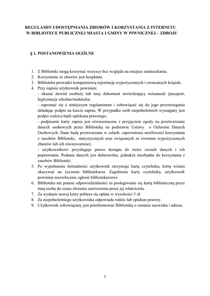 REGULAMIN UDOSTĘPNIANIA ZBIORÓW I KORZYSTANIA Z INTERNETU W BIBLIOTECE PUBLICZNEJ MIASTA I GMINY W PIWNICZNEJ – ZDROJU § 1. POSTANOWIENIA OGÓLNE 1. 2. 3. 4. 5. 6. 7. 8. 9. Z Biblioteki mogą korzystać wszyscy bez względu na miejsce zamieszkania. Korzystanie ze zbiorów jest bezpłatne. Biblioteka prowadzi komputerową rejestrację wypożyczonych i zwracanych książek. Przy zapisie użytkownik powinien: - okazać dowód osobisty lub inny dokument stwierdzający tożsamość (paszport, legitymacja szkolna/studencka; - zapoznać się z niniejszym regulaminem i zobowiązać się do jego przestrzegania składając podpis na karcie zapisu. W przypadku osób niepełnoletnich wymagany jest podpis rodzica bądź opiekuna prawnego; - podpisanie karty zapisu jest równoznaczne z przyjęciem zgody na przetwarzanie danych osobowych przez Bibliotekę na podstawie Ustawy o Ochronie Danych Osobowych. Dane będą przetwarzane w celach: zapewnienia możliwości korzystania z zasobów Biblioteki, statystycznych oraz związanych ze zwrotem wypożyczonych zbiorów lub ich równowartości; - użytkownikowi przysługuje prawo dostępu do treści swoich danych i ich poprawiania. Podanie danych jest dobrowolne, jednakże niezbędne do korzystania z zasobów Biblioteki. Po wypełnieniu formalności użytkownik otrzymuje kartę czytelnika, którą winien okazywać na życzenie bibliotekarza. Zagubienie karty czytelnika, użytkownik powinien niezwłocznie zgłosić bibliotekarzowi. Biblioteka nie ponosi odpowiedzialności za posługiwanie się kartą biblioteczną przez inną osobę do czasu złożenia zastrzeżenia przez jej właściciela. Za wydanie nowej karty pobiera się opłatę w wysokości 5 zł. Za niepełnoletniego użytkownika odpowiada rodzic lub opiekun prawny. Użytkownik zobowiązany jest poinformować Bibliotekę o zmianie nazwiska i adresu. 1 § 2. ZASADY KORZYSTANIA Z WYPOŻYCZALNI 1. Jednorazowo można wypożyczyć do 10 egzemplarzy materiałów bibliotecznych na okres nie dłuższy niż miesiąc. 2. Użytkownicy nie posiadający zameldowania na terenie powiatu nowosądeckiego mogą wypożyczyć jednorazowo 2 egzemplarze materiałów bibliotecznych. 3. Bibliotekarz może przesunąć termin zwrotu wypożyczonych materiałów bibliotecznych jeżeli nie ma na nie zapotrzebowania ze strony innych użytkowników. 4. Biblioteka może skrócić ustalony termin zwrotu, jeżeli stanowią one pozycje szczególnie poszukiwane. 5. Użytkownik Biblioteki ma prawo do samodzielnej rezerwacji oraz zamówienia w systemie elektronicznym. 6. Rezerwowane lub zamówione materiały biblioteczne należy odebrać do trzech dni roboczych w przypadku, gdy istnieje możliwość powiadomienia użytkownika drogą e- maila, lub do pięciu dni roboczych, gdy informacja przekazywana jest telefonicznie. 7. Użytkownik ma prawo do uzyskania pełnych informacji w zakresie posiadanych przez bibliotekę zbiorów, pomocy w doborze literatury, korzystaniu z katalogu komputerowego, wydawnictw informacyjnych. 8. Biblioteka udziela informacji dotyczącej posiadanych zbiorów, doboru literatury na interesujący użytkownika temat, sposobu korzystania z katalogów, wydawnictw informacyjnych i innych materiałów znajdujących się w Bibliotece 9. Użytkownik zobowiązany jest do poszanowania materiałów bibliotecznych będących własnością Biblioteki jako dobro publiczne: - powinien zwrócić uwagę na ich stan przed wypożyczeniem, a zauważone uszkodzenia zgłosić bibliotekarzowi; - braki stwierdzone przez bibliotekarza, a niezgłoszone uprzednio obciążają użytkowników. 10. W razie zagubienia, zniszczenia lub uszkodzenia użytkownik jest zobowiązany do odkupienia egzemplarza lub uiszczenia opłaty, której wysokość odpowiada równowartości aktualnej ceny rynkowej książki. 11. Na sumy wpłacone z tytułu zagubienia lub uszkodzenia materiałów bibliotecznych Biblioteka wydaje użytkownikowi pokwitowanie. 12. Za zgodą bibliotekarza można w zamian za zagubiony egzemplarz materiału bibliotecznego przekazać inny tej samej wartości – jeżeli będzie dla Biblioteki użyteczny. 13. Za zniszczoną lub zagubioną oprawę z folii pobiera się opłatę w wysokości 2 zł. 14. Za przetrzymywanie materiałów bibliotecznych ponad wyznaczony termin pobierana jest opłata w kwocie 0,50 zł za każdy miesiąc przetrzymanych materiałów . 15. Za wysłanie upomnienia Biblioteka pobiera 3 zł. 16. Jeżeli użytkownik, mimo upomnień wysłanych przez Bibliotekę odmawia zwrotu materiałów bibliotecznych, Biblioteka dochodzi swoich roszczeń zgodnie z przepisami prawa. 2 § 3. UDOSTĘPNIANIE ZBIORÓW BIBLIOTECZNYCH NA MIEJSCU 1. Księgozbiór podręczny i czasopisma udostępnia się na miejscu w wyznaczonym kąciku czytelniczym. 2. Materiały biblioteczne udostępnia się po okazaniu dowodu tożsamości lub karty bibliotecznej i po dokonaniu wpisu w zeszycie odwiedzin. 3. Przyniesione ze sobą książki i inne materiały należy zgłosić u bibliotekarza. 4. Z materiałów bibliotecznych przeznaczonych do udostępniania na miejscu korzysta się za pośrednictwem bibliotekarza. 5. Przed opuszczeniem czytelni czytelnik zwraca materiały biblioteczne, z których korzystał. 6. Materiałów bibliotecznych przeznaczonych do korzystania na miejscu nie wypożycza się na zewnątrz. Jednak w uzasadnionych przypadkach bibliotekarz może na krótki okres wypożyczyć materiały biblioteczne. § 4. WYPOŻYCZALNIA MIĘDZYBIBLIOTECZNA 1. Użytkownik Biblioteki może zamówić, za pośrednictwem Biblioteki, sprowadzenie potrzebnych mu książek, jeśli nie ma ich w zbiorach Biblioteki. 2. Biblioteka sprowadza poszukiwane książki na koszt użytkownika 3. Przy składaniu zamówienia użytkownik zobowiązuje się do pokrycia kosztów przesyłki pocztowej. (Załącznik nr 1) 4. Książki sprowadzone przez Bibliotekę są udostępniane na miejscu. 5. Termin korzystania z zamówionych książek oraz możliwość ewentualnej prolongaty określa