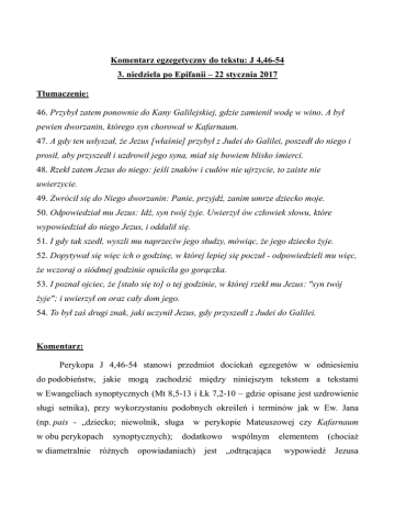 Komentarz egzegetyczny do tekstu: J 4,46-54 3. niedziela po Epifanii – 22 stycznia 2017 Tłumaczenie: 46. Przybył zatem ponownie do Kany Galilejskiej, gdzie zamienił wodę w wino. A był pewien dworzanin, którego syn chorował w Kafarnaum. 47. A gdy ten usłyszał, że Jezus [właśnie] przybył z Judei do Galilei, poszedł do niego i prosił, aby przyszedł i uzdrowił jego syna, miał się bowiem blisko śmierci. 48. Rzekł zatem Jezus do niego: jeśli znaków i cudów nie ujrzycie, to zaiste nie uwierzycie. 49. Zwrócił się do Niego dworzanin: Panie, przyjdź, zanim umrze dziecko moje. 50. Odpowiedział mu Jezus: Idź, syn twój żyje. Uwierzył ów człowiek słowu, które wypowiedział do niego Jezus, i oddalił się. 51. I gdy tak szedł, wyszli mu naprzeciw jego słudzy, mówiąc, że jego dziecko żyje. 52. Dopytywał się więc ich o godzinę, w której lepiej się poczuł - odpowiedzieli mu więc, że wczoraj o siódmej godzinie opuściła go gorączka. 53. I poznał ojciec, że [stało się to] o tej godzinie, w której rzekł mu Jezus: "syn twój żyje"; i uwierzył on oraz cały dom jego. 54. To był zaś drugi znak, jaki uczynił Jezus, gdy przyszedł z Judei do Galilei. Komentarz: Perykopa J 4,46-54 stanowi przedmiot dociekań egzegetów w odniesieniu do podobieństw, jakie mogą zachodzić między niniejszym tekstem a tekstami w Ewangeliach synoptycznych (Mt 8,5-13 i Łk 7,2-10 – gdzie opisane jest uzdrowienie sługi setnika), przy wykorzystaniu podobnych określeń i terminów jak w Ew. Jana (np. pais - „dziecko; niewolnik, sługa w obu perykopach synoptycznych); w diametralnie różnych w perykopie Mateuszowej czy Kafarnaum dodatkowo opowiadaniach) jest wspólnym „odtrącająca elementem wypowiedź (chociaż Jezusa (por. J 4,48 z Mk 7,27 i Mt 15,24); i wreszcie wspólnym mianownikiem opowiadań jest uzdrowienie „na odległość . Nie jest wykluczone zatem, że za tymi opowiadaniami stoi jedno wydarzenie – lub inaczej: jeden opis w przedewangelicznych źródłach pisemnych. 46-47 Ewangelista na początku perykopy – poprzez wzmiankę o Kanie Galilejskiej i tym, co się tam wydarzyło – nawiązuje do pierwszego „znaku , który został objawiony przez Jezusa. Zdaniem niektórych komentatorów niniejsza perykopa wraz z J 2,1-11 mogła należeć do jednego „cyklu opowiadań związanych z Kaną. Na spotkanie z Jezusem przybył pewien dworzanin, którego przynależność etniczna nie jest jasna (u synoptyków w historii o uzdrowieniu sługi setnika wyraźnie chodzi o poganina). Termin basilikos (dosł. „królewski ) obejmował osoby, które oficjalnie pełniły służbę na dworze królewskim. Józef Flawiusz używając tego określenia, w znacznej mierze odnosił go do najemników pogańskich (Dawne dzieje Izraela XV, 289; XVII, 266. 270. 281 i in.), ale w niektórych przypadkach opis dotyczył urzędnika dworskiego (Dawne dzieje..., X, 123). W naszej perykopie chodzi zapewne o dworzanina służącego na dworze Heroda Antypasa, który formalnie był tetrarchą Galilei i Perei, potocznie jednak często nazywano go „królem (por. Mk 6,14, ale już w Mt 14,1 użyty jest poprawnie termin tetraarches). Sam dworzanin mieszkał w Kafarnaum, mieście leżącym na północnym skraju Jeziora Genezaret (inne określenia: Jezioro Galilejskie lub Jezioro Tyberiadzkie). Odległość między Kafarnaum a Kaną Galilejską była dla podróżnego – zważywszy na pilną sprawę – dość duża: ok. 15 mil (ok. 32 lub 33 km), w dodatku droga wiodła z miejsca znajdującego się nieco ponad 200 metrów poniżej poziomu morza (obecnie w depresji Doliny Jordanu) do miejscowości leżącej w górzystej Galilei. Dworzanin, śpiesząc się, musiał spędzić w podróży około pół dnia. Sprawa była nader pilna, gdyż w Kafarnaum pozostawał ciężko chory syn, któremu groziła śmierć. Wieści o Jezusie a zwłaszcza Jego czynach rozchodziły się prędko, stąd nadzieja u dworzanina, który wiedząc, że w okolicy przechodził Jezus z uczniami, zdecydował się na desperacką podróż. Wiersz 47 nosi oznaki stylu Janowego (użycie zaimka [h]outos - „ten ; wzmianka o podróży z Judei do Galilei – por. J 4,54; użycie zwrotu emellen gar apothneskein - „miał się bowiem blisko śmierci - por. J 11,51; 12,33; 18,32). Dworzanin prosił Jezusa, aby ten przybył (dosł. „zstąpił, zszedł ) do niego i uzdrowił syna. 48 Odpowiedź Jezusa w pierwszym momencie wydaje się szorstka: widać w tym wersecie zamysł Jana, aby oczekiwany cud nie był celem sam w sobie. Cud ma być znakiem wskazującym na godność Tego, który ma go dokonać. Przy tym tekst wywołuje wrażenie, że dworzanin zostaje „wliczony do szerszego grona słuchających Galilejczyków. Mocne, podwójne przeczenie ou me nie pozostawia wątpliwości co do zarzutu „płytkiej wiary Galilejczyków, która skupia się na samych znakach i cudach, tzn. na ich zewnętrznych, widzialnych elementach. Grecki zwrot semeia kai terata (tj. „znaki i cuda ) w greckim przekładzie Starego Testamentu pojawia się aż 26 razy, z kolei w NT występuje głównie w Dziejach Apostolskich, ale również w Mk 13,22; Rz 15,19; 2 Kor 12,12 i innych miejscach. Semeia jest technicznym słowem, którego Jan używa przy opisie cudów Jezusa, jednak w połączeniu z terata – w kontekście obecnej perykopy – może stanowić figurę stylistyczną zwaną hendiadysem, gdzie dwa wyrażenia połączone spójnikiem przedstawiają jedno pojęcie. Greckie słowo teras („cud ) nie występuje nigdzie indziej w Ew. Jana, a generalnie odnosi się do spektakularnego wydarzenia, jakie może wstrząsnąć lub wprawić w podziw jego świadków. 49-50 Zdesperowany ojciec nie poddaje się zniechęceniu (podobnie jak Syrofenicjanka w Mk 7,28!) i ponawia prośbę. Podkreślona zostaje groza bliskiej śmierci jego dziecka (czułe określenie pais - „dziecko ). W starotestamentowym rozumieniu ciężko chory człowiek był już niejako obj