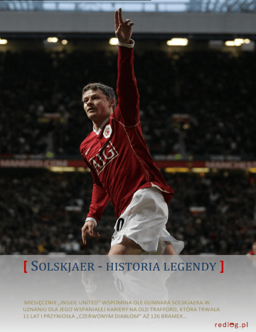 [ SOLSKJAER - HISTORIA LEGENDY ] MIESIĘCZNIK „INSIDE UNITED” WSPOMINA OLE GUNNARA SOLSKJAERA W UZNANIU DLA JEGO WSPANIAŁEJ KARIERY NA OLD TRAFFORD, KTÓRA TRWAŁA 11 LAT I PRZYNIOSŁA „CZERWONYM DIABŁOM” AŻ 126 BRAMEK… SOLSKJAER - HISTORIA LEGENDY MIESIĘCZNIK „INSIDE UNITED” WSPOMINA OLE GUNNARA SOLSKJAERA W UZNANIU DLA JEGO WSPANIAŁEJ KARIERY NA OLD TRAFFORD , KTÓRA TRWAŁA 11 LAT I PRZYNIOSŁA „CZERWONYM DIABŁOM” AŻ 126 BRAMEK… ‘J AKI O LE ?’ To był telefon, którego Age Hareide się obawiał. Trener drużyny Molde wiedział, jak dobry jest Ole Gunnar Solskjaer. Pytanie brzmiało kiedy, a nie czy, zgłosi się po niego któryś z wielkich klubów. - „Sir Alex często do mnie wydzwaniał pytając o moją opinię w sprawie norweskich zawodników” - mówił Hareide. - „Wiedział, że dobrze znam angielskie realia, dlatego chciał wiedzied, jakie mam zdanie o konkretnych piłkarzach, a przede wszystkim jak mogliby sobie poradzid w Anglii. W koocu, w lipcu 1996 roku, nadszedł ten dzieo, w którym telefon dotyczył jednego z moich podopiecznych. Sir Alex zapytał o Ole Gunnara. Wiedziałem, że będzie nam go bardzo brakowało, ale nie da się stanąd na drodze zawodnikowi, gdy pyta o niego Manchester United. Powiedziałem Fergusonowi: ‘musisz go mied’. I tak się stało. United kupiło go za 1,5 miliona funtów! Myślę, że są mi winni jakieś pieniądze, biorąc pod uwagę, jak dobrego piłkarza dostali”. P IERWSZY I OSTATNI Dla Ole i United była to miłośd od pierwszego wyjrzenia. Jego transferowi towarzyszył spora doza kontrowersji, ale to szybko się zmieniło. Pierwszy znak, że Manchester United jest w posiadaniu „mordercy o twarzy dziecka”, nadszedł na stadionie Oldham na Boundary Park w wygranym 2:0 meczu rezerw. Obie bramki zdobył oczywiście nowy nabytek „Czerwonych Diabłów”. Kilka dni później, Norweg zadebiutował w pierwszej drużynie, wchodząc z ławki rezerwowych w spotkaniu z Blackburn Rovers. Solskjaer pojawił się na murawie w 64. minucie, a już po sześciu minutach wyrównał stan meczu na 2:2, podtrzymując serię 32 meczów na Old Trafford bez porażki. Ole nie zapomniał żadnej swojej bramki. - „Obydwa te spotkania zapadły głęboko w moją pamięd” - mówił. - „Wspaniale było po raz pierwszy mied na sobie tę czerwoną koszulkę, nawet jeżeli był to mecz rezerw. A zdobycie pierwszego gola na Old Trafford było dla mnie naprawdę wyjątkowym przeżyciem. Zawsze będę miał w pamięci oba te wspomnienia”. NIE ZOSTAWIAJ NAS W TAKI SPOSÓB… Nie zostaje się najlepszym strzelcem United bez zainteresowania ze strony rywalizujących klubów i to w sytuacji, gdy nie jest się zawodnikem pierwszego składu. W sezonie 1997/1998 doniesienia prasowe mówiły o zainteresowaniu Solskjaerem przez dośd liczne grono europejskich drużyn, co wywołało u kibiców „Czerwonych Diabłów” najczarniejsze myśli. Na szczęście, Ole miał swoje zdanie. „Pamiętam, jak często rozmawiałem ze swoim agentem o transferze do Tottenhamu. Mówił mi, że byłem najbardziej upartym piłkarzem na świecie” - Solskjaer sięga pamięcią 10 lat wstecz. - „Oba kluby uzgodniły nawet kwotę transferu - ciągle mam ten faks w domu! Bardzo łatwo można było naciskad do podjęcia takiego kroku, ale ja 1|S t r o n a nie chciałem odchodzid, a menedżer ciągle powtarzał, że dostanę swoją szansę. Nie rzucał słów na wiatr. Byłem dumny, że grałem dla najlepszej drużyny w kraju. Chciałem byd jej częścią”. PIERWSZY TYTUŁ Po dziewięciu miesiącach Ole wreszcie doczekał się pierwszego trofeum. W 33 spotkaniach zdobył 18 goli w lidze (19 we wszystkich rozgrywkach) i z tą zdobyczą został królem strzelców Premier League, a także po raz pierwszy otrzymał medal za mistrzostwo Anglii. - „Pierwszy raz wygrałem coś w piłce, nie wliczając trofeów, które zdobyłem będąc graczem drużyn U-11 i U-12 w lokalnych rozgrywkach” - opowiadał. - „Ten wtorek był cudowny, usiadłem przed telewizorem i oglądałem mecze West Hamu z Newcastle i pojedynek Wimbledonu z Liverpoolem. Po koocowym gwizdku zadzwonił do mnie Ronny Johnsen - staliśmy tak wrzeszcząc do siebie, jak jacyś wariaci. To było jak bajka. Chciałem więcej takich wspaniałych chwil”. I Ole dostał to, co chciał… P OŚWIĘCENIE DLA DRUŻY N Y Gdy w sezonie 1997/1998 pozostały już tylko cztery spotkania do kooca rozgrywek, ewentualna wygrana United z Newcastle była wymogiem, jeżeli podopieczni sir Aleksa Fergusona mieli dogonid prowadzący w tabeli Arsenal. Wielu kibiców doskonale pamięta tamto spotkanie (wymęczone 1:1) z powodu jednego, wyjątkowego momentu. W koocówce spotkania Solskjaer pokonał Shaya Givena, ale piłkę z linii bramkowej zdołał wybid Nikos Dabizas. Futbolówka trafiła do Roba Lee, który był na środku boiska i nie miał przed sobą nikogo, prócz golkipera Manchesteru. Stracona bramka praktycznie zapewniłaby mistrzostwo „Kanonierom”, a więc sytuacja w zasadzie beznadziejna. Jednak za pędzącym na bramkę Robem Lee, z wielką determinacją ruszył Solskjaer. Norwegowi udało się dogonid rywala tuż przed polem karnym, a następnie bezpardonowo i z premedytacją powalid go na ziemię. Owszem, zachowanie karygodne i niesportowe, ale gdy jest się pod ścianą, sięga się po radykalne środki. Gdy sędzia Uriah Rennie wyciągał z kieszeni czerwoną kartkę, kamera telewizyjna uchwyciła Ole mówiącego do Davida Beckhama „musiałem to zrobid”. Były zawodnik Molde doskonale wiedział, jak wielkie znaczenie miał ten wślizg w kontekście dogonienia Arsenalu i ewentualnego zdobycia tytułu - i tego nigdy mu nie zapomnimy. ZIMA 1999 ROKU „Moim marzeniem jest strzelenie gola Liverpoolowi. Jeszcze większym marzeniem jest zdobycie zwycięskiej bramki w wygranym 1:0 meczu z Liverpoolem na Old Trafford”. Marzenie Solskjaera zostało spełnione, chod wynik był nieco inny, w pami