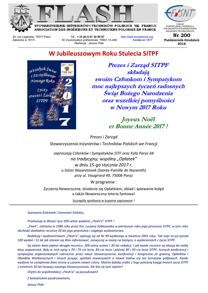 Członek EUROPEJSKIEJ FEDERACJI POLONIJNYCH STOWARZYSZEŃ NAUKOWO-TECHNICZNYCH 20, rue Legendre, 75017 Paris Założone w 1917r. Tel : + 33 (0) 6 07 30 96 97 Nr d’autorisation préfectorale: 79501-13.446 Redakcja : Janusz Ptak http://sitpf.europolonia.org fondée en 1917 Nr 200 Październik-Grudzień 2016 W Jubileuszowym Roku Stulecia SITPF Prezes i Zarząd SITPF składają swoim Członkom i Sympatykom moc najlepszych życzeń radosnych Świąt Bożego Narodzenia oraz wszelkiej pomyślności w Nowym 2017 Roku Joyeux Noël et Bonne Année 2017 ! Prezes i Zarząd Stowarzyszenia Inżynierów i Techników Polskich we Francji zapraszają Członków i Sympatyków SITF oraz Koła Paryż AK na tradycyjny, wspólny „Opłatek” w dniu 15-go stycznia 2017 r. u Sióstr Nazaretanek (Sainte-Famille de Nazareth) przy ul. Vaugirard 49, 75006 Paryż W programie : Życzenia Noworoczne, dzielenie się Opłatkiem, obiad i śpiewanie kolęd a także Noworoczna loteria fantowa! Szczegóły spotkania w kuponie zapisowym ! Szanowne Koleżanki i Szanowni Koledzy, Przekazuję w Wasze ręce 200-setne wydanie „Flash’a” SITPF ! „Flash”, założony w 1986 roku przez Kol. Lucjana Sobkowiaka w pierwszym roku jego prezesury SITPF, w tym roku obchodzi dokładnie rocznicę 30 lat jego powstania i ciągłego wydawnictwa. Redakcją i wydawnictwem „Flash’a” zajmuję się od Nr 99 wydanego w kwietniu 2001 roku. Tak więc to już ponad 100 wydań i 15 lat jak staram się Was informować, zazwyczaj w miarę na bieżąco, o wydarzeniach z życia SITPF. Są zatem dwie piękne okrągłe rocznice: 200-setny numer i 30 lat redakcji. I jak każde rocznice są okazją do małej dozy wspomnień. Były w nich opisy z 70 i 75-cio lecia, 85-cio lecia i później 90 i 95-cio lecia SITPF, licznych konferencji i sympozjów organizowanych rokrocznie przez nasze Stowarzyszenie, konferencji i kongresów za granicą, Opłatków i Obiadów Wielkanocnych i innych przyjęć, spotkań towarzyskich a nawet balów czy też turniejów golfowych. Każde wydanie to conajmniej dwie strony a czasem nawet cztery. Można byłoby zrobić z tego poteżną księgę historii życia SITPF z ostatnich 30 lat rozwoju naszego Stowarzyszenia. Ale kto się tym zajmie? Chętni do współredakcji „Flash’a” są poszukiwani! Z koleżeńskim pozdrowieniem, Janusz Ptak Z ŻYCIA STOWARZYSZENIA 30 wrzesień 2016 - w Stacji Naukowej Polskiej Akademii Nauk w Paryżu miała miejsce konferencja mgr inż. Tomasza Gȯrki, członka SITPF, pt. „Start-up nową technologią innowacyjności”. Od prelegenta, będącego twórcą jednego ze start-up, dowiedzieliśmy się jak powstają dzisiaj firmy typu „start-up”, jak są finansowane, jak funkcjonują, jak żyją i pracują ich twórcy, jak wykorzystują relacje dzięki sieciom socjalnym, jakie są ryzyka, wady i zalety. Konferencja ta wpisuje się w cykl konferencji zatytułowany „Rewolucja przemysłowa 4.0”, organizowany w ramach 100-lecia SITPF. 13-15 październik 2016 – w Wiedniu miało miejsce tegoroczne spotkanie delegatów, zorganizowane przy okazji Walnego Zebrania stowarzyszeń EFPSNT. Rozpoczęło się ono konferencją w salonach Ambasady RP w Wiedniu, pod Honorowym Patronatem i z udziałem J.E. Ambasadora RP w Austrii Pana mgr Artura Lorkowskiego. Odczyty wygłosili : Dr hab. inż. Tadeusz Pająk EurIng., prof. AGH w Krakowie nt. „›Waste to Energy‹ w Polsce, jako alternatywne źródło energii – aktualny stan i perspektywy dalszego rozwoju” oraz Dipl.Ing. Wojciech Spalony, członek VPI, Prezes Zarządu firmy AFT Sp. z o.o.: „Nowoczesne urządzenia w instalacjach ochrony powietrza dla energetyki”. Na zakończenie konferencji Dipl.-Ing. Andrzej Tombiński, Wiceprezes VPI, Prezes Zarządu firmy „Re-Bau”, zaprezentował jej osiągnięcia z okazji 20-to lecia firmy, natomiast po części konferencyjnej mieliśmy możność wysłuchać doskonałego koncertu fortepianowego w wykonaniu Pani Kathrin Buczak. Wieczór zakończył się towarzyskimi rozmowami przy dobrze zaopatrzonym bufecie. Nazajutrz, 14go października 2016 r. w siedzibie Wydziału Promocji i Inwestycji przy Ambasadzie RP w Wiedniu, odbyło się Walne Zebranie Federacji, w trakcie którego nie tylko podsumowano tegoroczną działalność zarówno Federacji jak i stowarzyszeń członkowskich ale także dokonano wyborów do Sekretariatu Generalnego na następną 3-letnią kadencję 2016-19. Sekretarzem Generalnym został ponownie wybrany Kol. Janusz Ptak z SITPF, natomiast Z-cą SG Kol. Andrzej Kajzer z ZFPITN a Skarbnikiem Kol. Katarzyna André z SITPF. Opiekę nad witryną internetową jako Webmaster przejął Kol. Piotr Świeboda z STP w WB a Kol. Bożena Prochaska z VPI pełnić będzie nadal funkcję koordynatora ds. Administracyjnych. W składzie Sekretariatu Generalnego jest także Kol. Krystyna Liziard, jako przedstawiciel SITPF a w Radzie Naukowej Kol. M.Obrębska, J.Niziński i Jan Suski. W trakcie WZ przewodnictwo Federacji na rok następny zostało przekazane stowarzyszeniu francuskiemu SITPF, świętującego w 2017r. 100 lecie istnienia. Przewodnictwo z rąk Kol. Józefa Buczaka, Prezesa VPI przejął Kol. Lucjan Sobkowiak, Prezes SITPF. Komunikat prasowy z pełną informacją odnośnie nowych władz Federacji, został rozesłany przez SG do najważniejszych instytucji i organizacji technicznych polskich i polonijnych i ukazał się m.in. na stronie internetowej FSNT NOT www.eNOT.pl pod datą 14-go grudnia 2016. W trakcie WZ omówiono również wiele istotnych spraw Federacji a m.in. zakończenia prac nad nową witryną internetową, roli Rady Naukowej i Konwentu Seniorów oraz kwestii finansowania EFPSNT. 28 octobre 2016 – Dans le contexte du 100ème anniversaire de la création de l’AITPF, notre Association propose à ses membres et à toutes les personnes intéressées, un cycle de conférences consacré à la « Révolution Industrielle 4.0 » que le monde vit actuellement. Après le passionnan