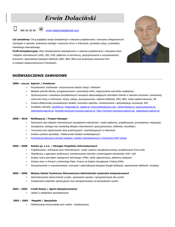 Erwin Dolaciński 506 56 36 56 @ [email protected] Cel zawodowy: Chcę pogłębiać swoje kompetencje w obszarze projektowania i tworzenia zintegrowanych rozwiązań w zakresie: budowania strategii i wizerunku firmy w Internecie, sprzedaży usług i produktów, marketingu internetowego. Profil kompetencyjny: Mam dziesięcioletnie doświadczenie w zakresie projektowania i wdrażania stron i sklepów internetowych (UXD, UID, CMS, platformy e-commerce), pozycjonowania w wyszukiwarkach, tworzenia i optymalizacji kampanii AdWords (SEO, SEM, SEA) oraz budowania wizerunku firm w mediach społecznościowych (Facebook). DOŚWIADCZENIE ZAWODOWE 2008 – obecnie Asprom / Freelancer Pozyskiwanie, budowanie i utrzymywanie stałych relacji z klientami Badanie potrzeb klienta, przygotowywanie i prezentacja ofert, negocjowanie warunków współpracy Opracowywanie i wdrażanie kompleksowych rozwiązań odpowiadających potrzebom Klienta w zakresie tworzenia i prezentacji wizerunku firmy w Internecie: strony, sklepy, pozycjonowanie, reklama AdWords, SEO, SEM, media społecznościowe, FB Analiza efektywności prowadzonych działań, tworzenie raportów, monitorowanie i optymalizacja, konwersje, ROI Przykłady wdrożeń: jachtfilm.pl, bhpprojekt.pl, regalto.pl, kosze-delikatesowe.com, lalima-bielsko.pl, psiewychowanie.pl, dwamaszty.asprom.pl, drzewka-owocowe-wyszkow.asprom.pl, http://remonty-warszawa.asprom.pl/, galgankowo.asprom.pl 2008 – 2010 NetShops.pl / Project Manager Stworzenie sieci sklepów internetowych (zarządzanie wdrożeniem: wybór platformy, projektowanie, przeniesienie, integracja) Zarządzanie, obsługa oraz marketing sklepów internetowych (pozycjonowanie, AdWords, newsletter) Tworzenie oraz nadzorowanie akcji promocyjnych i marketingowych w Internecie Analiza wyników sprzedaży i efektywności działań marketingowych Prezentacja dotycząca wdrożeń sklepów i działań marketingowych w Internecie (PDF online) 2006 – 2008 Solutio sp. z o.o. / Manager Projektów Informatycznych Projektowanie i wdrażanie stron internetowych: wybór systemu zarządzania treścią, projektowanie front-endu Współpraca z agencjami graficznymi, koordynowanie wdrożeń, przestrzeganie standardów UXD i UID Analiza rynku pod kątem dostępnych technologii: CMSy, silniki ogłoszeniowe, platformy sklepowe Zmiana stron w firmach z technologii Flash, iFrame na System Zarządzania Treścią (CMS) Pozycjonowanie w wyszukiwarkach, tworzenie i optymalizacja kampanii Google AdWords, raportowanie AdWords i Analytics 2005 – 2006 Wyższa Szkoła Techniczno-Ekonomiczna/Administrator systemów komputerowych Administrowanie siecią intranet uczelni, zamawianie sprzętu i oprogramowania dla uczelni Instalowanie systemów operacyjnych oraz oprogramowania na komputerach uczelni 2004 – 2005 2002 – 2003 Credit Suisse / Agent Ubezpieczeniowy Udział w szkoleniach sprzedażowych Megabit / Specjalista Wektoryzacja warszawskiej sieci wodno - kanalizacyjnej Finans / Asystent Księgowego 2001 Wystawianie faktur, prace administracyjne, pomoc w rozliczeniach księgowych Case / Ankieter 2000 Przeprowadzanie ankiet konsumenckich: telefonicznych i bezpośrednich WYKSZTAŁCENIE 1997 – 2005 Uniwersytet Warszawski – Instytut Stosowanych Nauk Społecznych 1997 XXVIII LO im. Jana Kochanowskiego w Warszawie UMIEJĘTNOŚCI Tworzenie kampanii reklamowych: Google AdWords, Google AdWords Editor, Manager Kont AdWords (CMK) Tworzenie stron internetowych: znajomość CMS Joomla!, WordPress, XHTML, CSS, MySQL, phpMyAdmin Tworzenie sklepów internetowych: IAI Shop, VirtueMart, cStore Analityka odwiedzin i raportowanie: Google Analytics, Search Console, badanie konwersji CPA, CPO i zwrotu z inwestycji ROI Pozycjonowanie: doskonałe znajomość zagadnień SEO i SEM, znajomość programów Adder, Publiker Dobra znajomość programów: MS Office, Photoshop Dobre umiejętności sprzedażowe i negocjacyjne, badanie potrzeb klienta, prezentowanie rozwiązań i produktów Znajomość zagadnień związanych z social media: tworzenie i zarządzanie fan page na Facebooku Znajomość produktów ubezpieczeniowych / inwestycyjnych - Licencja Agenta Ubezpieczeniowego KNUIFE nr 356154/03 ZNAJOMOŚĆ JĘZYKÓW OBCYCH Język angielski – komunikatywnie w mowie i piśmie KURSY I SZKOLENIA 2014 – Asertywność w Praktyce 2014 – Pewność Siebie 2013 – Warsztat Antystresowy 2013 – Tajniki Motywacji 2013 – Zarządzanie Czasem 2003 – Szkolenie Umiejętności Sprzedażowych ZAINTERESOWANIA Taniec latynoamerykański – salsa liniowa i kubańska, bachata, kizomba, zouk Pływanie, żeglarstwo (patent żeglarza jachtowego) Muzyka, szanty, gitara Rozwój osobisty Brydż sportowy Wyrażam zgodę na przetwarzanie moich danych osobowych zawartych w ofercie pracy dla potrzeb procesu rekrutacji zgodnie z ustawą z dnia 29.08.1997r. Dz. U. z 2002 r., Nr 101, poz. 926 ze zm.