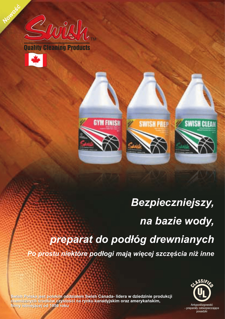 ć w oś No TM Quality Cleaning Products Bezpieczniejszy, na bazie wody, preparat do podłóg drewnianych Po prostu niektóre podłogi mają więcej szczęścia niż inne Swish Polska jest polskim oddziałem Swish Canada- lidera w dziedzinie produkcji chemicznych środków czystości na rynku kanadyjskim oraz amerykańskim, firmy istniejącej od 1956 roku Antypoślizgowość - preparaty zabezpieczające posadzki PROGRAM Podłogi z drewna bardzo często są wizytówką budynków. Ich doskonały stan i połysk decydują o ogólnym pozytywnym wrażeniu gości i osób pracujących w tych pomieszczeniach. Sprawdzony, dobry program konserwacji takich posadzek, podkreśla ich naturalne piękno i gwarantuje długotrwałe i bezpieczne ich użytkowanie. Dokonując wyboru metody pielęgnacji takich posadzek powinieneś zapoznać się z Programem Odnawiania i Pielęgnacji Podłóg Drewnianych firmy Swish. Podczas gdy większość podłóg drewnianych jest odnawianych poprzez zabieg cyklinowania i ponownego lakierowania powierzchni, Program Odnawiania i Pielęgnacji Posadzek Drewnianych firmy Swish jest bezpieczniejszy dla posadzki i może być wykonany znacznie niższym kosztem w porównaniu do metod tradycyjnych. System firmy Swish eliminuje czasochłonny i pyłotwórczy zabieg cyklinowania, stropowania i ponownego uszczelniania i lakierowania posadzki. Nasz system zapewnia wyschnięcie posadzki w czasie 1-2 godzin i jej gotowość do pełnego użytkowania w ciągu 24 godzin. CECHY CHARAKTERYSTYCZNE I KORZYŚCI BEZPIECZEŃSTWO Posiada certyfikat UL potwierdzający antypoślizgowość Niższy poślizg Bezpieczny dla zdrowia i bez uciążliwego zapachu Jednoskładnikowa receptura EFEKT GOTOWY JUŻ PO 24 H OD APLIKACJI NIŻSZY KOSZT O około 25% większa trwałość Większa wydajność - 1L na 20-25m2 Szybsze schnięcie (ok. 1-2godz.) ŁATWA APLIKACJA I PIELĘGNACJA POSADZKI Rozprowadzić preparat Swish Prep, po czym spłukać i umyć posadzkę, a następnie rozprowadź preparat Gym Finish Łatwy do odnowienia w miejscach dużego natężenia ruchu Może być polerowany Równomiernie pokrywa posadzkę Unikalna metoda odnawiania w przeciwieństwie do tradycyjnych metod odnawiania warstw zabezpieczających podłogi sportowe www.swishclean.pl INFORMACJA O PRODUKTACH SWISH PREP, poj.1L, 5L Preparat o podwójnym działaniu. Stosuje się go do czyszczenia i mycia podłóg drewnianych przed nałożeniem warstwy nabłyszczającej i polerowaniem. Użyty przed zabiegiem nabłyszczania, usuwa z posadzki drobiny brudu i czarne zarysowania z obuwia, doprowadzając posadzkę do jednolitego matowego wyglądu, gotową do nałożenia warstwy nabłyszczającej GYM FINISH. GYM FINISH, poj. 1L, 5L Ta jednoskładnikowa mieszanka akrylowa, o wysokiej zawartości ciał stałych oraz wysokim połysku stanowi zdumiewający postęp w stosunku do konwencjonalnych preparatów nabłyszczających do podłóg drewnianych. Gwarantuje trwały piękny wygląd i trwałe zabezpieczenie wszelkiego typu posadzek drewnianych. Krótki, 1-2 godz. czas schnięcia każdej warstwy oznacza obniżenie do 24 godzin czasu gotowości posadzki do ponownego użytkowania. Jednoskładnikowa receptura uwalnia od konieczności mieszania składników przed aplikacją. SWISH CLEAN, poj. 1L, 5L Preparat czyszczący o neutralnym odczynie pH przeznaczony do mycia średnio i silnie zabrudzonych posadzek. Nisko pieniący się i nie wymagający spłukiwania preparat nie spowoduje zmatowienia posadzki drewnianej, obojętnie czy do mycia przystąpimy z użyciem białego mopa lub automatu myjącego. Preparat rozpuszcza osady oraz inne zanieczyszczenia nadając posadzce lśniący wygląd. SPOSÓB UŻYCIA APLIKACJA PIELĘGNACJA · Upewnij się, że podłoga jest właściwie uszczelniona i nabłyszczona preparatem GYM FINISH · Myć za pomocą preparatu SWISH CLEAN z użyciem automatu myjącego wyposażonego w czerwony pad lub mopem z mikrofazy; pozostawić do wyschnięcia · Polerować za pomocą padów z włosiem dla zapewnienia wysokiego połysku · · · · · · Zamieć podłogę i usuń z niej ślady gumy do żucia i naklejki Rozprowadź mopem SWISH PREP, aby usunąć z posadzki silne zabrudzenia i czarne ślady z obuwia Przeszoruj posadzkę szorowarką z papierem o granul. 80-100 lub czarnym padem, aby zapewnić posadzce dostateczną przyczepność warstwy nabłyszczającej Umyj posadzkę, aby usunąć z niej wszystkie luźne pozostałości po szorowaniu Nałóż cienką równą warstwę preparatu GYM FINISH rozprowadzając ją wzdłuż słoi desek Pozostaw na 1-2 godziny do wyschnięcia Nałóż drugą warstwę GYM FINISH · PRZEDŁUŻONA ŻYWOTNOŚĆ PODŁOGI O 25 % Po prostu niektóre podłogi mają więcej szczęścia niż inne www.swishclean.pl TM Quality Cleaning Products Jesteśmy ekspertami w dziedzinie pielęgnacji posadzek. Nasi specjaliści mogą Ci służyć poradą i profesjonalna analizą potrzeb Twoich posadzek. Kontaktuj się z nami poprzez www.swishclean.pl aby otrzymać więcej informacji. SWISH POLSKA SP. Z O.O. UL.PAŃSKA 73 00-834 WARSZAWA swishclean.pl TEL. 22 31 47 102 [email protected]