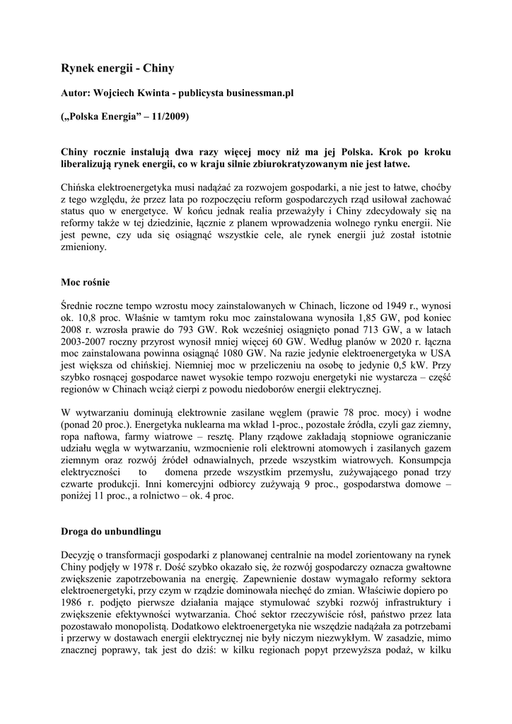Rynek energii - Chiny Autor: Wojciech Kwinta - publicysta businessman.pl („Polska Energia” – 11/2009) Chiny rocznie instalują dwa razy więcej mocy niŜ ma jej Polska. Krok po kroku liberalizują rynek energii, co w kraju silnie zbiurokratyzowanym nie jest łatwe. Chińska elektroenergetyka musi nadąŜać za rozwojem gospodarki, a nie jest to łatwe, choćby z tego względu, Ŝe przez lata po rozpoczęciu reform gospodarczych rząd usiłował zachować status quo w energetyce. W końcu jednak realia przewaŜyły i Chiny zdecydowały się na reformy takŜe w tej dziedzinie, łącznie z planem wprowadzenia wolnego rynku energii. Nie jest pewne, czy uda się osiągnąć wszystkie cele, ale rynek energii juŜ został istotnie zmieniony. Moc rośnie Średnie roczne tempo wzrostu mocy zainstalowanych w Chinach, liczone od 1949 r., wynosi ok. 10,8 proc. Właśnie w tamtym roku moc zainstalowana wynosiła 1,85 GW, pod koniec 2008 r. wzrosła prawie do 793 GW. Rok wcześniej osiągnięto ponad 713 GW, a w latach 2003-2007 roczny przyrost wynosił mniej więcej 60 GW. Według planów w 2020 r. łączna moc zainstalowana powinna osiągnąć 1080 GW. Na razie jedynie elektroenergetyka w USA jest większa od chińskiej. Niemniej moc w przeliczeniu na osobę to jedynie 0,5 kW. Przy szybko rosnącej gospodarce nawet wysokie tempo rozwoju energetyki nie wystarcza – część regionów w Chinach wciąŜ cierpi z powodu niedoborów energii elektrycznej. W wytwarzaniu dominują elektrownie zasilane węglem (prawie 78 proc. mocy) i wodne (ponad 20 proc.). Energetyka nuklearna ma wkład 1-proc., pozostałe źródła, czyli gaz ziemny, ropa naftowa, farmy wiatrowe – resztę. Plany rządowe zakładają stopniowe ograniczanie udziału węgla w wytwarzaniu, wzmocnienie roli elektrowni atomowych i zasilanych gazem ziemnym oraz rozwój źródeł odnawialnych, przede wszystkim wiatrowych. Konsumpcja elektryczności to domena przede wszystkim przemysłu, zuŜywającego ponad trzy czwarte produkcji. Inni komercyjni odbiorcy zuŜywają 9 proc., gospodarstwa domowe – poniŜej 11 proc., a rolnictwo – ok. 4 proc. Droga do unbundlingu Decyzję o transformacji gospodarki z planowanej centralnie na model zorientowany na rynek Chiny podjęły w 1978 r. Dość szybko okazało się, Ŝe rozwój gospodarczy oznacza gwałtowne zwiększenie zapotrzebowania na energię. Zapewnienie dostaw wymagało reformy sektora elektroenergetyki, przy czym w rządzie dominowała niechęć do zmian. Właściwie dopiero po 1986 r. podjęto pierwsze działania mające stymulować szybki rozwój infrastruktury i zwiększenie efektywności wytwarzania. Choć sektor rzeczywiście rósł, państwo przez lata pozostawało monopolistą. Dodatkowo elektroenergetyka nie wszędzie nadąŜała za potrzebami i przerwy w dostawach energii elektrycznej nie były niczym niezwykłym. W zasadzie, mimo znacznej poprawy, tak jest do dziś: w kilku regionach popyt przewyŜsza podaŜ, w kilku innych jest odwrotnie. Słabość sieci przesyłowej utrudnia handel energią. Przełomowe decyzje podjęto w 2002 r., kiedy rozdzielono wytwarzanie energii od przesyłu i dystrybucji, przełamując monopol państwowej State Power Corporation (SPC). Powstało pięć państwowych holdingów: Huaneng Group, Huadian Power, Guodian Power, Datang Power Group oraz China Power Investment Company. Podzielono je tak, by kaŜdy posiadał nie więcej niŜ 20 proc. państwowych mocy wytwórczych. W sumie mają ok. połowę rynku wytwarzania elektryczności. Reszta naleŜy do niezaleŜnych producentów – są to często firmy działające w partnerstwie ze spółkami, w których większość udziałów mają przedsiębiorstwa państwowe. W ograniczonym zakresie działają teŜ spółki zagraniczne, gdyŜ – mimo deregulacji – wciąŜ istnieją powaŜne bariery dla firm spoza Chin. W trakcie reformy powstało dwóch państwowych operatorów sieci przesyłowych i dystrybucyjnych: Southern Power Company i State Power Grid Company. Działają na terenie 12 regionalnych sieci wcześniej zarządzanych przez SPC. Do 2020 r. ma się zakończyć ich łączenie w trzy wielkie grupy: południową, gdzie operuje Southern Power Company, i północną oraz północno-zachodnią podlegające drugiemu operatorowi. W 2003 r. utworzono State Electricity Regulatory Commission (SERC) – odpowiednik polskiego Urzędu Regulacji Energetyki, z tą róŜnicą, Ŝe SERC zajmuje się wyłącznie elektroenergetyką i nie ma wpływu na taryfy. Sieci przesyłowe i dystrybucyjne pozostają państwowe, a konkurencję dopuszczono jedynie w wytwarzaniu i handlu energią. Regulacje i taryfy NajpotęŜniejszą organizacją decydującą o losach energetyki jest National Development and Reform Commission (NDRC) – rządowa agencja zajmująca się długoterminowym strategicznym planowaniem rozwoju sektora elektroenergetycznego. Decyduje o głównych inwestycjach i organizuje państwowe fundusze inwestycyjne na potrzeby infrastruktury. Poza tym kontroluje ceny i narzuca rządową politykę cenową. W przyszłości, w miarę postępu liberalizacji rynku, sprawy taryf prawdopodobnie trafią do SERC. Hurtowe i detaliczne ceny energii elektrycznej narzuca NDRC, ogranicza teŜ rentowność wytwórców (stopa zwrotu ograniczona do 12-15 proc.). Tak restrykcyjne podejście doprowadziło kilka przedsiębiorstw do strat w połowie ubiegłego roku, podczas szczytu cen paliw (zwiększonych kosztów nie dało się zrekompensować wyŜszymi cenami). Była to jedna z przyczyn zeszłorocznych niedoborów elektryczności, zmusiła teŜ część wytwórców do wyłączania bloków. Skutkiem ubocznym był wzrost importu węgla – elektrownie poszukiwały tańszego paliwa. Polityka cenowa wyraźnie preferuje przemysł – opłaty są o ponad 40 proc. niŜsze niŜ w przypadku odbiorców indywidualnych. NDRC wyciąga jednak wnioski i przygotowuje reformę polityki taryfowej. Stopniowo zwiększa teŜ swobodę wyboru dostawcy przez