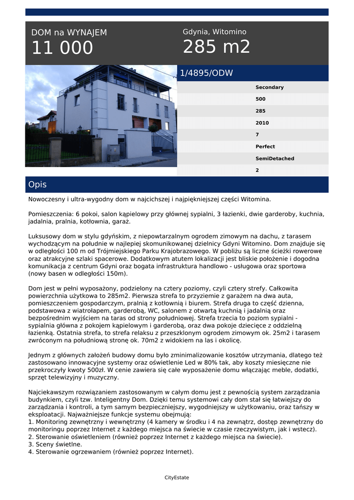 DOM na WYNAJEM 11 000 Gdynia, Witomino 285 m2 1/4895/ODW Secondary 500 285 2010 7 Perfect SemiDetached 2 Opis Nowoczesny i ultra-wygodny dom w najcichszej i najpiękniejszej części Witomina. Pomieszczenia: 6 pokoi, salon kąpielowy przy głównej sypialni, 3 łazienki, dwie garderoby, kuchnia, jadalnia, pralnia, kotłownia, garaż. Luksusowy dom w stylu gdyńskim, z niepowtarzalnym ogrodem zimowym na dachu, z tarasem wychodzącym na południe w najlepiej skomunikowanej dzielnicy Gdyni Witomino. Dom znajduje się w odległości 100 m od Trójmiejskiego Parku Krajobrazowego. W pobliżu są liczne ścieżki rowerowe oraz atrakcyjne szlaki spacerowe. Dodatkowym atutem lokalizacji jest bliskie położenie i dogodna komunikacja z centrum Gdyni oraz bogata infrastruktura handlowo - usługowa oraz sportowa (nowy basen w odległości 150m). Dom jest w pełni wyposażony, podzielony na cztery poziomy, czyli cztery strefy. Całkowita powierzchnia użytkowa to 285m2. Pierwsza strefa to przyziemie z garażem na dwa auta, pomieszczeniem gospodarczym, pralnią z kotłownią i biurem. Strefa druga to część dzienna, podstawowa z wiatrołapem, garderobą, WC, salonem z otwartą kuchnią i jadalnią oraz bezpośrednim wyjściem na taras od strony południowej. Strefa trzecia to poziom sypialni sypialnia główna z pokojem kąpielowym i garderobą, oraz dwa pokoje dziecięce z oddzielną łazienką. Ostatnia strefa, to strefa relaksu z przeszklonym ogrodem zimowym ok. 25m2 i tarasem zwróconym na południową stronę ok. 70m2 z widokiem na las i okolicę. Jednym z głównych założeń budowy domu było zminimalizowanie kosztów utrzymania, dlatego też zastosowano innowacyjne systemy oraz oświetlenie Led w 80% tak, aby koszty miesięczne nie przekroczyły kwoty 500zł. W cenie zawiera się całe wyposażenie domu włączając meble, dodatki, sprzęt telewizyjny i muzyczny. Najciekawszym rozwiązaniem zastosowanym w całym domu jest z pewnością system zarządzania budynkiem, czyli tzw. Inteligentny Dom. Dzięki temu systemowi cały dom stał się łatwiejszy do zarządzania i kontroli, a tym samym bezpieczniejszy, wygodniejszy w użytkowaniu, oraz tańszy w eksploatacji. Najważniejsze funkcje systemu obejmują: 1. Monitoring zewnętrzny i wewnętrzny (4 kamery w środku i 4 na zewnątrz, dostęp zewnętrzny do monitoringu poprzez Internet z każdego miejsca na świecie w czasie rzeczywistym, jak i wstecz). 2. Sterowanie oświetleniem (również poprzez Internet z każdego miejsca na świecie). 3. Sceny świetlne. 4. Sterowanie ogrzewaniem (również poprzez Internet). CityEstate 5. Video-domofon z połączeniem na telefon komórkowy w przypadku nieobecności właściciela w posesji. 6. Alarm z podziałem na strefy. 7. Serwer muzyczny - 7 stref muzycznych, sterowanie każdą strefą oddzielnie, i wybieranie w każdym pomieszczeniu innej muzyki (możliwość archiwizacji trzech tysięcy płyt). 8. Sterowanie otwieraniem bramy wjazdowej i garażowej (również na pilota – Bramy w kolorze RAL 7012). Kuchnia została wyposażona w czarne meble wykonane z MDF-u na wysoki połysk z oddzielną wyspą (blumy, carga), lodówkę Whirlpool, piekarnik z najnowszej linii z funkcją kuchenki mikrofalowej Siemens i z tej samej linii kawiarka. Kawiarka to najnowszy model firmy Siemens, który parzy kawę pod ciśnieniem 19 barów! Zmywarka Elektrolux. Kuchnia wychodzi na przestronny salon, który został wyposażony w wysokiej klasy sprzęt audio-wizualny. Wartość sprzętu to około 100tys złotych. Na szczególną uwagę zasługuje z pewnością antresola przy klatce schodowej przechodząca przez trzy poziomy domu. W sypialni uwagę przykuwa łóżko z podświetlonym pikowaniem zarówno na ścianie, jak i na suficie. Pokój kąpielowy przy sypialni został wyposażony w glazurę i mozaikę Grespania, wysokiej klasy kabinę prysznicową z sauną parową, deszczownicą koloroterapią i aromaterapią RepaBAD (nagłośnienie wewnętrzne, efekt prawdziwego deszczu - wartość 89 000zł), wannę Villeroy&Boch, umywalkę NICDesign, wc oraz bidet, również NICDesign, baterię umywalkową, wannową i bidetową Hansa. Powierzchnia całkowita działki 308m2. - dane o powierzchniach każdego piętra: Garaż – 40,5m2 Siłownia – 24m2 Korytarz – 5,1m2 Kotłownia z pralnią – 5,3m2 Pomieszczenie gospodarcze – 12,1 Parter: Salon z jadalnią – 53,3m2 Garderoba – 3,2m2 Kuchnia – 10,9m2 Wc – 2,3m2 Hall – 5,5m2 Taras – 11,9m2 I piętro: Sypialnia – 13,9m2 Pokój – 9,1m2 Pokój – 12m2 Garderoba – 3,5m2 Łazienka – 20,6m2 Łazienka – 4m2 II piętro: Ogród zimowy – 25m2 Taras – 52,6m2 Ogród zimowy to przeszklona przestrzeń z kwiatami, półkami na książki, zasłonami i zestawem mebli wypoczynkowych NOTI w tkaninie JOOP!. Oprócz samej posesji na uwagę zasługuje także sama okolica. Mieszkańcy Witomina zgodnie uważają dzielnicę "Leśniczówka" za najbardziej urokliwą i spokojną spośród innych. W większości niska zabudowa, bliskość lasu i sama specyfika miejsca narzucają wrażenie, ukrytego pośród miasta i na nowo odkrywanego przez nas miejsca, pełnego wyciszenia i uroku. Całkowity i pełni oddający zalety posesji opis nie jest możliwy. Piękna i pełni możliwości domu nie CityEstate da się oddać poprzez fotografie, czy opis. Zapraszamy na prezentację! Może to końcu coś na Twoją miarę....... Sławomir Aleksak tel. 730 088 165 Sławomir Aleksak tel. 730-088-165 email: [email protected] CityEstate Powered by TCPDF (www.tcpdf.org)