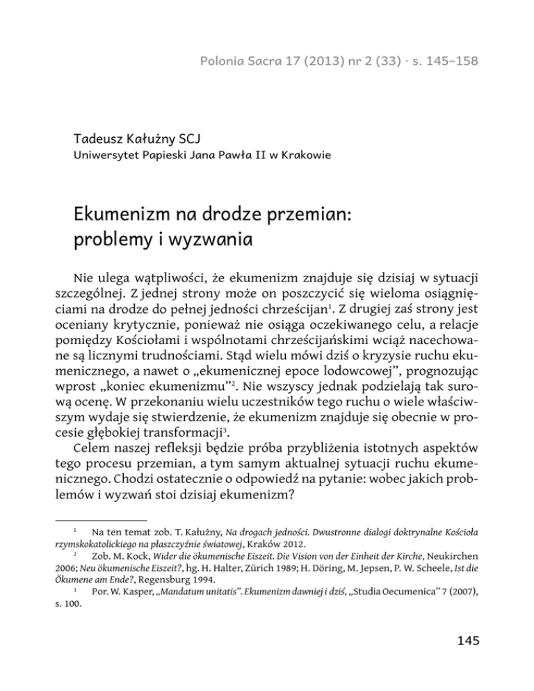 Polonia Sacra 17 (2013) nr 2 (33) ∙ s. 145–158 Tadeusz Kałużny SCJ Uniwersytet Papieski Jana Pawła II w Krakowie Ekumenizm na drodze przemian: problemy i wyzwania Nie ulega wątpliwości, że ekumenizm znajduje się dzisiaj w sytuacji szczególnej. Z jednej strony może on poszczycić się wieloma osiągnięciami na drodze do pełnej jedności chrześcijan1. Z drugiej zaś strony jest oceniany krytycznie, ponieważ nie osiąga oczekiwanego celu, a relacje pomiędzy Kościołami i wspólnotami chrześcijańskimi wciąż nacechowane są licznymi trudnościami. Stąd wielu mówi dziś o kryzysie ruchu ekumenicznego, a nawet o „ekumenicznej epoce lodowcowej”, prognozując wprost „koniec ekumenizmu”2. Nie wszyscy jednak podzielają tak surową ocenę. W przekonaniu wielu uczestników tego ruchu o wiele właściwszym wydaje się stwierdzenie, że ekumenizm znajduje się obecnie w procesie głębokiej transformacji3. Celem naszej refleksji będzie próba przybliżenia istotnych aspektów tego procesu przemian, a tym samym aktualnej sytuacji ruchu ekumenicznego. Chodzi ostatecznie o odpowiedź na pytanie: wobec jakich problemów i wyzwań stoi dzisiaj ekumenizm? Na ten temat zob. T. Kałużny, Na drogach jedności. Dwustronne dialogi doktrynalne Kościoła rzymskokatolickiego na płaszczyźnie światowej, Kraków 2012. 2 Zob. M. Kock, Wider die ökumenische Eiszeit. Die Vision von der Einheit der Kirche, Neukirchen 2006; Neu ökumenische Eiszeit?, hg. H. Halter, Zürich 1989; H. Döring, M. Jepsen, P. W. Scheele, Ist die Ökumene am Ende?, Regensburg 1994. 3 Por. W. Kasper, „Mandatum unitatis”. Ekumenizm dawniej i dziś, „Studia Oecumenica” 7 (2007), s. 100. 1 145 Odpowiedź zostanie sformułowana w postaci prezentacji sześciu zasadniczych obszarów zmian, które składają się na aktualną sytuację ekumenizmu i stanowią wyzwanie dla jego dalszego rozwoju: Cel ekumenizmu (1); Partnerzy dialogu (2); Paradygmat ekumeniczny (3); Tożsamość wyznaniowa (4); Rozbieżności w kwestiach etycznych i moralnych (5); Recepcja osiągnięć dialogowych (6). 1. Cel ekumenizmu Pojawiające się dzisiaj trudności w dialogu ekumenicznym wynikają przede wszystkim z rozbieżności pomiędzy Kościołami i wspólnotami chrześcijańskimi w ich ujmowaniu celu ekumenizmu. Dla inicjatorów dialogu ekumenicznego u progu XX wieku celem działań ekumenicznych było pojednanie Kościołów rozumianych przeważnie „po protestancku” jako historyczne, ukształtowane przez ludzi, kościelne społeczności lub związki lokalnych zborów w perspektywie zjednoczenia wysiłków misyjnych dla wspólnego świadectwa. Różnice widziano przede wszystkim w gorszących sporach o sprawy drugorzędne w porównaniu z Chrystusowym nakazem misyjnym. Urzeczywistnienie jedności miało się wypełnić w przezwyciężeniu trudności i w zgodnym głoszeniu orędzia Ewangelii4. Odkąd ideą ekumenizmu zostały ogarnięte Kościoły o strukturze episkopalnej, świadome swych apostolskich korzeni, znaczenia jedności wiary, sakramentów i urzędu kościelnego, przed ruchem ekumenicznym wyraźniej zarysował się problem jedności w nauczaniu, sakramentach i hierarchii. W tym duchu cel ekumenizmu został określony przez Kościół rzymskokatolicki i Kościół prawosławny. Przed dialogiem międzywyznaniowym stanęło jednocześnie zadanie wypracowania niezbędnych uzgodnień dotyczących modelu Kościoła, w którym także widzialne struktury byłyby zgodne z zamysłem Chrystusa. Pogłębiony dialog okazał się jednak rzeczą trudną i mozolną, wymagającą długiej perspektywy czasowej. Dla wielu Kościołów i Wspólnot chrześcijańskich takie zadanie wydawało się prak4 Por. Ł. Kamykowski, Pojęcie dialogu w Kościele katolickim. Wnioski z doświadczeń Kościoła XX wieku, Kraków 2003, s. 103. 146 tycznie niemożliwe do spełnienia, a może i niepotrzebne do tego, by skutecznie świadczyć o Chrystusie5. Ostatecznie Kościoły i wspólnoty powstałe w wyniku Reformacji stopniowo zarzuciły koncepcję widzialnej jedności na rzecz postulatu wzajemnego uznania różnych Kościołów. W Kościołach tych pojawiła się tendencja zmierzająca do zminimalizowania zakresu dialogu ekumenicznego do poziomu pragmatycznego ułożenia współżycia, wzajemnej współpracy i wspólnego świadectwa6. Takie nastawienie znalazło wyraz między innymi w Konkordii Leuenberskiej, podpisanej w 1973 roku przez ewangelików tradycji luterańskiej, reformowanej i metodystycznej7. U jej podstaw znalazło się przekonanie, że dla prawdziwej jedności Kościoła wystarczy zgodność w nauce Ewangelii i udzielaniu sakramentów8. Kościoły, które przystąpiły do Konkordii, w zakresie wyznaniowym i instytucjonalnym pozostają podzielone, a jednocześnie zawiązują wspólnotę ambony i Wieczerzy Pańskiej oraz wzajemnie uznają swoje urzędy9. Podobne rozumienie celu dialogu ekumenicznego prezentują wspólnoty ewangelikalne, pentekostalne i charyzmatyczne, w których jest on ujmowany w kategoriach lepszego poznania i pogłębienia wzajemnej współpracy na rzecz urzeczywistnienia skuteczniejszego świadectwa o Chrystusie10. Na uwagę zasługuje w tym względzie dokument Ku wspólnemu rozumieniu i wspólnej wizji Światowej Rady Kościołów, przyjęty w czasie Ósmego Zgromadzenia Por. tamże, s. 104. Por. K. Koch, Sviluppi ecumenici e nuove sfide, „Studi Ecumenici” 29 (2011), s. 193. 7 Tekst polski dokumentu: K. Karski, Od Edynburga do Porto Alegre. Sto lat dążeń ekumenicznych, Warszawa 2007, s. 339–346. Kościoły, które przystąpiły do Konkordii, zachowują swoją tożsamość i tradycje, czyli pozostają odrębne pod względem organizacyjnym, liturgicznym czy obyczajowym, zobowiązując się jednocześnie do wzajemnego uznawania ordynacji, do służenia sobie wzajemnie wspólnotą Stołu Pańskiego i kazalnicy oraz do udzielania sakramentów. Por. K. Karski, Protestanci i ekumenizm. Wkład spadkobierców Refo