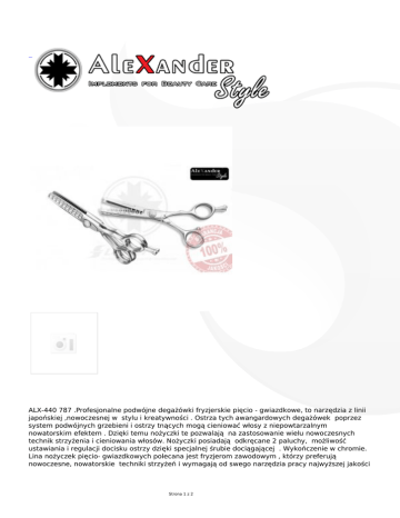 ALX-440 787 .Profesjonalne podwójne degażówki fryzjerskie pięcio - gwiazdkowe, to narzędzia z linii japońskiej ,nowoczesnej w stylu i kreatywności . Ostrza tych awangardowych degażówek poprzez system podwójnych grzebieni i ostrzy tnących mogą cieniować włosy z niepowtarzalnym nowatorskim efektem . Dzięki temu nożyczki te pozwalają na zastosowanie wielu nowoczesnych technik strzyżenia i cieniowania włosów. Nożyczki posiadają odkręcane 2 paluchy, możliwość ustawiania i regulacji docisku ostrzy dzięki specjalnej śrubie dociągającej . Wykończenie w chromie. Lina nożyczek pięcio- gwiazdkowych polecana jest fryzjerom zawodowym , którzy preferują nowoczesne, nowatorskie techniki strzyżeń i wymagają od swego narzędzia pracy najwyższej jakości Strona 1 z 2 . Profesjonalizm i najwyższa jakość nożyczek oparta jest na nowoczesnej niemieckiej technologii i linii produkcyjnej oraz najlepszej jakościowo stali japońskiej ,dzięki czemu narzędzie zapewnia długie profesjonalne użytkowanie bez konieczności szybkiej regeneracji ostrza. Stal użyta do wykonania narzędzi posiada niezbędne certyfikaty dla narzędzi chirurgiczno- stomatologicznych specyfikacja: - nożyczki 5-gwiazdkowe - nowoczesna profesjonalna linia . - podwójne grzebienie i ostrza tnące. -wykończenie- chrom . -odkręcane 2 paluchy. - system regulacji ustawień i docisku ostrzy. - długość ostrza 6". -stal nierdzewna 440. - podwyższone parametry twardości stali. - twardość do 54 HRC. - certyfikat CE , ISO. Strona 2 z 2