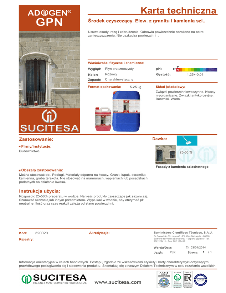 Karta techniczna Środek czyszczący. Elew. z granitu i kamienia szl.. Usuwa osady, rdzę i zabrudzenia. Odnawia powierzchnie narażone na ostre zanieczyszczenia. Nie uszkadza powierzchni . Właściwości fizyczne i chemiczne: Płyn przezroczysty pH: Kolor: Różowy Gęstość: Zapach: Charakterystyczny Wygląd: Format opakowania: 5-25 kg 1,25+-0,01 Skład jakościowy: Związki powierzchniowoczynne. Kwasy nieorganiczne. Związki antykorozyjne. Barwniki. Woda. Dawka: Zastosowanie: Firmy/Instytucje: Budownictwo. 25-50 % Fasady z kamienia szlachetnego Obszary zastosowania: Można stosować do:. Podłogi. Materiały odporne na kwasy. Granit, łupek, ceramika kamienna, gruba terakota. Nie stosować na marmurach, wapieniach lub posadzkach podatnych na działanie kwasu. Instrukcja użycia: Rozpuścić 25-50% preparatu w wodzie. Nanieść produkty czyszczące jak zazwyczaj. Szorować szczotką lub innym przedmiotem. Wypłukać w wodzie, aby otrzymać pH neutralne. Ilość oraz czas reakcji zależą od stanu powierzchni. Kod: 320020 Akredytacje: Suministros Científicos Técnicos, S.A.U. C/ Comadrán 39, nave A6 - P.I. Can Salvatella - 08210 Barberà del Vallés (Barcelona) – España (Spain) - Tel. 902 121411 - Fax. 902 121419 Rejestry: Wersja/Data: Język: PLK 2 / 03/01/2014 Strona: 1 / 1 Informacja orientacyjna w celach handlowych. Postępuj zgodnie ze wskazówkami etykiety i karty charakterystyki dotyczącymi prawidłowego posługiwania się i stosowania produktu. Skontaktuj się z naszym Działem Technicznym w celu rozwiania wszelkich www.sucitesa.com