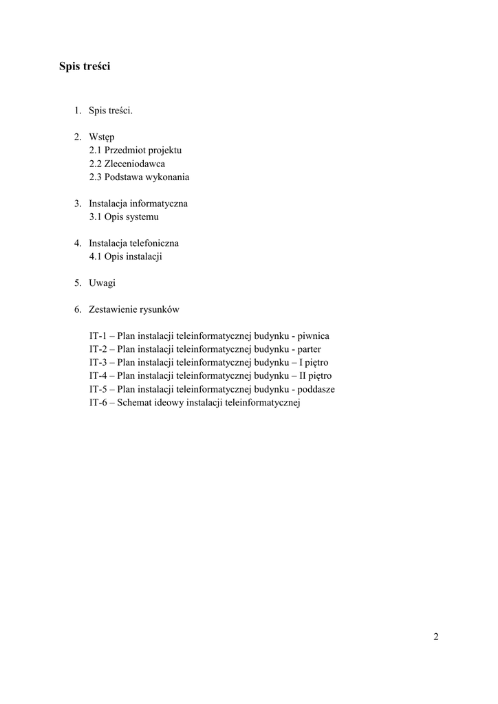 Spis treści 1. Spis treści. 2. Wstęp 2.1 Przedmiot projektu 2.2 Zleceniodawca 2.3 Podstawa wykonania 3. Instalacja informatyczna 3.1 Opis systemu 4. Instalacja telefoniczna 4.1 Opis instalacji 5. Uwagi 6. Zestawienie rysunków IT-1 – Plan instalacji teleinformatycznej budynku - piwnica IT-2 – Plan instalacji teleinformatycznej budynku - parter IT-3 – Plan instalacji teleinformatycznej budynku – I piętro IT-4 – Plan instalacji teleinformatycznej budynku – II piętro IT-5 – Plan instalacji teleinformatycznej budynku - poddasze IT-6 – Schemat ideowy instalacji teleinformatycznej 2 2. Wstęp 2.1 Przedmiot projektu Przedmiotem projektu jest instalacja informatyczna i telefoniczna w budynku w Połomi gm. Mszana przy ulicy Centralnej 93 dz. nr 2127/220. 2.2 Zleceniodawca Zleceniodawcą jest Gmina Mszana , ul. 1 Maja 81, 44-325 Mszana. 2.3 Podstawa wykonania Podstawą wykonania są: - podkłady architektoniczne koncepcji - wytyczne Inwestora - aktualnie obowiązujące normy i przepisy Założenia do opracowania koncepcji budowy sieci. − Zgodność z systemem okablowania strukturalnego dowolnego standardu renomowanej firmy. − Elastyczność rozbudowy i konfiguracji wraz z możliwością implementacji różnych technik sieciowych i systemu operacyjnego. − Odporność na błędy transmisji. − Zgodność z wymaganiami kat.5E. − Okablowanie strukturalne obejmuje swoim zakresem cztery kondygnacje budynku. − Okablowanie zapewnia warunki dla komputerowej obsługi wszystkich stanowisk pracy. − Okablowanie musi spełniać normy i zalecenia jakościowe w zakresie standardów sieci komputerowych. − Możliwość przesyłania sygnałów data, video, głosu. − Szafa krosownicza powinna być zabezpieczona przed dostępem osób nieuprawnionych oraz zapewnić możliwość instalację elementów aktywnych. 3 3. Instalacja informatyczna 3.1 Opis systemu Struktura logiczna okablowania strukturalnego. Struktura logiczna okablowania jest oparta na normie ISO/ICE IS 11801 dla sieci budynkowych. Jako implementację normy przyjęto system okablowania strukturalnego dowolnej renomowanej firmy. Centralnym punktem sieci jest główny węzeł dystrybucyjny CPD. Usługi teleinformatyczne w zależności od przyjętego rozwiązania mogą być rozprowadzane poprzez okablowanie do poszczególnych przyłączy telekomunikacyjnych. Okablowanie będzie wykonane z użyciem czteroparowego kabla kategorii 5E (o paśmie przenoszenia do 125 MHz). Przypisanie określonej usługi do przyłącza telekomunikacyjnego następuje poprzez połączenie paneli krosujących z odpowiednimi urządzeniami aktywnymi za pomocą kabli krosujących. Do połączenia końcowego (np. komputera lub telefonu) do przyłącza komunikacyjnego używane są kable stacyjne, za pomocą których dodatkowo realizuje się konwersję standardu połączeń okablowania strukturalnego na standard urządzenia końcowego (kable stacyjne są ściśle związane z używanym systemem i zazwyczaj niewymienny z innymi systemami). Zastosowane elementy. Kabel sygnałowy UTP kat.5E. Jako kabel sygnałowy dla sieci logicznej należy zastosować czteroparową, nieekranowaną skrętkę UTP o impedancji 100Ω. Kabel ten powinien być do 125MHz. (kategoria 5E). Kabel powinien spełniać wymogi UL444 dla typu MP lub CM i są certyfikowane jako typ PCC zgodnie CSA C22.2 nr 3. Kabel powinien spełniać normy ISO/IEC DIS 11801 i EIA/TIA 568, TSB36 dla kategorii 5E. Gniazdka RJ45. Należy zastosować gniazdka w puszkach pod tynk typu RJ45 kat.5E w konfiguracji PEL 2xRJ45+2x230V 16A. Zasilanie gniazdek elektrycznych wg projektu instalacji elektrycznej. Szafa dystrybucyjna i skrzynka kablowa przyłącza telekomunikacyjnego. Punkt dystrybucyjny CPD jest centrum całego okablowania strukturalnego. Przewiduje się lokalizację szafy CPD na poddaszu w pomieszczeniu technicznym. Szafa powinna posiadać konstrukcję trójdzielną, umożliwiającą serwisowanie zainstalowanych w niej urządzeń oraz przednie drzwi z przyciemnianej szyby (ułatwi wgląd w stan pracy urządzeń aktywnych. Powinna być zamykana na klucz co utrudni dostęp osobom nieupoważnionym. Głębokość szafy powinna być tak dobrana, aby 4 możliwe było zamontowanie w niej serwera, UPS-a oraz centralki telefonicznej. Szafę CPD należy uziemić przewodem LgY35 do uziomu głównego budynku UGT. Opis zastosowanego systemu oznaczeń. Każdy obwód logiczny został jednoznacznie oznakowany. W związku z tym identycznie zostały oznaczone gniazdka RJ45, porty na patch panelach i sam kabel UTP, jednolitym systemem oznaczeń. Biorąc pod uwagę specyfikę budynku, ilość punktów logicznych oraz założenia projektowe przyjęto poniższy system opisu poszczególnych elementów sieci. Oznaczenie punktu dystrybucyjnego Punkt dystrybucyjny oznakowano w następujący sposób: Główny punkt dystrybucyjny (poddasze) – CPD Oznaczenie kabli UTP oraz gniazd RJ45 W zależności gdzie doprowadzono kabel sygnałowy, należy go oznaczyć na obu końcach, jednoznacznym numerem. Oznaczenia poszczególnych punktów przedstawiają schematy rozmieszczeń PEL. Interpretacja jest następująca: 01/14 gdzie: 02-numer kondygnacji 14-kolejny numer przyłącza na kondygnacji Dla odróżnienia należy opisać gniazda komputerowe jako KOMP. a telefoniczne jako TEL. Opis zastosowanej topologii. Okablowanie strukturalne, zaprojektowano w topologii gwiazdy. Polega to na tym, że od głównego węzła dystrybucyjnego prowadzony do każdego punktu przyłączeniowego doprowadzony jest jeden , dedykowany dla tego przyłącza kabel UTP. Szczegółowe uwagi odnośnie prowadzenia kabla UTP. We wszystkich pomieszczeniach kable należy rozmieścić wg planu. Kable należy układać w ścianach pod tynkiem w rurach PCV RB20 wg przepisów i norm. Kable należy zakończyć w gniazdach montowanych podtynkowo. Wysokość montażu gniazda na ścianie to min. 30cm od podłogi. Miejsca montażu gniazd p/t na ścianie pokazano na rysunkach. W 