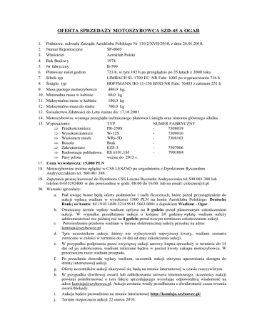 OFERTA SPRZEDAŻY MOTOSZYBOWCA SZD-45 A OGAR 1. 2. 3. 4. 5. 6. 7. 8. 9. 10. 11. 12. 13. 14. 15. 17. 18. 19. 20. Podstawa: uchwała Zarządu Aeroklubu Polskiego Nr 110/2/XVII/2010, z dnia 26.01.2010, Numer Rejestracyjny SP-0005 Właściciel Aeroklub Polski Rok Budowy 1974 Nr fabryczny B-599 Płatowiec nalot godzin 723 h, w tym 192 h po przeglądzie po 25 latach z 2000 roku Silnik typ LIMBACH SL 1700 EC NR Fabr. 1005 po wypracowaniu 716 h Śmigło typ HOFFMANN HO 11-150 B55D NR Fabr. 76403 z nalotem 251 h Masa pustego motoszybowca 480,0 kg, Minimalna masa w kabinie 60,0 kg Maksymalna masa w kabinie 180,0 kg Maksymalna masa do startu 700,0 kg Świadectwo Zdatności do Lotu ważne do: 17.10.2001 Motoszybowiec wymaga przeglądu technicznego płatowca i śmigła oraz remontu głównego silnika Wyposażenie: TYP NUMER FABRYCZNY Prędkościomierz PR-250S 7308019 Wysokościomierz W-12S 7309016 Wariometr mech. WRs-5D 7308103 Busola Brak Zakrętomierz EZS-3 7507006 Radiostacja pokładowa RS 6101.1M 7901084 Pasy pilota ważne do 2013 r. Cena wywoławcza: 15.000 PLN Motoszybowiec można oglądać w CSS LESZNO po uzgodnieniu z Dyrektorem Ryszardem Andryszczakiem tel. 500 081 388. Zapytania proszę kierować do Dyrektora CSS Leszno Ryszarda Andryszczaka tel.500 081 388 lub telefon 0-655292400 w dni powszednie w godz. 08:00 do 16:00 lub na email: [email protected] Warunki sprzedaży: a. Pod uwagę brane będą oferty podmiotów i osób fizycznych, które przed przystąpieniem do aukcji wpłacą wadium w wysokości 1500 PLN na konto Aeroklubu Polskiego: Deutsche Bank; nr konta: 84 1910 1048 2214 9911 5663 0001 z dopiskiem Wadium - Ogar. b. Ostateczny termin wpłaty wadium upływa na 8 godzin przed planowanym zakończeniem aukcji. W wypadku przedłużania aukcji o kolejne 24 godziny wpłatę wadium należy udokumentować nie później niż na 8 godzin przed nowym terminem zakończeniem aukcji. c. Potwierdzenie przelewu wadium w formie elektronicznej należy przesłać na adres [email protected] d. Tym uczestnikom aukcji, którzy nie wylicytowali najwyższej kwoty, wadium zostanie zwrócone w całości w terminie do 14 dni od daty zakończenia aukcji. e. W przypadku podpisania przez zwycięzcę aukcji umowy kupna-sprzedaży w terminie do 14 dni od jej zakończenia, wadium zaliczone będzie w poczet kwoty zakupu motoszybowca. W przeciwnym razie wadium przepada. f. Po przesłaniu dowodu wpłaty wadium, uczestnik aukcji otrzyma uprawnienia dostępu do strony internetowej aukcji. g. Oferty uczestników aukcji ukazywać się będą na stronie internetowej w czasie rzeczywistym. h. W przypadku chwilowej awarii lub zablokowania serwera internetowego, uczestnicy aukcji powinni poinformować o tym fakcie sprzedającego wysyłając odpowiednią wiadomość na adres [email protected]. Aukcja zostanie wtedy przedłużona o dwukrotność czasu trwania awarii/blokady. i. Aukcja będzie prowadzona na stronie internetowej http://komisja.szybowce.pl/ j. Termin rozpoczęcia aukcji 22 marca 2010. k. l. Termin zakończenia aukcji 22 maja 2010 godzina 20:00. Minimalne postąpienie w aukcji do dnia 21 maja do godziny 20:00 wynosi 200 zł. Po godzinie 20:00 dnia 21 maja minimalne postąpienie wynosi 500 zł. m. Jeśli w ciągu 24 godzin poprzedzających planowane zakończenie aukcji złożona zostanie oferta przewyższająca o minimum 500 zł ostatnią, termin zakończenia aukcji będzie przedłużony o kolejne 24 godziny. n. Jedynym kryterium oceny oferty będzie uzyskanie jak najwyższej ceny. o. Motoszybowiec będzie sprzedany uczestnikowi aukcji, który zaoferuje najwyższą kwotę oraz podpisze umowę kupna-sprzedaży wraz z dokonaniem płatności w terminie do 14 dni włącznie od daty zakończenia aukcji. Nie podpisanie umowy w podanych terminach lub nie wywiązanie się z terminów zawartych w umowie powoduje utratę prawa do zwrotu wadium i upoważnia Aeroklub Polski do wycofania się z podpisania umowy lub wypowiedzenia umowy. p. W przypadku, gdy zwycięzcą aukcji zostanie Aeroklub Regionalny, będzie przysługiwała mu 10% bonifikata od wylicytowanej ceny (zapłaci tylko 90%), pod warunkiem zawarcia w umowie kupna-sprzedaży motoszybowca następującego warunku: AR zobowiązany jest przez okres wynoszący co najmniej 36 miesięcy od daty zawarcia umowy sprzedaży do nie przenoszenia prawa własności motoszybowca na rzecz osób trzecich. W przypadku naruszenia tegoż zobowiązania, AR zobowiązany jest zapłacić na rzecz AP w terminie 14 dni od daty stwierdzenia naruszenia, karę umowną w wysokości równowartości udzielnej bonifikaty, tj. kwotę ... zł. q. r. W wypadku, kiedy zwycięska oferta będzie niższa od ceny minimalnej, Aeroklub Polski ma prawo unieważnić aukcję. Cena minimalna będzie opublikowana niezwłocznie po jej przekroczeniu. Wadium zostanie wtedy zwrócone w całości w terminie do 7 dni od daty unieważnienia aukcji. Umowa kupna – sprzedaży motoszybowca będzie zawierała zapis o zrzeczeniu się przez Kupującego wobec Sprzedającego roszczeń z tytułu nabycia motoszybowca, w tym wynikających z przepisów Kodeksu Cywilnego o rękojmi. 21. Aeroklub Polski zastrzega sobie prawo odstąpienia od sprzedaży motoszybowca bez podania przyczyny. Sekretarz Generalny Aeroklubu Polskiego