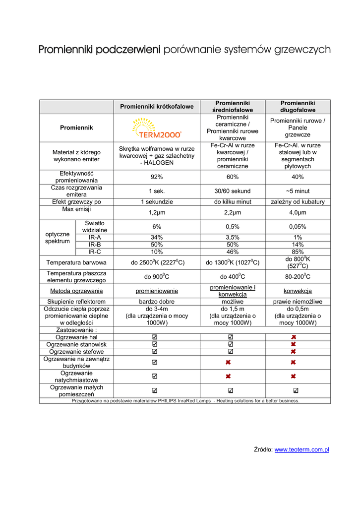 Promienniki podczerwieni porównanie systemów grzewczych Promienniki krótkofalowe Promiennik Materiał z którego wykonano emiter Efektywność promieniowania Czas rozgrzewania emitera Efekt grzewczy po Max emisji Skrętka wolframowa w rurze kwarcowej + gaz szlachetny - HALOGEN Promienniki średniofalowe Promienniki ceramiczne / Promienniki rurowe kwarcowe Fe-Cr-Al w rurze kwarcowej / promienniki ceramiczne Promienniki długofalowe Promienniki rurowe / Panele grzewcze Fe-Cr-Al. w rurze stalowej lub w segmentach płytowych 92% 60% 40% 1 sek. 30/60 sekund ~5 minut 1 sekundzie do kilku minut zależny od kubatury 1,2µm 2,2µm 4,0µm 6% 0,5% 0,05% 34% 50% 10% 3,5% 50% 46% Temperatura barwowa do 25000K (22270C) do 13000K (10270C) 1% 14% 85% do 8000K (5270C) Temperatura płaszcza elementu grzewczego do 9000C do 4000C Metoda ogrzewania promieniowanie Skupienie reflektorem Odczucie ciepła poprzez promieniowanie cieplne w odległości Zastosowanie : Ogrzewanie hal Ogrzewanie stanowisk Ogrzewanie stefowe Ogrzewanie na zewnątrz budynków Ogrzewanie natychmiastowe Ogrzewanie małych pomieszczeń bardzo dobre do 3-4m (dla urządzenia o mocy 1000W) optyczne spektrum Światło widzialne IR-A IR-B IR-C 80-2000C promieniowanie i konwekcja możliwe do 1,5 m (dla urządzenia o mocy 1000W) konwekcja prawie niemożliwe do 0,5m (dla urządzenia o mocy 1000W) Przygotowano na podstawie materiałów PHILIPS InraRed Lamps - Heating solutions for a belter business. Źródło: www.teoterm.com.pl