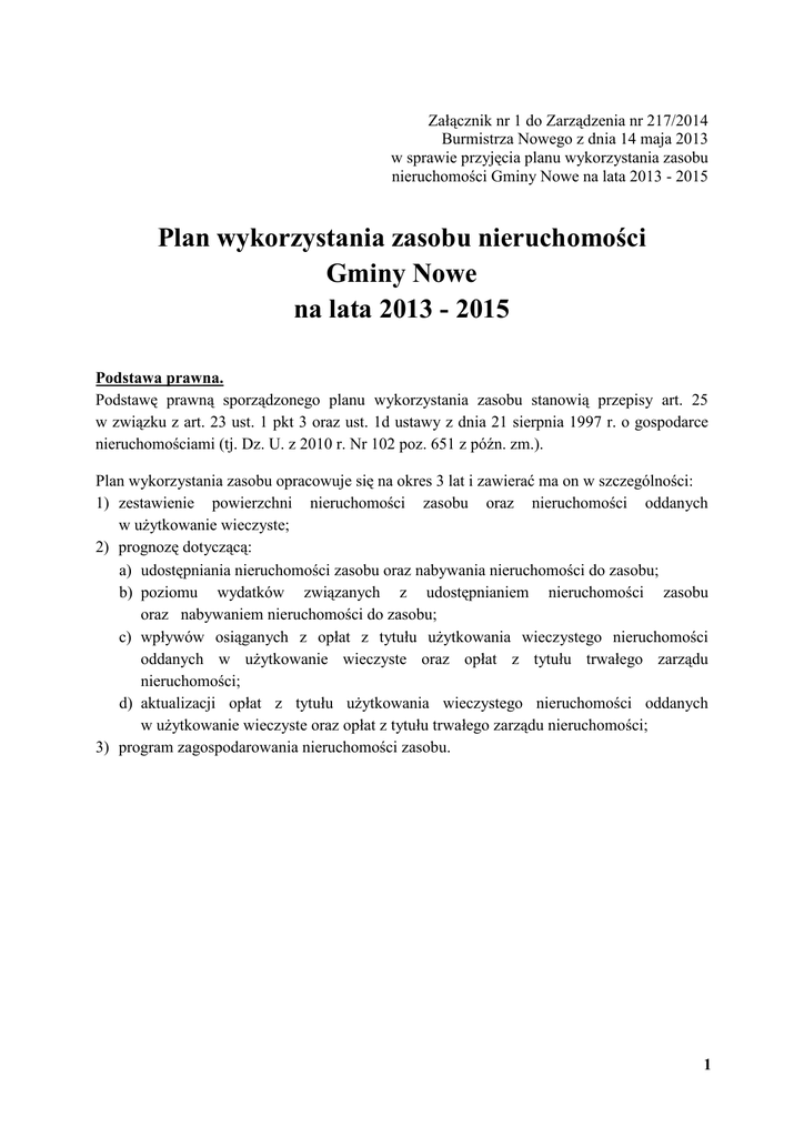 Załącznik nr 1 do Zarządzenia nr 217/2014 Burmistrza Nowego z dnia 14 maja 2013 w sprawie przyjęcia planu wykorzystania zasobu nieruchomości Gminy Nowe na lata 2013 - 2015 Plan wykorzystania zasobu nieruchomości Gminy Nowe na lata 2013 - 2015 Podstawa prawna. Podstawę prawną sporządzonego planu wykorzystania zasobu stanowią przepisy art. 25 w związku z art. 23 ust. 1 pkt 3 oraz ust. 1d ustawy z dnia 21 sierpnia 1997 r. o gospodarce nieruchomościami (tj. Dz. U. z 2010 r. Nr 102 poz. 651 z późn. zm.). Plan wykorzystania zasobu opracowuje się na okres 3 lat i zawierać ma on w szczególności: 1) zestawienie powierzchni nieruchomości zasobu oraz nieruchomości oddanych w użytkowanie wieczyste; 2) prognozę dotyczącą: a) udostępniania nieruchomości zasobu oraz nabywania nieruchomości do zasobu; b) poziomu wydatków związanych z udostępnianiem nieruchomości zasobu oraz nabywaniem nieruchomości do zasobu; c) wpływów osiąganych z opłat z tytułu użytkowania wieczystego nieruchomości oddanych w użytkowanie wieczyste oraz opłat z tytułu trwałego zarządu nieruchomości; d) aktualizacji opłat z tytułu użytkowania wieczystego nieruchomości oddanych w użytkowanie wieczyste oraz opłat z tytułu trwałego zarządu nieruchomości; 3) program zagospodarowania nieruchomości zasobu. 1 1. Zestawienie powierzchni nieruchomości zasobu oraz nieruchomości oddanych w użytkowanie wieczyste. Stan na dzień 1 stycznia 2013 r. L.p 1 2 3 4 5 6 7 8 9 10 11 12 13 14 15 16 17 18 Obręb ewidencyjny Gajewo Gajewo-Zabudowania Głodowo Kończyce Kozielec Lipinki Mały Komorsk Mątawy Milewko Morgi Osiny Pastwiska i Piaski Rychława Tryl Twarda Góra Zdrojewo Nowe Grunty oddane w użytkowanie wieczyste Razem: Pow. w ha 7,9547 7,2588 12,2479 9,2801 32,8564 0,1078 26,8521 15,2888 9,6909 11,4540 10,8728 2,8153 5,4902 31,6360 17,7261 12,1235 73,9147 34,8426 322,4127 2. Prognoza: a. dotycząca udostępniania nieruchomości do zasobu. nieruchomości zasobu oraz nabywania Udostępnianie nieruchomości następować będzie poprzez sprzedaż, zamianę, oddanie w użytkowanie wieczyste, trwały zarząd, dzierżawę, najem, użyczenie, a także przekazanie w formie darowizny - zgodnie z obowiązującymi w tym zakresie przepisami prawa. Nabywanie nieruchomości na rzecz Gminy Nowe następować będzie w drodze kupna, darowizny, zamiany lub w innych formach przewidzianych prawem w związku z koniecznością realizacji zadań własnych, obowiązkami wynikającymi z przepisów szczególnych oraz realizacją innych celów publicznych. Przewiduje się, że w wyniku prowadzonej regulacji stanów prawnych nieruchomości zajętych pod drogi, powierzchnia gruntów wchodzących w skład zasobu będzie się powiększać. Trudna do określenia jest wielkość powierzchni, jaka w ciągu najbliższych trzech lat obowiązywania planu może wejść do zasobu - zależy to od ilości ujawnionych przypadków zajęcia nieruchomości prywatnych pod drogi, czasu trwania postępowań w sprawie uregulowania stanu prawnego oraz od budżetu gminy. W związku z planowaną inwestycją budowy drogi gminnej Osiny – Głodowo do zasobu nieruchomości, do końca 2015 roku, wejdzie ok. 3,70ha gruntów. 2 Ponadto przewiduje się: - regulowanie stanów prawnych nieruchomości należących do Gminy Nowe. Proces ten polegać będzie na zakładaniu ksiąg wieczystych, oraz na ujawnianiu w już założonych księgach wieczystych prawa własności Gminy Nowe; - dokonywanie podziałów oraz innych regulacji geodezyjnych granic działek będących własnością Gminy Nowe (np. wznawianie granic, rozgraniczenia, połączenia działek); - oddawanie nieruchomości w trwały zarząd lub w użyczenie dla podległych jednostek w miarę potrzeb. b. poziomu wydatków związanych z udostępnianiem nieruchomości zasobu oraz nabywaniem nieruchomości do zasobu. W 2013 r. planuje się przeznaczyć kwotę 80 000,00zł na zakup usług związanych z udostępnianiem nieruchomości z zasobu. Kwota ta przeznaczona jest między innymi na zakup usług geodezyjnych, usług rzeczoznawcy majątkowego, na opłaty sądowe i administracyjne, ogłoszenia w prasie. W latach 2014 - 2015 planuje się utrzymanie wydatków z tytułu gospodarowania zasobem Gminy Nowe na podobnym poziomie jak w roku 2013. W roku 2013 r. przeznaczono na zakup nieruchomości kwotę 50 000,00zł. W roku 2014 planuje się przeznaczyć na zakup nieruchomości kwotę 100 000,00zł, a w roku 2015 150 000,00zł. W roku 2013 nie zaplanowano środków na wypłatę odszkodowań za przejęte nieruchomości w drodze administracyjnej. W roku 2014 planuje się przeznaczać na ten cel kwotę 100 000,00zł. W roku 2015 również kwotę 100 000,00zł. c. wpływów osiąganych z opłat z tytułu użytkowania wieczystego nieruchomości oddanych w użytkowanie wieczyste oraz opłat z tytułu trwałego zarządu nieruchomości. W roku 2013 planuje się wpływ z tytułu opłat rocznych za użytkowanie wieczyste na poziomie 50 000,00zł. W kolejnych latach wpływ ten powinien rosnąć, ponieważ Gmina Nowe zamierza dokonywać w latach 2013 – 2015 i następnych sukcesywnej aktualizacji opłat rocznych za użytkowanie wieczyste. Nie przewiduje się oddawania kolejnych nieruchomości w użytkowanie wieczyste. Wpływy z tytułu trwałego zarządu w roku 2013, to kwota 67,17zł. W kolejnych latach wpływ ten będzie na tym samy poziomie. Odpłatny trwały zarząd ustanowionym jest na rzecz jednego podmiotu – Miejsko – Gminnego Ośrodka Pomocy Społecznej. Pozostałe trwałe zarządy są nieodpłatne, zostały ustanowione na rzecz placówek oświatowych. d. aktualizacji opłat z tytułu użytkowania wieczystego nieruchomości Gminy Nowe oddanych w użytkowanie wieczyste oraz opłat z tytułu trwałego zarządu nieruchomości Gminy Nowe. Wskutek aktualizacji opłat rocznych za użytkowanie wieczyste gruntów w latach 2013 - 2015 przewiduje się wzrost wpływów o ok. 5% w każdym roku. Planuje się w roku