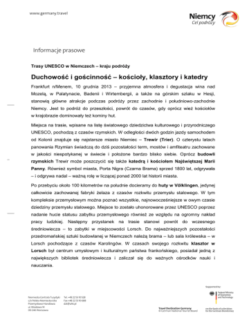 www.germany.travel Informacje prasowe Trasy UNESCO w Niemczech – kraju podróży Duchowość i gościnność – kościoły, klasztory i katedry Frankfurt n/Menem, 10 grudnia 2013 – przyjemna atmosfera i degustacja wina nad Mozelą, w Palatynacie, Badenii i Wirtembergii, a także na górskim szlaku w Hesji, stanowią główne atrakcje podczas podróży przez zachodnie i południowo-zachodnie Niemcy. Jest to podróż do przeszłości, powrót do czasów, gdy oprócz wież kościołów w krajobrazie dominowały też kominy hut. Miejsca na trasie, wpisane na listę światowego dziedzictwa kulturowego i przyrodniczego UNESCO, pochodzą z czasów rzymskich. W odległości dwóch godzin jazdy samochodem od Kolonii znajduje się najstarsze miasto Niemiec – Trewir (Trier). O czterystu latach panowania Rzymian świadczą do dziś pozostałości term, mostów i amfiteatru zachowane w jakości niespotykanej w świecie i położone bardzo blisko siebie. Oprócz budowli rzymskich Trewir może poszczycić się także katedrą i kościołem Najświętszej Marii Panny. Również symbol miasta, Porta Nigra (Czarna Brama) sprzed 1800 lat, odgrywała – i odgrywa nadal – ważną rolę w liczącej ponad 2000 lat historii miasta. Po przebyciu około 100 kilometrów na południe docieramy do huty w Völklingen, jedynej całkowicie zachowanej fabryki żelaza z czasów rozkwitu przemysłu stalowego. W tym kompleksie przemysłowym można poznać wszystkie, najnowocześniejsze w owym czasie dziedziny przemysłu stalowego. Miejsce to zostało uhonorowane przez UNESCO poprzez nadanie hucie statusu zabytku przemysłowego również ze względu na ogromny nakład pracy ludzkiej. Następny przystanek na trasie stanowi powrót do wczesnego średniowiecza – to zabytki w miejscowości Lorsch. Do najważniejszych pozostałości przedromańskiej sztuki budowlanej w Niemczech należą brama – lub sala królewska – w Lorsch pochodzące z czasów Karolingów. W czasach swojego rozkwitu klasztor w Lorsch był centrum umysłowym i kulturalnym państwa frankońskiego, posiadał jedną z największych bibliotek średniowiecza i zaliczał się do ważnych ośrodków nauki i nauczania. Niemiecka Centrala Turystyki c/o Polsko-Niemiecka Izba Przemysłowo-Handlowa ul. Miodowa 14 00-246 Warszawa Tel. +48 22 53 10 528 Fax +48 22 53 10 688 [email protected] www.germany.travel W drodze na południe wkrótce pojawiają się sięgające nieba strzeliste wieże katedry w Spirze (Speyer). Ta cesarska katedra uważana jest za najważniejsze dzieło romańskiej sztuki budowlanej w Niemczech, a jej plan podstawowy miał duży wpływ na architekturę romańską XI i XII wieku. Trasa prowadzi dalej przez Heidelberg z jego słynnym zamkiem do najlepiej zachowanego kompleksu klasztornego na północ od Alp - klasztoru w Maulbronn. Turyści mogą tutaj szczegółowo poznać życie codzienne zakonu cystersów od XII do XVI wieku. W 2014 roku klasztor w Maulbronn będzie obchodzić jubileusz 20lecia wpisania na listę UNESCO. Końcowym przystankiem na trasie jest miasto przemysłu samochodowego - Stuttgart. O GNTB Niemiecka Centrala Turystyki (niem. DZT = Deutsche Zentrale für Tourismus, ang. GNTB = German National Tourist Board) to narodowa „izba turystyki” Niemiec z siedzibą główną we Frankfurcie nad Menem. Centrala zajmuje się promowaniem Niemiec jako kraju turystycznego na zlecenie Federalnego Ministerstwa Gospodarki i Technologii (BMWi), które wspiera ją na mocy uchwały niemieckiego Bundestagu. GNTB zajmuje się tworzeniem strategii i produktów oraz działaniami marketingowymi w celu dalszego umocnienia pozytywnego wizerunku Niemiec za granicą jako celu podróży oraz wspierania turystyki niemieckiej. GNTB posiada 30 przedstawicielstw zagranicznych na całym świecie. Więcej informacji można znaleźć w naszym internetowym centrum prasowym na stronie www.germany.travel/presse. Niemiecka Centrala Turystyki c/o Polsko-Niemiecka Izba Przemysłowo-Handlowa ul. Miodowa 14 00-246 Warszawa Tel. +48 22 53 10 528 Fax +48 22 53 10 688 [email protected]