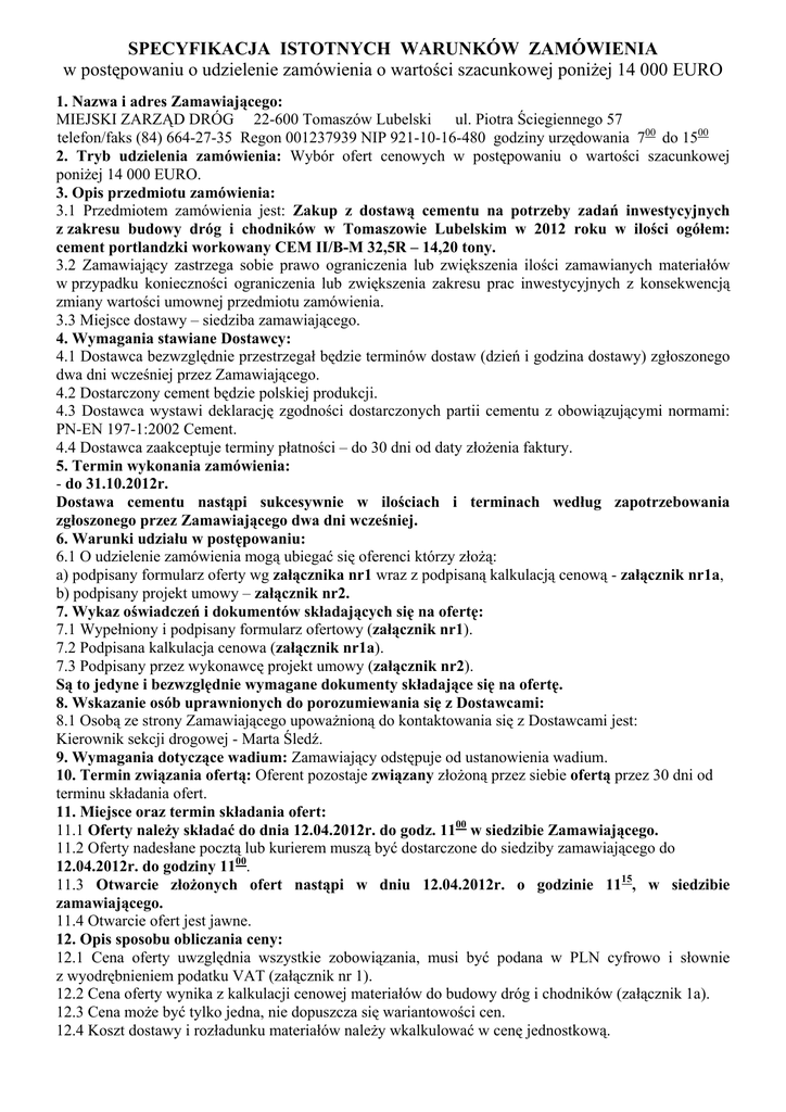 SPECYFIKACJA ISTOTNYCH WARUNKÓW ZAMÓWIENIA w postępowaniu o udzielenie zamówienia o wartości szacunkowej poniżej 14 000 EURO 1. Nazwa i adres Zamawiającego: MIEJSKI ZARZĄD DRÓG 22-600 Tomaszów Lubelski ul. Piotra Ściegiennego 57 telefon/faks (84) 664-27-35 Regon 001237939 NIP 921-10-16-480 godziny urzędowania 700 do 1500 2. Tryb udzielenia zamówienia: Wybór ofert cenowych w postępowaniu o wartości szacunkowej poniżej 14 000 EURO. 3. Opis przedmiotu zamówienia: 3.1 Przedmiotem zamówienia jest: Zakup z dostawą cementu na potrzeby zadań inwestycyjnych z zakresu budowy dróg i chodników w Tomaszowie Lubelskim w 2012 roku w ilości ogółem: cement portlandzki workowany CEM II/B-M 32,5R – 14,20 tony. 3.2 Zamawiający zastrzega sobie prawo ograniczenia lub zwiększenia ilości zamawianych materiałów w przypadku konieczności ograniczenia lub zwiększenia zakresu prac inwestycyjnych z konsekwencją zmiany wartości umownej przedmiotu zamówienia. 3.3 Miejsce dostawy – siedziba zamawiającego. 4. Wymagania stawiane Dostawcy: 4.1 Dostawca bezwzględnie przestrzegał będzie terminów dostaw (dzień i godzina dostawy) zgłoszonego dwa dni wcześniej przez Zamawiającego. 4.2 Dostarczony cement będzie polskiej produkcji. 4.3 Dostawca wystawi deklarację zgodności dostarczonych partii cementu z obowiązującymi normami: PN-EN 197-1:2002 Cement. 4.4 Dostawca zaakceptuje terminy płatności – do 30 dni od daty złożenia faktury. 5. Termin wykonania zamówienia: - do 31.10.2012r. Dostawa cementu nastąpi sukcesywnie w ilościach i terminach według zapotrzebowania zgłoszonego przez Zamawiającego dwa dni wcześniej. 6. Warunki udziału w postępowaniu: 6.1 O udzielenie zamówienia mogą ubiegać się oferenci którzy złożą: a) podpisany formularz oferty wg załącznika nr1 wraz z podpisaną kalkulacją cenową - załącznik nr1a, b) podpisany projekt umowy – załącznik nr2. 7. Wykaz oświadczeń i dokumentów składających się na ofertę: 7.1 Wypełniony i podpisany formularz ofertowy (załącznik nr1). 7.2 Podpisana kalkulacja cenowa (załącznik nr1a). 7.3 Podpisany przez wykonawcę projekt umowy (załącznik nr2). Są to jedyne i bezwzględnie wymagane dokumenty składające się na ofertę. 8. Wskazanie osób uprawnionych do porozumiewania się z Dostawcami: 8.1 Osobą ze strony Zamawiającego upoważnioną do kontaktowania się z Dostawcami jest: Kierownik sekcji drogowej - Marta Śledź. 9. Wymagania dotyczące wadium: Zamawiający odstępuje od ustanowienia wadium. 10. Termin związania ofertą: Oferent pozostaje związany złożoną przez siebie ofertą przez 30 dni od terminu składania ofert. 11. Miejsce oraz termin składania ofert: 11.1 Oferty należy składać do dnia 12.04.2012r. do godz. 1100 w siedzibie Zamawiającego. 11.2 Oferty nadesłane pocztą lub kurierem muszą być dostarczone do siedziby zamawiającego do 12.04.2012r. do godziny 1100. 11.3 Otwarcie złożonych ofert nastąpi w dniu 12.04.2012r. o godzinie 1115, w siedzibie zamawiającego. 11.4 Otwarcie ofert jest jawne. 12. Opis sposobu obliczania ceny: 12.1 Cena oferty uwzględnia wszystkie zobowiązania, musi być podana w PLN cyfrowo i słownie z wyodrębnieniem podatku VAT (załącznik nr 1). 12.2 Cena oferty wynika z kalkulacji cenowej materiałów do budowy dróg i chodników (załącznik 1a). 12.3 Cena może być tylko jedna, nie dopuszcza się wariantowości cen. 12.4 Koszt dostawy i rozładunku materiałów należy wkalkulować w cenę jednostkową. 12.5 Cena jednostkowa dostarczanych materiałów może ulec zmianie jedynie w przypadku zmiany cen cementu przez producenta w okresie realizacji zamówienia. 12.6 W przypadku zmiany relacji cenowych na niekorzyść zamawiającego spowodowanych ruchem cen, zamawiający będzie miał prawo wypowiedzieć umowę ze skutkiem na koniec miesiąca, w którym zostanie ona wypowiedziana. 12.7 Wartość ogólna zamówienia może ulec zmianie w przypadku konieczności zmiany ilości cementu wynikłej ze zmiany zakresu prac inwestycyjnych i zaakceptowanej przez zamawiającego zmiany ceny jednostkowej spowodowanej zmianą ceny przez producenta. 13. Opis kryteriów, którymi Zamawiający będzie kierował się przy wyborze oferty: 13.1 Zamawiający uzna oferty za spełniające wymagania i przyjmie do szczegółowego rozpatrzenia jeżeli: a) oferta – co do formy opracowania i treści spełnia wymagania określone w specyfikacji, b) z liczby i treści złożonych dokumentów wynika, że wykonawca spełnia warunki formalne określone niniejszą specyfikacją, c) oferta złożona została w określonym przez zamawiającego terminie. 13.2 Jako kryterium wyboru oferty przyjmuje się kryterium najkorzystniejszej ceny. 13.3 Oferta która przedstawia najniższą cenę zostanie uznana za najkorzystniejszą. 14. Wymagania dotyczące zabezpieczenia należytego wykonania umowy: 14.1 Odstępuje się od wniesienia zabezpieczenia należytego wykonania umowy. 15. Istotne dla stron postanowienia, które zostaną wprowadzone do treści zawieranej umowy: 15.1 Projekt umowy stanowi załącznik nr2 do niniejszej specyfikacji. 15.2 Dopuszczalne zmiany postanowień umowy: a) w przypadku przedłużania się procedury wyboru najkorzystniejszej oferty dopuszcza się przesunięcie terminu realizacji zamówienia, b) zmniejszenie lub zwiększenie zakresu zamówienia, c) zmiana ceny jednostkowej cementu spowodowana zmianą ceny przez producenta, d) zmiana wysokości wynagrodzenia umownego w związku z okolicznościami wymienionymi w punkcie 15.2 lit. b) i c), e) w przypadku wystąpienia niekorzystnych warunków atmosferycznych uniemożliwiających realizację zadania dopuszcza się przesunięcie terminu realizacji zamówienia, f) wynagrodzenie wykonawcy określone w umowie może ulec zmianie w przypadku ustawowej zmiany podatku VAT, g) zmiana wynikająca ze zmiany danych podmiotowych wykonawcy, h) gdy konieczność wprowadzenia zmian wynika z okoliczności, których nie moż