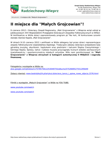 Urząd Gminy Radziechowy-Wieprz 34-381 Radziechowy, Wieprz 700 tel. 33 867 66 10, fax. 33 867 66 13 e-mail: [email protected] www.radziechowy-wieprz.pl Aktualności › II miejsce dla "Małych Grojcowian"! II miejsce dla "Małych Grojcowian"! 9 czerwca 2012 r Dziecięcy Zespół Regionalny „Mali Grojcowianie” z Wieprza wziął udział w Jubileuszowym XXV Wojewódzkim Przeglądzie Dziecięcych Zespołów Folklorystycznych w WIŚLE. W Amfiteatrze w Wiśle dzieci zaprezentowały program pt.”Na holi„ W konkursowe szranki stanęła również Kapela „Mali Grojcowianie”. W dniach 9-10 czerwca 2012 r.amfiteatr w Wiśle oblegany był przez dzieci reprezentujące zespoły folklorystyczne województwa śląskiego. Tradycyjne zabawy dziecięce przeplatane były góralską muzyką, obyrtkami, hajdukami oraz pieśniami i tańcami Śląska Cieszyńskiego i Górnego Śląska. Śpiewy, tańce i ludowa muzyka przyciągnęły licznych widzów zachwyconych żywiołowością i spontanicznością młodych artystów. Miło nam poinformować że "Mali Grojcowianie" z Wieprza otrzymali w kategorii autentycznej II MIEJSCE i nagrodę finansową. Fotogaleria z występów w Wiśle na: plus.google.com/photos/117579575612253049755/albums/5752669527551295649 Zobacz również: www.beskidzka24.pl/artykul,dzieciece_tance_i_spiew_nowe_zdjecia,1576.html Filmiki z występów „Małych Grojcowian” w Wiśle na YOU TUBE: www.youtube.com/watch www.youtube.com/watch http://www.radziechowy-wieprz.pl/aktualnosci/ii-miejsce-dla-malych-grojcowian,86 Strona 1