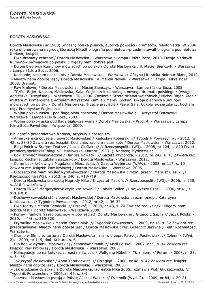 Dorota Masłowska Nadesłał Edyta Dobek DOROTA MASŁOWSKA Dorota Masłowska (ur.1983) – polska pisarka, autorka powieści i dramatów, felietonistka. W 2006 roku uhonorowana nagrodą literacką Nike.Bibliografia podmiotowo-przedmiotowaBibliografia podmiotowa – książki - Dwa dramaty zebrane / Dorota Masłowska. - Warszawa : Lampa i Iskra Boża, 2010. Dwoje biednych Rumunów mówiących po polsku ; Między nami dobrze jest - Dwoje biednych Rumunów mówiących po polsku / Dorota Masłowska ; il. Maciej Sieńczyk. - Warszawa : Lampa i Iskra Boża, 2006. - Kochanie, zabiłam nasze koty / Dorota Masłowska. - Warszawa : Oficyna Literacka Noir sur Blanc, 2012. - Między nami dobrze jest / Dorota Masłowska ; il. Marcin Nowak. - Warszawa : Lampa i Iskra Boża, 2008. Dramat. - Paw królowej / Dorota Masłowska ; il. Maciej Sieńczyk. - Warszawa : Lampa i Iskra Boża, 2005. - TR/PL: Bajer, Kochan, Masłowska, Sala, Wojcieszek : antologia nowego dramatu polskiego / [wstęp Agnieszka Tuszyńska]. - Warszawa : TR, 2006. Zawiera : Strefa działań wojennych / Michał Bajer. Argo : misterium komercyjne z udziałem Krzysztofa Kamila / Marek Kochan. Dwoje biednych Rumunów mówiących po polsku / Dorota Masłowska. Trzecie przyjście / Paweł Sala. Cokolwiek się zdarzy, kocham cię / Przemysław Wojcieszek. - Wojna polsko-ruska : pod flagą biało-czerwoną / Dorota Masłowska ; il. Krzysztof Ostrowski. Warszawa : Lampa i Iskra Boża, 2003. - Wojna polsko-ruska pod flagą biało-czerwoną / Dorota Masłowska. - Wyd. 4. - Warszawa : Lampa i Iskra Boża Paweł Dunin-Wąsowicz, 2009. Bibliografia przedmiotowa – artykuły z czasopism - Amerykańska odyseja : powrót Masłowskiej / Radosław Kobierski. // Tygodnik Powszechny. - 2012, nr 42, s. 38-39 Zawiera rec. książki: Kochanie, zabiłam nasze koty / Dorota Masłowska. - Warszawa, 2012. - Blogi Polek w Starym Teatrze / Jacek Cieślak. // // Rzeczpospolita (W3). - 2008, nr 224, s. A20 Przed premierą spektaklu "blogi.pl". Masłowska, Dorota (1983- ). – Mydziecisieci - Boki zrywać? Niekoniecznie / Dariusz Nowacki. // Gazeta Wyborcza. - 2012, nr 242, s. 13 Zawiera rec. książki: Kochanie, zabiłam nasze koty / Dorota Masłowska. - Warszawa, 2012. - Come back królewny / Magdalena Miecznicka. // Gazeta Wyborcza (WAW). - 2005, nr 117, s. 10 Zawiera rec. książki: Paw królowej / Dorota Masłowska. - Warszawa, 2005. - Dlaczego nie mam myśleć Rymkiewiczem? / Dorota Masłowska ; rozm. przepr. Mariusz Cieślik. // Rzeczpospolita (W3). - 2012, nr 240, s. P18-P19 - Dorota Masłowska laureatką Nagrody Nike / Krzysztof Masłoń. // Rzeczpospolita (W3). - 2006, nr 230, s. A10 Paw królowej - Dorota "Nike" Margaryńczak czyli: kto zawinił? / Robert Stiller. // Najwyższy Czas!. - 2006, nr 41, s. XVIII-XIX - Duchowy szwedzki stół : powrót Masłowskiej / Dorota Masłowska ; rozm. przepr. Katarzyna Kubisiowska. // Tygodnik Powszechny. - 2012, nr 42, s. 36-37 - Dwa teatry / Marcin Sendecki. // Przekrój. - 2008, nr 48, s. 70 Zawiera rec. książki: Między nami dobrze jest / Dorota Masłowska. - Warszawa 2008. - Formy i funkcje frazeologizmów w powieściach Doroty Masłowskiej / Grzegorz Szpila.// Język Polski. 2010, nr 4/5, s. 310-320 - Frymuśna Masłowska / Marcin Kościelniak. // Tygodnik Powszechny. - 2009, nr 16, s. 32 Zawiera rec. przedstawienia: Między nami dobrze jest / Dorota Masłowska ; reż. Grzegorz Jarzyna ; Teatr Rozmaitości, Warszawa. - Granie w filmie to tortura / Dorota Masłowska ; rozm. przepr. Patrycja Pustkowiak. // Dziennik (Wyd. 2). - 2009, nr 119, dod. Kultura, s. 6 - Hip hop w wydaniu Masłowskiej / Stanisław Stanik. // Myśl Polska. - 2007, nr 5, s. 14 Zawiera rec. książki: Paw królowej / Dorota Masłowska. - Warszawa, 2005. - Halucynacje po narkotykach : nasi na świecie / Wolfgang Höbel. - Tł. z niem. // Forum. - 2008, nr 28, s. 34-35 - Jak czytać Masłowską? / Anna Tatarkiewicz. // Przegląd. - 2008, nr 48, s. 42 Zawiera rec. książki: Między nami dobrze jest / Dorota Masłowska. - Warszawa, 2008. - Jak urodzenie dziecka : z Dorotą Masłowską, laureatką Nike 2006, rozmawia Piotr Gruszczyński. // Tygodnik Powszechny. - 2006, nr 42, s. 8-9 - Jarzyna i Masłowska pytają o Polskę / Jacek Wakar. // Dziennik (Wyd. 2). - 2009, nr 84, s. 20-21 http://www.bp.ostroleka.pl/testowy - Serwis Biblioteki Pedagogicznej w Ostrołęce Powered by Mambo Generated: 2 March, 2017, 23:13 Zawiera rec. przedstawienia: Między nami dobrze jest / Dorota Masłowska ; reż. Grzegorz Jarzyna ; Teatr Rozmaitości, Warszawa. - Jestem bogiem rzeczy małych / Dorota Masłowska ; rozm. przepr. Katarzyna Szurmiak-Domańska. - ( Twarze ) // Gazeta Wyborcza. - 2012, nr 246, dod. Wysokie Obcasy nr 42, s. 33-36 - Język "Pawia królowej" Doroty Masłowskiej / Marek Ruszkowski.// Poradnik Językowy. - 2007, nr 7, s. 19-29 - Korpusy kobiece (ale nie wojskowe) / Bożena Umińska. // Przegląd. - 2005, nr 28, s. 44-45 - Ludzie plują perłami / Dorota Masłowska ; rozm. przepr. Monika Małkowska, Paulina Wilk // Rzeczpospolita (W3). - 2006, nr 201, s. A18 - Masłowska : przy obieraniu cebuli / Dorota Masłowska ; rozm. przepr. Robert Mazurek. // Przekrój. 2010, nr 52, s. 26-29 - Masłowska i smutni 30-letni / Piotr Gociek. // Uważam Rze. - 2012, nr 43, s. 46-48 Zawiera rec. książki: Kochanie, zabiłam nasze koty / Dorota Masłowska. - Warszawa, 2012. - Masłowska. Jedna z miliona / Jacek Cieślak. // Rzeczpospolita (W3). - 2009, nr 97, s. A20-A21 Wokół berlińskiej premiery sztuki "Między nami dobrze jest". - Masłowska: jesteśmy tylko kostiumami / Dorota Masłowska ; rozm. przepr. Sławomir Sierakowski. // Gazeta Wyborcza. - 2006, nr 281, s. 17-18 „Dwoje biednych Rumunów mówiących po polsku”. - Masłowska na deskach / Magdalena Łukaszewicz.// Newsweek Polska. - 2006, nr 4, s. 102 Planowane inscenizacje "Pawia królowej". - Masłowska natchniona / Dorota Masłowska ; rozm. przepr. Piotr Najsztub. // Przekrój. - 2008, nr 48, s. 