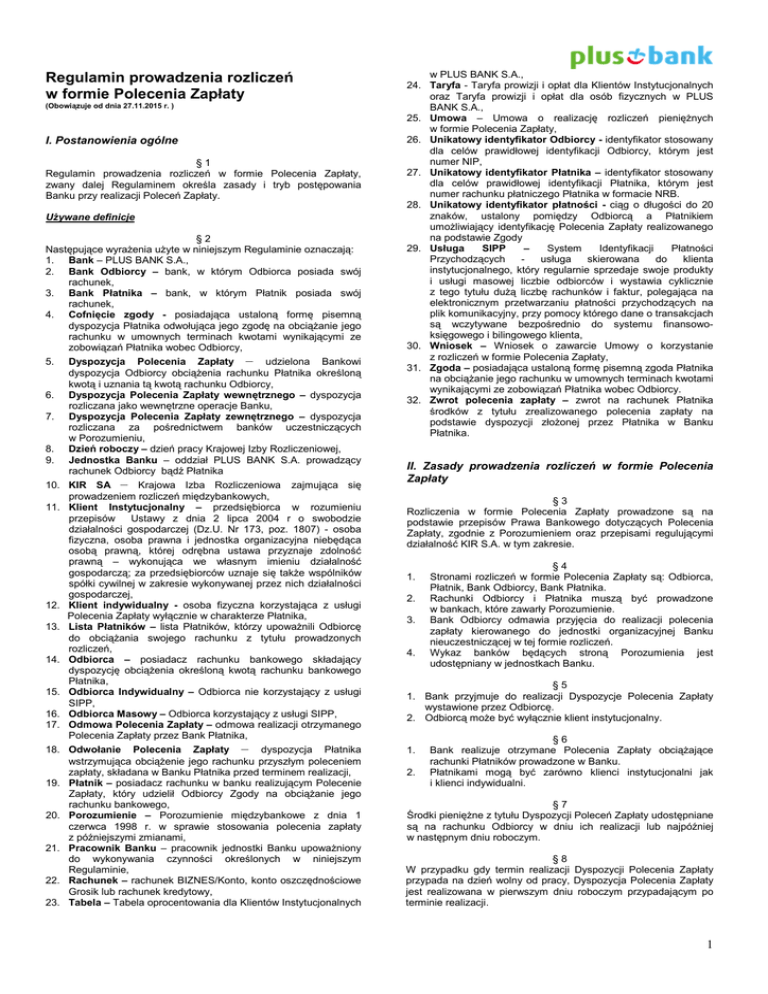 Regulamin prowadzenia rozliczeń w formie Polecenia Zapłaty (Obowiązuje od dnia 27.11.2015 r. ) I. Postanowienia ogólne §1 Regulamin prowadzenia rozliczeń w formie Polecenia Zapłaty, zwany dalej Regulaminem określa zasady i tryb postępowania Banku przy realizacji Poleceń Zapłaty. Używane definicje §2 Następujące wyrażenia użyte w niniejszym Regulaminie oznaczają: 1. Bank – PLUS BANK S.A., 2. Bank Odbiorcy – bank, w którym Odbiorca posiada swój rachunek, 3. Bank Płatnika – bank, w którym Płatnik posiada swój rachunek, 4. Cofnięcie zgody - posiadająca ustaloną formę pisemną dyspozycja Płatnika odwołująca jego zgodę na obciążanie jego rachunku w umownych terminach kwotami wynikającymi ze zobowiązań Płatnika wobec Odbiorcy, 5. Dyspozycja Polecenia Zapłaty – udzielona Bankowi dyspozycja Odbiorcy obciążenia rachunku Płatnika określoną kwotą i uznania tą kwotą rachunku Odbiorcy, 6. Dyspozycja Polecenia Zapłaty wewnętrznego – dyspozycja rozliczana jako wewnętrzne operacje Banku, 7. Dyspozycja Polecenia Zapłaty zewnętrznego – dyspozycja rozliczana za pośrednictwem banków uczestniczących w Porozumieniu, 8. Dzień roboczy – dzień pracy Krajowej Izby Rozliczeniowej, 9. Jednostka Banku – oddział PLUS BANK S.A. prowadzący rachunek Odbiorcy bądź Płatnika 10. KIR SA – Krajowa Izba Rozliczeniowa zajmująca się prowadzeniem rozliczeń międzybankowych, 11. Klient Instytucjonalny – przedsiębiorca w rozumieniu przepisów Ustawy z dnia 2 lipca 2004 r o swobodzie działalności gospodarczej (Dz.U. Nr 173, poz. 1807) - osoba fizyczna, osoba prawna i jednostka organizacyjna niebędąca osobą prawną, której odrębna ustawa przyznaje zdolność prawną – wykonująca we własnym imieniu działalność gospodarczą; za przedsiębiorców uznaje się także wspólników spółki cywilnej w zakresie wykonywanej przez nich działalności gospodarczej, 12. Klient indywidualny - osoba fizyczna korzystająca z usługi Polecenia Zapłaty wyłącznie w charakterze Płatnika, 13. Lista Płatników – lista Płatników, którzy upoważnili Odbiorcę do obciążania swojego rachunku z tytułu prowadzonych rozliczeń, 14. Odbiorca – posiadacz rachunku bankowego składający dyspozycję obciążenia określoną kwotą rachunku bankowego Płatnika, 15. Odbiorca Indywidualny – Odbiorca nie korzystający z usługi SIPP, 16. Odbiorca Masowy – Odbiorca korzystający z usługi SIPP, 17. Odmowa Polecenia Zapłaty – odmowa realizacji otrzymanego Polecenia Zapłaty przez Bank Płatnika, 18. Odwołanie Polecenia Zapłaty – dyspozycja Płatnika wstrzymująca obciążenie jego rachunku przyszłym poleceniem zapłaty, składana w Banku Płatnika przed terminem realizacji, 19. Płatnik – posiadacz rachunku w banku realizującym Polecenie Zapłaty, który udzielił Odbiorcy Zgody na obciążanie jego rachunku bankowego, 20. Porozumienie – Porozumienie międzybankowe z dnia 1 czerwca 1998 r. w sprawie stosowania polecenia zapłaty z późniejszymi zmianami, 21. Pracownik Banku – pracownik jednostki Banku upoważniony do wykonywania czynności określonych w niniejszym Regulaminie, 22. Rachunek – rachunek BIZNES/Konto, konto oszczędnościowe Grosik lub rachunek kredytowy, 23. Tabela – Tabela oprocentowania dla Klientów Instytucjonalnych w PLUS BANK S.A., 24. Taryfa - Taryfa prowizji i opłat dla Klientów Instytucjonalnych oraz Taryfa prowizji i opłat dla osób fizycznych w PLUS BANK S.A., 25. Umowa – Umowa o realizację rozliczeń pieniężnych w formie Polecenia Zapłaty, 26. Unikatowy identyfikator Odbiorcy - identyfikator stosowany dla celów prawidłowej identyfikacji Odbiorcy, którym jest numer NIP, 27. Unikatowy identyfikator Płatnika – identyfikator stosowany dla celów prawidłowej identyfikacji Płatnika, którym jest numer rachunku płatniczego Płatnika w formacie NRB. 28. Unikatowy identyfikator płatności - ciąg o długości do 20 znaków, ustalony pomiędzy Odbiorcą a Płatnikiem umożliwiający identyfikację Polecenia Zapłaty realizowanego na podstawie Zgody 29. Usługa SIPP – System Identyfikacji Płatności Przychodzących usługa skierowana do klienta instytucjonalnego, który regularnie sprzedaje swoje produkty i usługi masowej liczbie odbiorców i wystawia cyklicznie z tego tytułu dużą liczbę rachunków i faktur, polegająca na elektronicznym przetwarzaniu płatności przychodzących na plik komunikacyjny, przy pomocy którego dane o transakcjach są wczytywane bezpośrednio do systemu finansowoksięgowego i bilingowego klienta, 30. Wniosek – Wniosek o zawarcie Umowy o korzystanie z rozliczeń w formie Polecenia Zapłaty, 31. Zgoda – posiadająca ustaloną formę pisemną zgoda Płatnika na obciążanie jego rachunku w umownych terminach kwotami wynikającymi ze zobowiązań Płatnika wobec Odbiorcy. 32. Zwrot polecenia zapłaty – zwrot na rachunek Płatnika środków z tytułu zrealizowanego polecenia zapłaty na podstawie dyspozycji złożonej przez Płatnika w Banku Płatnika. II. Zasady prowadzenia rozliczeń w formie Polecenia Zapłaty §3 Rozliczenia w formie Polecenia Zapłaty prowadzone są na podstawie przepisów Prawa Bankowego dotyczących Polecenia Zapłaty, zgodnie z Porozumieniem oraz przepisami regulującymi działalność KIR S.A. w tym zakresie. 1. 2. 3. 4. §4 Stronami rozliczeń w formie Polecenia Zapłaty są: Odbiorca, Płatnik, Bank Odbiorcy, Bank Płatnika. Rachunki Odbiorcy i Płatnika muszą być prowadzone w bankach, które zawarły Porozumienie. Bank Odbiorcy odmawia przyjęcia do realizacji polecenia zapłaty kierowanego do jednostki organizacyjnej Banku nieuczestniczącej w tej formie rozliczeń. Wykaz banków będących stroną Porozumienia jest udostępniany w jednostkach Banku. §5 1. Bank przyjmuje do realizacji Dyspozycje Polecenia Zapłaty wystawione przez Odbiorcę. 2. Odbiorcą może być wyłącznie klient instytucjonalny. 1. 2. §6 Bank realizuje otrzym