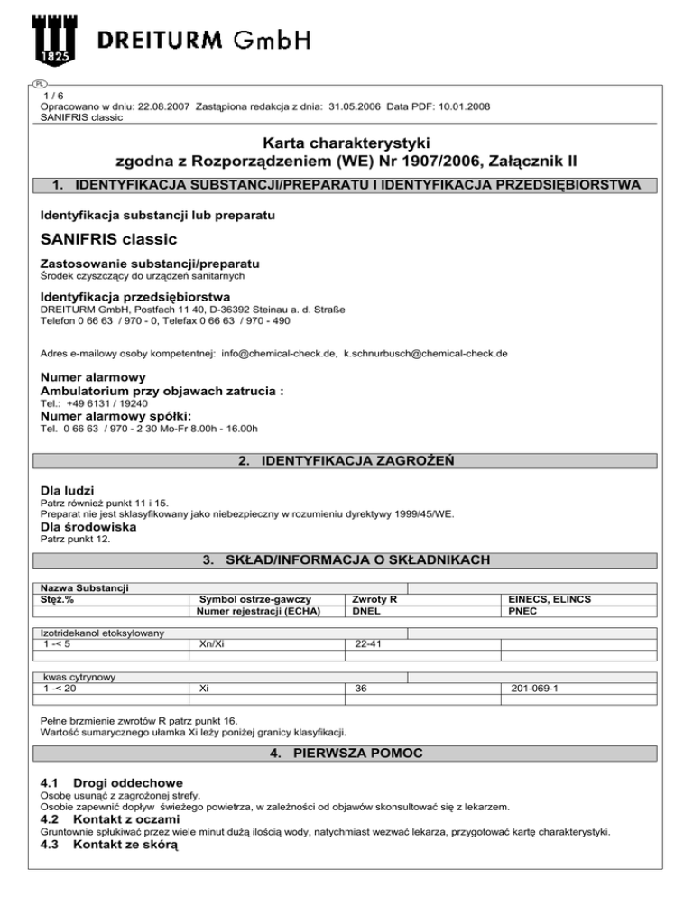 1/6 Opracowano w dniu: 22.08.2007 Zastąpiona redakcja z dnia: 31.05.2006 Data PDF: 10.01.2008 SANIFRIS classic Karta charakterystyki zgodna z Rozporządzeniem (WE) Nr 1907/2006, Załącznik II 1. IDENTYFIKACJA SUBSTANCJI/PREPARATU I IDENTYFIKACJA PRZEDSIĘBIORSTWA Identyfikacja substancji lub preparatu SANIFRIS classic Zastosowanie substancji/preparatu Środek czyszczący do urządzeń sanitarnych Identyfikacja przedsiębiorstwa DREITURM GmbH, Postfach 11 40, D-36392 Steinau a. d. Straße Telefon 0 66 63 / 970 - 0, Telefax 0 66 63 / 970 - 490 Adres e-mailowy osoby kompetentnej: [email protected], [email protected] Numer alarmowy Ambulatorium przy objawach zatrucia : Tel.: +49 6131 / 19240 Numer alarmowy spółki: Tel. 0 66 63 / 970 - 2 30 Mo-Fr 8.00h - 16.00h 2. IDENTYFIKACJA ZAGROŻEŃ Dla ludzi Patrz również punkt 11 i 15. Preparat nie jest sklasyfikowany jako niebezpieczny w rozumieniu dyrektywy 1999/45/WE. Dla środowiska Patrz punkt 12. 3. SKŁAD/INFORMACJA O SKŁADNIKACH Nazwa Substancji Stęż.% Symbol ostrze-gawczy Numer rejestracji (ECHA) Zwroty R DNEL Izotridekanol etoksylowany 1 -< 5 Xn/Xi 22-41 kwas cytrynowy 1 -< 20 Xi 36 EINECS, ELINCS PNEC 201-069-1 Pełne brzmienie zwrotów R patrz punkt 16. Wartość sumarycznego ułamka Xi leży poniżej granicy klasyfikacji. 4. PIERWSZA POMOC 4.1 Drogi oddechowe Osobę usunąć z zagrożonej strefy. Osobie zapewnić dopływ świeżego powietrza, w zależności od objawów skonsultować się z lekarzem. 4.2 Kontakt z oczami Gruntownie spłukiwać przez wiele minut dużą ilością wody, natychmiast wezwać lekarza, przygotować kartę charakterystyki. 4.3 Kontakt ze skórą 2/6 Opracowano w dniu: 22.08.2007 Zastąpiona redakcja z dnia: 31.05.2006 Data PDF: 10.01.2008 SANIFRIS classic Umyć dużą ilością wody, zanieczyszczone, nasączone ubranie niezwłocznie usunąć, natychmiast wezwać lekarza, mieć przy sobie informacje o produkcie. 4.4 Drogi pokarmowe Podać wodę do picia. Kartę charakterystyki mieć przy sobie. 4.5 Szczególnie polecane środki pierwszej pomocy n.b. 5. POSTĘPOWANIE W PRZYPADKU POŻARU 5.1 Stosownych środków gaśniczych Dostosować pożarowo do otoczenia. 5.2 Środków gaśniczych, które nie są używane ze względów bezpieczeństwa n.b. 5.3 Specjalnych zagrożeń związanych z narażeniem wynikających z właściwości substancji lub preparatu jako takiego, produktów spalania, powstających gasów W przypadku pożaru mogą powstać: Tlenki węgla. Toksyczne produkty rozkładu termicznego. 5.4 Specjalnego sprzętu ochronnego dla strażaków Sprzęt ochrony dróg oddechowych niezależny od powietrza otoczenia. W razie potrzeby - pełna ochrona. 5.5 Pozostałe uwagi Skażoną wodę gaśniczą zneutralizować zgodnie z przepisami administracyjnymi 6. POSTĘPOWANIE W PRZYPADKU NIEZAMIERZONEGO UWOLNIENIA DO ŚRODOWISKA Patrz punkt 13., odnośnie osobistego wyposażenia ochronnego patrz punkt 8. 6.1 Indywidualnych środków ostrożności Uwaga! Niebezpieczeństwo poślizgu. Unikać kontaktu z oczami. 6.2 Środków ostrożności w odniesieniu do środowiska Przy ulatnianiu się większej ilości zatamować. Unikać przenikania do wód gruntowych i powierzchniowych, a również do gruntu. W stanie nierozcieńczonym nie wylewać do kanalizacji. 6.3 Metody oczyszczania Zebrać materiałem chłonnym (np.: uniwersalny środek wiążący) i usuwać zgodnie z punktem 13. Pozostałą ilość spłukać dużą ilością wody. 7. POSTĘPOWANIE Z SUBSTANCJĄ/PREPARATEM I JEJ/JEGO MAGAZYNOWANIE 7.1 Postępowanie z substancją/preparatem Wskazówki bezpiecznego postępowania: Patrz punkt 6.1 Przestrzegać wskazówek na etykiecie, jak równiez instrukcji użytkowania. Zabrania sie jeść, pić, palić, a także przechowywać artykuły żywnościowe w pomieszczeniu roboczym. 7.2 Magazynowanie Wymagania wobec pomieszczeń do magazynowania i pojemników: Nie składować produktu w przejściach i klatkach schodowych. Produkt składować tylko w oryginalnie zamkniętych opakowaniach. Nie stosować materiałów nieodpornych na działanie kwasów. Wymagana podłoga kwasoodporna. Magazynować z dala od alkaliów. Szczególne warunki magazynowania: Patrz punkt 10 Chronić przed wilgocią, składować w zamknięciu. 3/6 Opracowano w dniu: 22.08.2007 Zastąpiona redakcja z dnia: 31.05.2006 Data PDF: 10.01.2008 SANIFRIS classic 8. KONTROLA NARAŻENIA I ŚRODKI OCHRONY INDYWIDUALNEJ 8.1 Wartości graniczne narażenia --- 8.2 Kontrola narażenia 8.2.1 Kontrola narażenia w miejscu pracy Dbać o dobrą wentylację. Można to uzyskać dzięki lokalnemu odciągowi lub ogólnej wentylacji. Jeśli to nie wystarczy, by utrzymać stężenie poniżej najwyższych dopuszczalnych wartości stężenia, należy stosować odpowiednią maskę chroniącą drogi oddechowe. Obowiązuje tylko, gdy tu podane są graniczne wartości ekspozycji. Ochrona dróg oddechowych: W normalnym przypadku nie wymagana. Ochrona rąk: Godne polecenia. Rękawice gumowe (EN 374). Ochrona oczu: Okulary szczelnie przylegające z bocznymi ochronami (EN 166). Ochrona skóry: Kwasoodporne ubranie ochronne (EN368/9) Dodatkowe informacje dotyczące ochrony rąk - Nie wykonano żadnych testów. Przy wyborze preparatów kierowano się najlepszą wiedzą uwzględniając informacje opisujące składniki preparatu. Przy wyborze materiałów kierowano się informacjami producenta rękawic. Ostateczny wybór materiału rękawic musi nastąpić przy uwzględnieniu czasu przebicia, szybkości przenikania i degradacji. Wybór odpowiedniej rękawicy zależy nie tylko od materiału, ale także od innych cech jakościowych, które mogą być różne dla różnych producentów. Podczas produkcji trudna jest do przewidzenia trwałość materiałów rękawic i dlatego musi być sprawdzona przed użyciem. Dokładny czas przebicia materiału rękawic należy uzyskać od producenta rękawic ochronnych i przestrzegać. 8.2.2 Kontrola narażenia środowiska b.d. 9. WŁAŚCIWOŚCI FIZYCZNE I CHEMICZNE