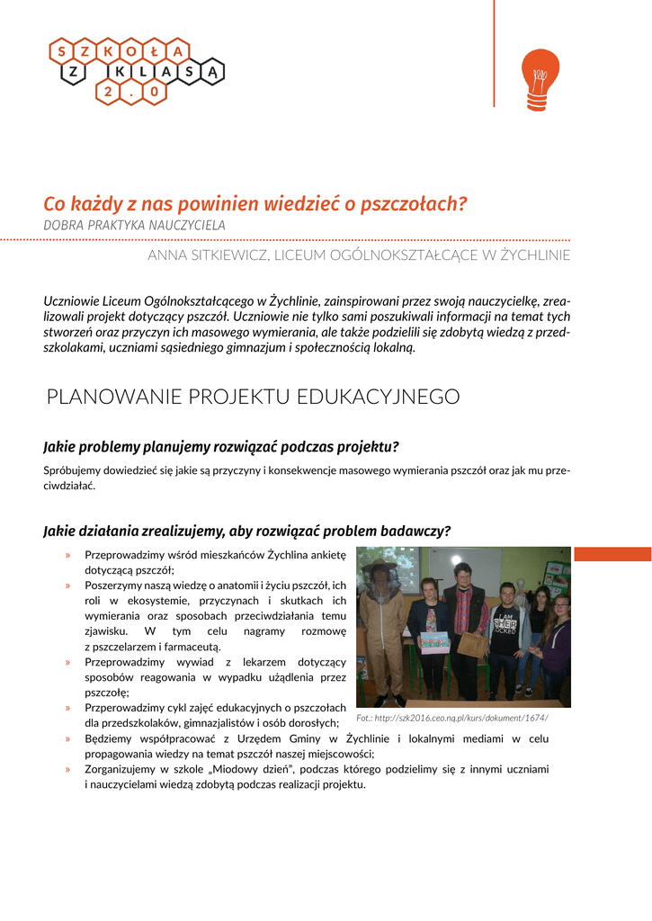 ANNA SITKIEWICZ, LICEUM OGÓLNOKSZTAŁCĄCE W ŻYCHLINIE Uczniowie Liceum Ogólnokształcącego w Żychlinie, zainspirowani przez swoją nauczycielkę, zrealizowali projekt dotyczący pszczół. Uczniowie nie tylko sami poszukiwali informacji na temat tych stworzeń oraz przyczyn ich masowego wymierania, ale także podzielili się zdobytą wiedzą z przedszkolakami, uczniami sąsiedniego gimnazjum i społecznością lokalną. PLANOWANIE PROJEKTU EDUKACYJNEGO Spróbujemy dowiedzieć się jakie są przyczyny i konsekwencje masowego wymierania pszczół oraz jak mu przeciwdziałać. » » » » » » Przeprowadzimy wśród mieszkańców Żychlina ankietę dotyczącą pszczół; Poszerzymy naszą wiedzę o anatomii i życiu pszczół, ich roli w ekosystemie, przyczynach i skutkach ich wymierania oraz sposobach przeciwdziałania temu zjawisku. W tym celu nagramy rozmowę z pszczelarzem i farmaceutą. Przeprowadzimy wywiad z lekarzem dotyczący sposobów reagowania w wypadku użądlenia przez pszczołę; Przperowadzimy cykl zajęć edukacyjnych o pszczołach Fot.: http://szk2016.ceo.nq.pl/kurs/dokument/1674/ dla przedszkolaków, gimnazjalistów i osób dorosłych; Będziemy współpracować z Urzędem Gminy w Żychlinie i lokalnymi mediami w celu propagowania wiedzy na temat pszczół naszej miejscowości; Zorganizujemy w szkole „Miodowy dzień”, podczas którego podzielimy się z innymi uczniami i nauczycielami wiedzą zdobytą podczas realizacji projektu. „Ja rzuciłam tylko hasło pszczoły, a uczniowie doprecyzowali temat, określili jego cele i zadania do wykonania – odbyła się burza mózgów w szkole, a następnie w domu uczniowie kontaktowali się przez internet”. Nauczycielka wraz z uczniami zaplanowała pracę nad projektem tak, żeby każdy z uczniów dostał zadanie zgodne ze swoimi predyspozycjami i realizując je czuł się komfortowo. Więcej informacji o planowaniu tego projektu znajdziecie w jego opisie na platformie programu: http://szk2016.ceo.nq.pl/kurs/dokument/827/ REALIZACJA I PREZENTACJA PROJEKTU „Po przydzieleniu konkretnych zadań konkretnym osobom przeszliśmy do ich realizacji. Zgodnie z planem zostały opracowane i przeprowadzone ankiety o pszczołach. Następnie odpowiedzialni za to uczniowie zestawili wyniki ankiet w postaci tabel i wykresów oraz wyciągnęli z nich wnioski. Zgodnie z planem uczniowie przedstawili mi zestaw pytań do wywiadu z lekarzem. Po mojej akceptacji uczniowie przeprowadzili i nakręcili wywiad z lekarzem rodzinnym na temat wstrząsu anafilaktycznego i postępowaniu po użądleniu przez pszczołę. Tak samo wyglądała sytuacja z farmaceutą (wykorzystanie miodu w lekarstwach i kosmetykach) i pszczelarzem (pszczelarz przeprowadził z uczniami lekcje). Zgodnie z planem Fot.: http://szk2016.ceo.nq.pl/kurs/dokument/1674/ uczniowie wyszukali informacjie na temat pszczół, dokonali pod moim okiem selekcji i wykonali 2 prezentacje multimedialne: dla młodszych dzieci i młodzieży. Następnie przygotowali konspekty zajęć i odbyły sie próby tych zajęć. Wyznaczona młodzież przeprowadziła cykl zajęć edukacyjnych: "Pszczółki górą!" – dla drugoklasistów ze szkoły podstawowej oraz "Co każy z nas powiniem wiedzieć o pszczołach?" dla uczniów klasy Ia, Ib, II d, III a, IIIb, IIIc, IIId, IIIe gimnazjum oraz klas I, II i III liceum. Nawiązaliśmy współpracę z Urzędem Gminy w Żychlinie, gdzie można obejrzeć wystawę z naszego projektu i zapoznać się z naszymi ulotkami. Informacja o naszym projekcie będzie na stronie gminy. Zmieniliśmy czas informowania o naszych działaniach lokalne media -zamiast po każdym etapie na po zakończeniu projektu.” » » » » » przeprowadzać wywiady, nagrywać filmy kamerą cyfrową, obrabiać je i wrzucać do sieci, przygotowywać i przeprowadzać lekcje dla innych uczniów i to na różnych poziomach edukacyjnych, występować publicznie, że warto pomagać – zdecydowaliśmy, że część pieniędzy, którą zebraliśmy podczas sprzedaży ciasta przekażemy dla chorego kolegi z gimnazjum, przygotowywać prezentacje multimedialne, ulotki, wykresy. „Uczniowie byli bardzo zadowoleni z realizacji tego właśnie projektu. Każdy zajął się tym, w czym czuł się najlepiej. Wiele satysfakcji przyniosły uczniom zajęcia przeprowadzone dla drugoklasistów ze szkoły podstawowej, gdyż okazali się oni bardzo wdzięcznymi odbiorcami. Bardzo spontaniczne reagowali, wyraźnie było widać, że są zainteresowani tematem, bardzo ucieszyli się z przygotowanych dla nich własnoręcznie przez uczniów niespodzianek – wesołych papierowych pszczółek.” „Realizacja tego projektu przyniosła wiele satysfakcji uczniom oraz mnie. Na każdym etapie realizacji wspierałam uczniów, pilnowałam terminów, chwaliłam za to co już zrobili, dopingowałam do dalszej pracy i uświadamiałam jak ważne jest to co robią. Jedyne co mogę uznać za minus to termin realizacji projektu. Zdecydowanie lepszym rozwiązaniem byłaby wiosna. Dlatego też planujemy powrócić do projektu wiosną i wybrać się na wycieczkę do pasieki. Wiosną też planujemy zorganizować zajęcia dla osób dorosłych.” Więcej informacji o realizacji i prezentacji tego projektu znajdziecie w jego opisie na platformie programu: http://szk2016.ceo.nq.pl/kurs/dokument/1674/