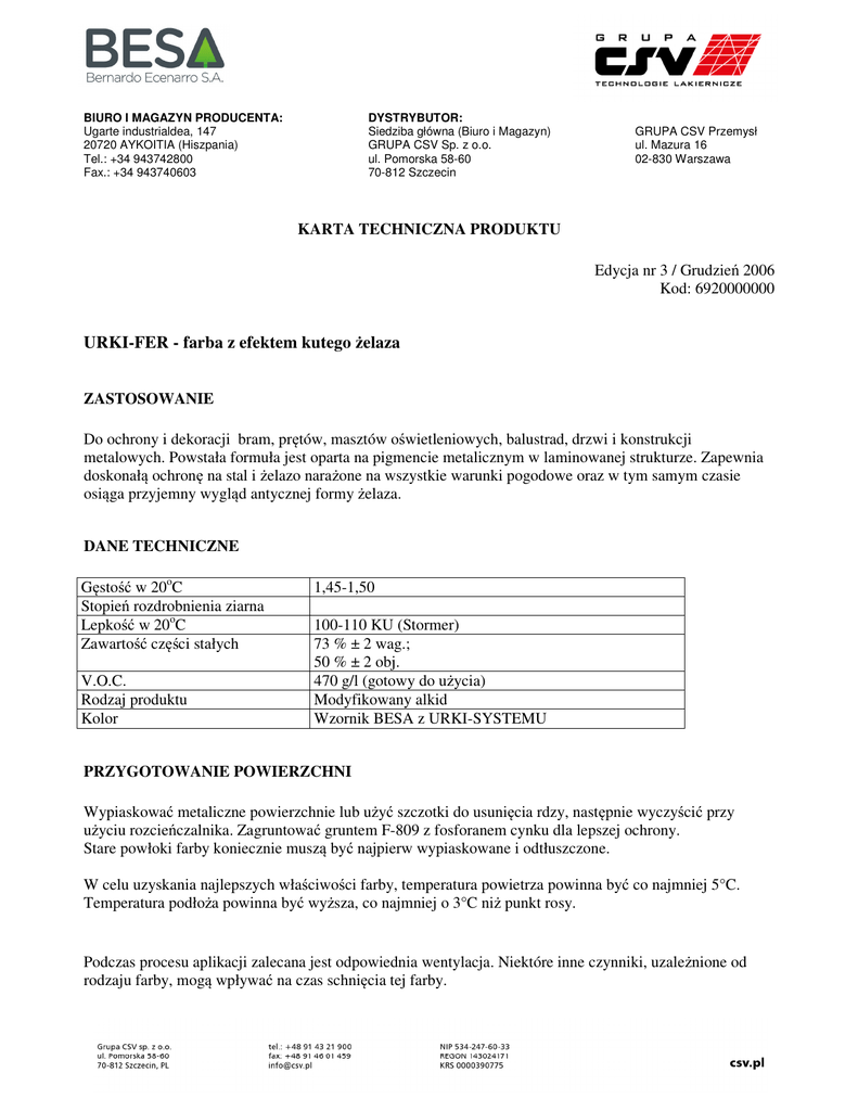 BIURO I MAGAZYN PRODUCENTA: Ugarte industrialdea, 147 20720 AYKOITIA (Hiszpania) Tel.: +34 943742800 Fax.: +34 943740603 DYSTRYBUTOR: Siedziba główna (Biuro i Magazyn) GRUPA CSV Sp. z o.o. ul. Pomorska 58-60 70-812 Szczecin GRUPA CSV Przemysł ul. Mazura 16 02-830 Warszawa KARTA TECHNICZNA PRODUKTU Edycja nr 3 / Grudzień 2006 Kod: 6920000000 URKI-FER - farba z efektem kutego żelaza ZASTOSOWANIE Do ochrony i dekoracji bram, prętów, masztów oświetleniowych, balustrad, drzwi i konstrukcji metalowych. Powstała formuła jest oparta na pigmencie metalicznym w laminowanej strukturze. Zapewnia doskonałą ochronę na stal i żelazo narażone na wszystkie warunki pogodowe oraz w tym samym czasie osiąga przyjemny wygląd antycznej formy żelaza. DANE TECHNICZNE Gęstość w 20oC Stopień rozdrobnienia ziarna Lepkość w 20oC Zawartość części stałych V.O.C. Rodzaj produktu Kolor 1,45-1,50 100-110 KU (Stormer) 73 % ± 2 wag.; 50 % ± 2 obj. 470 g/l (gotowy do użycia) Modyfikowany alkid Wzornik BESA z URKI-SYSTEMU PRZYGOTOWANIE POWIERZCHNI Wypiaskować metaliczne powierzchnie lub użyć szczotki do usunięcia rdzy, następnie wyczyścić przy użyciu rozcieńczalnika. Zagruntować gruntem F-809 z fosforanem cynku dla lepszej ochrony. Stare powłoki farby koniecznie muszą być najpierw wypiaskowane i odtłuszczone. W celu uzyskania najlepszych właściwości farby, temperatura powietrza powinna być co najmniej 5°C. Temperatura podłoża powinna być wyższa, co najmniej o 3°C niż punkt rosy. Podczas procesu aplikacji zalecana jest odpowiednia wentylacja. Niektóre inne czynniki, uzależnione od rodzaju farby, mogą wpływać na czas schnięcia tej farby. SPOSÓB NAKŁADANIA 25-30 sek. FORD nr 4 URKISOL- URKISOL222 170 5-10% 10-20% 40-50 μm Pyłosuchość: 1 h Na dotyk: 3-4 h WŁAŚCIWOŚCI LAKIERU Wydajność teoretyczna 9 – 10 m2/l (50 µm) Połysk 60° – 60° Matowy Możliwość przelakierowania 12 godzin Dobra przyczepność i elastyczność, bez pękania. PRZECHOWYWANIE Przechowywać w zamkniętych opakowaniach w chłodnym, wentylowanym pomieszczeniu. Chronić przed słońcem. Zalecana temperatura składowania: 5-30°C. Trwałość: 2 lata od daty produkcji. W przypadku upłynięcia terminu ważności skonsultuj się z Działem Technicznym.