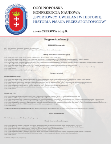 ogólnopolskA konferencjA naukowA „sportowcy uwikłani w historię. Historia pisana przez sportowców” 11–12 czerwca 2015 r. Program konferencji 11.06.2015 (czwartek) 9:00 – 10:00 rejestracja uczestników (hol przed salą kongresową) 10:00 – 10:20 Powitanie Gości przez Rektora AWFiS, prof. dr. hab. Waldemara Moskę (sala konferencyjna) Obrady plenarne (sala konferencyjna) 10:30 – 10:50 prof. nadzw. dr hab. Ewa Kałamacka (AWF Kraków), Profesor Adam Klimek (1931–2014) 10:50 – 11:10 prof. nadzw. dr hab. Renata Urban (Uniwersytet Szczeciński), Henryk Leliwa-Roycewicz, olimpijczyk, powstaniec, więzień – biografia nieznana 11:10 – 11:30 prof. nadzw. dr hab. Ewa Nawrocka (emeryt. prof. Uniwersytetu Gdańskiego), Leni Riefenstahl – między sztuką a ideologią 11:30 – 11:50 prof. dr hab. Włodzimierz Jastrzębski (emeryt. prof. Uniwersytetu Kazimierza Wielkiego), Działalność sportowa – oficjalna i nielegalna na ziemiach polskich włączonych do Rzeszy Niemieckiej w latach 1939–1945 11:50 – 12:10 prof. nadzw. dr hab. Maciej Łuczak (AWF Poznań), Wybitni poznańscy trenerzy sportu pływackiego w latach 1945–2004 12:10 – 12:30 prof. nadzw. dr hab. Piotr Godlewski (Uniwersytet Zielonogórski), Sportowcy uwikłani w komunizm (konterfekt sportowca okresu komunistycznej Polski) 12:30 – 13:00 dyskusja 13:00 – 13:30 przerwa na lunch (hol przed salą kongresową) Obrady w sekcjach Sekcja I (sala konferencyjna) 13:30 – 13:50 prof. nadzw. dr hab. Waldemar Moska (AWFiS Gdańsk), Piaśnica jako miejsce kaźni polskich sportowców mieszkańców Wolnego Miasta Gdańska 13:50 – 14:10 prof. nadzw. dr hab. Kazimierz Kochanowicz (AWFiS Gdańsk), Gimnastyka miłością i pasją życia Józefa Karniewicza 14:10 – 14:30 dr Józef Żerko (emeryt. pracownik Uniwersytetu Gdańskiego), Mgr inż. Witold Zbigniew Kirkor – pasjonat chodu sportowego i królowej sportów 14:30 – 14:50 dr Janusz Trupinda (Muzeum Historyczne Miasta Gdańska), Sportowiec, aktor, patriota. Kilka słów o Jerzym Piotrowskim (1912–1989) 14:50 – 15:10 mgr Bartosz Gondek (AWFiS), Miastko, Ponikła i nie tylko – pomorskie ślady biografii Maxa Schmelinga 15:10 – 15:30 mgr Piotr Bojarski (Uniwersytet Warmińsko-Mazurski), Józef Szmidt – „Kangur ze Śląska” 15:30 – 16:00 dyskusja Sekcja II (sala VIP) 13:30 – 13:50 dr Wiesław Wika (Pomorska Szkoła Wyższa w Starogardzie Gdańskim), Kazimierz Deyna – o tym, co zmienił lot polskiej piłki 13:50 – 14:10 Paweł Tabaka (student Uniwersytetu Warmińsko-Mazurskiego), Bohaterowie nie tylko na arenach 14:10 – 14:30 mgr Wioletta Husar (Uniwersytet Zielonogórski), FC Barcelona jak inkubator katalońskości. Rola Blaugrany w życiu Katalończyków podczas reżimu gen. Francisco Franco 14:30 – 14:50 mgr Grzegorz Kała (Uniwersytet Warmińsko-Mazurski), Letnie Igrzyska Olimpijskie w Moskwie jako narzędzie politycznej propagandy na przykładach z polskiej prasy 14:50 – 15:10 mgr Kacper Kaźmierowicz (AWF Warszawa), Polityka w hiszpańskiej piłce nożnej. Piłkarze i działacze klubów Real Madryt CF oraz FC Barcelona uwikłani w politykę od 1902 r. 15:10 – 15:30 dr Krystian Wochna (AWF Poznań), Historia metodyki nauczania pływania w Europie 15:30 – 16:00 dyskusja 17:00 Wycieczka śladami gdańskich uczonych (Stare Miasto), prowadzący dr Mariusz Brodnicki. W programie zwiedzanie Muzeum Archeologicznego w Gdańsku 12.06.2015 (piątek) 9:00–10:00 rejestracja uczestników (hol przed salą kongresową) Obrady plenarne (sala konferencyjna) 10:00 – 10:20 dr Ryszard Stefanik (Uniwersytet Szczeciński), Wzór sportowca na przykładzie szczecińskiej kultury fizycznej w latach 1945–1956 10:20 – 10:40 Marcin Kacpura (student Uniwersytetu Gdańskiego), Uciekli przed wojną, gonią za medalami – historie Mo Faraha i Yareda Shegumo 10:40 – 11:00 mgr Anna Majer (AWFiS Gdańsk), Lynne Cox – królowa zimnych wód w czasach zimnej wojny 11:00 – 11:20 dr Jarosław Kłodziński (AWFiS Gdańsk) Druh Mariusz Zaruski – wielki skromnością 11:20 – 11:40 mgr Wiesław Setlak (Uniwersytet Rzeszowski), Pierre de Coubertin i Kazimierz Wierzyński. Refleksja nad humanistycznym zwrotem w idei sportu 11:40 – 12:00 dr Monika Żmudzka-Brodnicka (AWFiS), Dama i bokser – o dziwnej znajomości Wisławy Szymborskiej i Andrzeja Gołoty 12:00 – 12:30 dyskusja 12:30 lunch (hol przed salą kongresową)