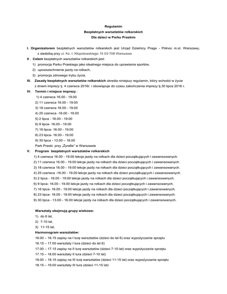 Regulamin Bezpłatnych warsztatów rolkarskich Dla dzieci w Parku Praskim I. Organizatorem bezpłatnych warsztatów rolkarskich jest Urząd Dzielnicy Praga - Północ m.st. Warszawy, z siedzibą przy ul. Ks. I. Kłopotowskiego 15 03-708 Warszawa II . Celem bezpłatnych warsztatów rolkarskich jest: 1) promocja Parku Praskiego jako idealnego miejsca do uprawiania sportów, 2) upowszechnienie jazdy na rolkach, 3) promocja zdrowego trybu życia. III. Zasady bezpłatnych warsztatów rolkarskich określa niniejszy regulamin, który wchodzi w życie z dniem imprezy tj. 4 czerwca 2016r. i obowiązuje do czasu zakończenia imprezy tj.30 lipca 2016 r. IV. Termin i miejsce imprezy : 1) 4 czerwca 16.00 - 19.00 2) 11 czerwca 16.00 - 19.00 3) 18 czerwca 16.00 - 19.00 4) 25 czerwca -16.00 - 19.00 5) 2 lipca - 16.00 - 19.00 6) 9 lipca- 16.00 - 19.00 7) 16 lipca- 16.00 - 19.00 8) 23 lipca- 16.00 - 19.00 9) 30 lipca - 13.00 – 16.00 Park Praski przy „Żyrafie” w Warszawie V. Program bezpłatnych warsztatów rolkarskich 1) 4 czerwca 16.00 - 19.00 lekcje jazdy na rolkach dla dzieci początkujących i zawansowanych. 2) 11 czerwca 16.00 - 19.00 lekcje jazdy na rolkach dla dzieci początkujących i zawansowanych. 3) 18 czerwca 16.00 - 19.00 lekcje jazdy na rolkach dla dzieci początkujących i zawansowanych. 4) 25 czerwca -16.00 - 19.00 lekcje jazdy na rolkach dla dzieci początkujących i zawansowanych. 5) 2 lipca - 16.00 - 19.00 lekcje jazdy na rolkach dla dzieci początkujących i zawansowanych. 6) 9 lipca- 16.00 - 19.00 lekcje jazdy na rolkach dla dzieci początkujących i zawansowanych. 7) 16 lipca- 16.00 - 19.00 lekcje jazdy na rolkach dla dzieci początkujących i zawansowanych. 8) 23 lipca- 16.00 - 19.00 lekcje jazdy na rolkach dla dzieci początkujących i zawansowanych. 9) 30 lipca - 13.00 - 16.00 lekcje jazdy na rolkach dla dzieci początkujących i zawansowanych. Warsztaty obejmują grupy wiekowe: 1) do 6 lat, 2) 7-10 lat, 3) 11-15 lat; Harmonogram warsztatów: 16.00 – 16.15 zapisy na I turę warsztatów (dzieci do lat 6) oraz wypożyczanie sprzętu 16.15 – 17.00 warsztaty I tura (dzieci do lat 6) 17.00 – 17.15 zapisy na II turę warsztatów (dzieci 7-10 lat) oraz wypożyczanie sprzętu 17.15 – 18.00 warsztaty II tura (dzieci 7-10 lat) 18.00 – 18.15 zapisy na III turę warsztatów (dzieci 11-15 lat) oraz wypożyczanie sprzętu 18.15 – 19.00 warsztaty III tura (dzieci 11-15 lat) VI. Warunki uczestnictwa w zawodach rolkarskich i bezpłatnych warsztatach rolkarskich 1) W warsztatach może wziąć udział dzieci do lat 15 2) Udział w warsztatach jest bezpłatny. 3) Udział w bezpłatnych warsztatach rolkarskich osoby niepełnoletniej jest możliwy tylko na podstawie podpisanego pisemnego oświadczenia prawnego opiekuna (załącznik nr 1 do niniejszego regulaminu), Oświadczenie do pobrania ze strony www.rollschool.pl 4) Uczestnik powinien posiadać własne rolki, rolki można także wypożyczyć za darmo po wplaceniu kaucji na miejscu w biurze warsztatów 5) Na bezpłatne warsztaty rolkarskie obowiązują zapisy na miejscu u instruktora. W każdym warsztacie może wziąć udział maksymalnie 45 osób 6) Wszyscy uczestnicy zobowiązani są do posiadania kasku ochronnego i zestawu ochraniaczy (na kolana, łokcie i nadgarstki) VII. Sprawy organizacyjne 1. Bezpłatne warsztaty rolkarskie będą prowadzić instruktorzy wrotkarstwa. 2. Uczestnik zobowiązuję się do przestrzegania zasad fair play wobec innych uczestników. 3. Na terenie Parku Praskiego obowiązuje bezwzględny zakaz wnoszenia i spożywania alkoholu, broni i materiałów pirotechniczne. VIII. Postanowienia końcowe 1. Uczestnicy bezpłatnych warsztatów rolkarskich biorą w nich udział na 2. W trakcie bezpłatnych warsztatów rolkarskich wszyscy uczestnicy powinni własną odpowiedzialność. stosować się do poleceń instruktorów działających w imieniu Organizatora. 3. Uczestnik bezpłatnych warsztatów rolkarskich uznaje, że zapoznał się z regulaminem i zobowiązuje się do jego przestrzegania. 4. Organizator ma prawo publikowania w środkach przekazu (Internet, prasa, radio, telewizja, ulotki, plakaty, inne materiały promocyjne i informacyjne) danych identyfikujących uczestników bezpłatnych warsztatów rolkarskich, tj.: imię, nazwisko, wiek, oraz ich wizerunku utrwalonego w czasie trwania bezpłatnych warsztatów rolkarskich (serwis fotograficzny). Uczestnicy bezpłatnych warsztatów rolkarskich wyrażają zgodę na bezpłatne publikowanie ich danych osobowych i wizerunku we wszelkich materiałach informacyjnych i promocyjnych o bezpłatnych warsztatach rolkarskich oraz kampaniach, przedsięwzięciach, wystawach i wydawnictwach informacyjnych, promocyjnych i prasowych. 5. Uczestnik wyraża zgodę na przetwarzanie swoich danych osobowych przez organizatora bezpłatnych warsztatów rolkarskich zgodnie z Ustawą o ochronie danych osobowych. 6. Administratorem danych osobowych zgromadzonych w związku bezpłatnymi warsztatami rolkarskimi będzie Organizator. 7. Organizator nie ponosi odpowiedzialności za ewentualne szkody spowodowane opublikowaniem nieprawdziwych danych osobowych, bądź innych nieprawdziwych informacji opartych na zgłoszeniach sporządzonych przez Uczestników. 8. Organizator zastrzega sobie prawo do dokonania zmian Regulaminu z ważnych powodów, w każdym czasie. 9. Organizator zastrzega sobie prawo do odwołania bezpłatnych warsztatów rolkarskich w przypadku niekorzystnych warunków atmosferycznych, uniemożliwiających przeprowadzenie bezpłatnych warsztatów rolkarskich. Burmistrz Dzielnicy Praga - Północ