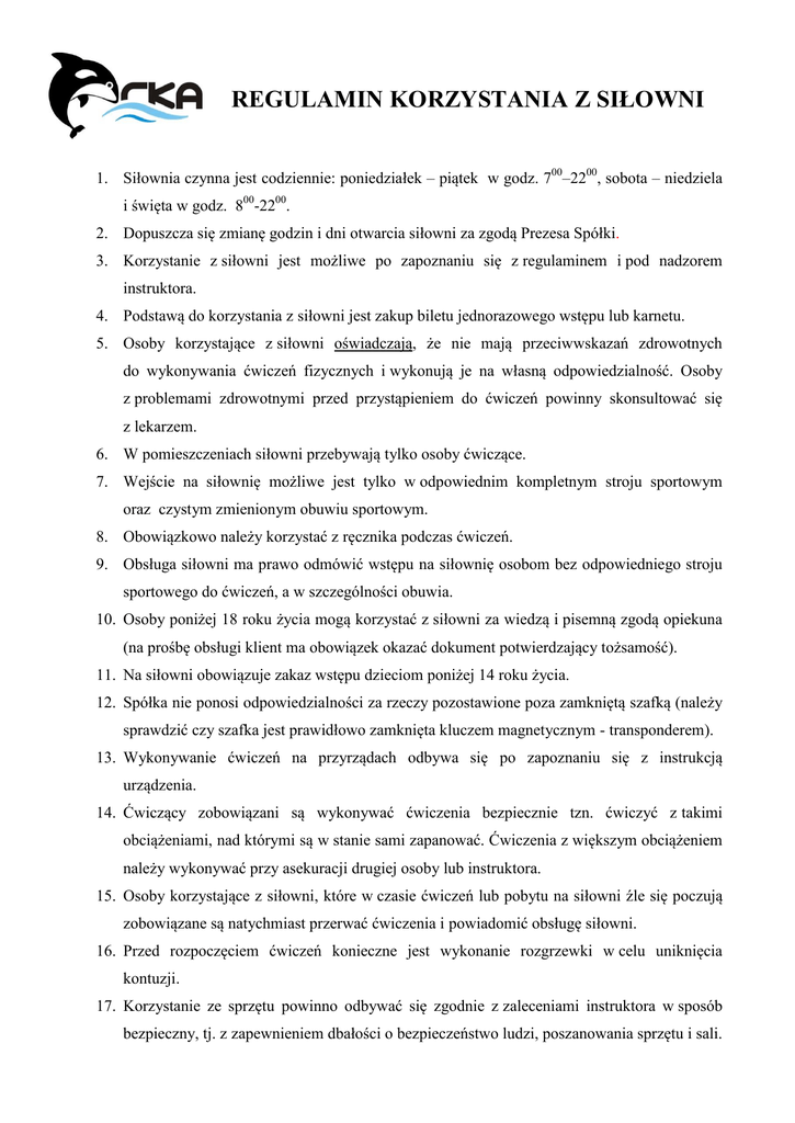 REGULAMIN KORZYSTANIA Z SIŁOWNI 1. Siłownia czynna jest codziennie: poniedziałek – piątek w godz. 700–2200, sobota – niedziela i święta w godz. 800-2200. 2. Dopuszcza się zmianę godzin i dni otwarcia siłowni za zgodą Prezesa Spółki. 3. Korzystanie z siłowni jest możliwe po zapoznaniu się z regulaminem i pod nadzorem instruktora. 4. Podstawą do korzystania z siłowni jest zakup biletu jednorazowego wstępu lub karnetu. 5. Osoby korzystające z siłowni oświadczają, że nie mają przeciwwskazań zdrowotnych do wykonywania ćwiczeń fizycznych i wykonują je na własną odpowiedzialność. Osoby z problemami zdrowotnymi przed przystąpieniem do ćwiczeń powinny skonsultować się z lekarzem. 6. W pomieszczeniach siłowni przebywają tylko osoby ćwiczące. 7. Wejście na siłownię możliwe jest tylko w odpowiednim kompletnym stroju sportowym oraz czystym zmienionym obuwiu sportowym. 8. Obowiązkowo należy korzystać z ręcznika podczas ćwiczeń. 9. Obsługa siłowni ma prawo odmówić wstępu na siłownię osobom bez odpowiedniego stroju sportowego do ćwiczeń, a w szczególności obuwia. 10. Osoby poniżej 18 roku życia mogą korzystać z siłowni za wiedzą i pisemną zgodą opiekuna (na prośbę obsługi klient ma obowiązek okazać dokument potwierdzający tożsamość). 11. Na siłowni obowiązuje zakaz wstępu dzieciom poniżej 14 roku życia. 12. Spółka nie ponosi odpowiedzialności za rzeczy pozostawione poza zamkniętą szafką (należy sprawdzić czy szafka jest prawidłowo zamknięta kluczem magnetycznym - transponderem). 13. Wykonywanie ćwiczeń na przyrządach odbywa się po zapoznaniu się z instrukcją urządzenia. 14. Ćwiczący zobowiązani są wykonywać ćwiczenia bezpiecznie tzn. ćwiczyć z takimi obciążeniami, nad którymi są w stanie sami zapanować. Ćwiczenia z większym obciążeniem należy wykonywać przy asekuracji drugiej osoby lub instruktora. 15. Osoby korzystające z siłowni, które w czasie ćwiczeń lub pobytu na siłowni źle się poczują zobowiązane są natychmiast przerwać ćwiczenia i powiadomić obsługę siłowni. 16. Przed rozpoczęciem ćwiczeń konieczne jest wykonanie rozgrzewki w celu uniknięcia kontuzji. 17. Korzystanie ze sprzętu powinno odbywać się zgodnie z zaleceniami instruktora w sposób bezpieczny, tj. z zapewnieniem dbałości o bezpieczeństwo ludzi, poszanowania sprzętu i sali. 18. Przed ćwiczeniem należy sprawdzić stan urządzenia - wszelkie usterki, uszkodzenia sprzętu i przyrządów należy zgłaszać instruktorowi. 19. Zabrania się wykonywania ćwiczeń na przyrządach uszkodzonych lub niesprawnych. 20. Wszystkie urządzenia siłowni oraz sprzęt do ćwiczeń mogą być wykorzystywane tylko zgodnie z ich przeznaczeniem. 21. Niewskazane jest zajmowanie stanowisk do ćwiczeń podczas odpoczynku. 22. Po zakończeniu ćwiczeń należy uporządkować sprzęt i stanowisko w sposób zalecony przez instruktora. 23. Szkolne grupy zorganizowane mogą korzystać z siłowni pod opieką nauczyciela z odpowiednimi uprawnieniami, instruktora lub trenera po wcześniejszej rezerwacji. 24. Do prowadzenia treningu na siłowni uprawnieni są wyłącznie instruktorzy zatrudnieni w Bolesławickim Parku Wodnym Orka. 25. Zakazuje się prowadzenia treningów personalnych przez osoby niezatrudnione w Bolesławieckim Parku Wodnym Orka. 26. Obsługa ma prawo wyprosić osoby łamiące postanowienia niniejszego regulaminu oraz co do których poweźmie uzasadnione podejrzenie, że będą naruszać niniejszy regulamin lub przepisy prawa, nawet jeżeli korzystanie z siłowni zostało przez te osoby opłacone i niewykorzystane. 27. Osoby ćwiczące będą ponosić odpowiedzialność finansową za wszelkie wyrządzone przez siebie zniszczenia/szkody na terenie siłowni. 28. Za szkody wyrządzone przez osoby niepełnoletnie odpowiada opiekun grupy lub rodzice. 29. Spółka nie ponosi odpowiedzialności za kontuzje i urazy powstałe w wyniku niewłaściwego korzystania z urządzeń siłowni oraz nieprzestrzegania regulaminu i zasad bezpieczeństwa. 30. Organizowanie zawodów sportowych czy wykorzystanie siłowni do innych celów jest możliwe jedynie za pisemną zgodą Prezesa Spółki. 31. Imprezy, zawody i turnieje na siłowni odbywają się w oparciu o odrębne regulaminy. 32. Wszystkie skargi i wnioski należy składać do Prezesa Spółki. /-/Prezes Zarządu Krytej Pływalni Sportowo – rekreacyjnej w Bolesławcu Sp. z o.o.