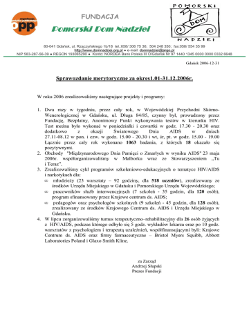 FUNDACJA Pomorski Dom Nadziei 80-041 Gdańsk, ul. Rzączyńskiego 1b/18 tel.:058/ 306 75 36; 504 248 350; fax:058/ 554 35 99 http://www.domnadziei.org.pl ● e-mail: [email protected] NIP 583-287-56-39 ● REGON 193065290 ● Konto: NORDEA Bank Polska III O/Gdańsk Nr 97 1440 1345 0000 0000 0332 6648 Gdańsk 2006-12-31 Sprawozdanie merytoryczne za okres1.01-31.12.2006r. W roku 2006 zrealizowaliśmy następujące projekty i programy: 1. Dwa razy w tygodniu, przez cały rok, w Wojewódzkiej Przychodni SkórnoWenerologicznej w Gdańsku, ul. Długa 84/85, czynny był, prowadzony przez Fundację, Bezpłatny, Anonimowy Punkt wykonywania testów w kierunku HIV. Test moŜna było wykonać w poniedziałki i czwartki w godz. 17.30 - 20.30 oraz Światowego Dnia AIDS w dniach dodatkowo z okazji 27.11-08.12 w pon. i czw. w godz. 15.00 - 20.30 i wt, śr, pt. w godz. 15.00 - 19.00 Łącznie przez cały rok wykonano 1063 badania, z których 18 okazało się pozytywnymi. 2. Obchody "Międzynarodowego Dnia Pamięci o Zmarłych w wyniku AIDS" 23 maja 2006r. współorganizowaliśmy w Malborku wraz ze Stowarzyszeniem „Tu i Teraz”. 3. Zrealizowaliśmy cykl programów szkoleniowo-edukacyjnych o tematyce HIV/AIDS i narkotykach dla: • młodzieŜy (23 warsztaty – 92 godziny, dla 518 uczniów), zrealizowany ze środków Urzędu Miejskiego w Gdańsku i Pomorskiego Urzędu Wojewódzkiego; • pracowników słuŜb interwencyjnych (7 szkoleń - 35 godzin, dla 120 osób), program sfinansowany przez Krajowe centrum ds. AIDS; • pedagogów oraz psychologów szkolnych (9 szkoleń - 45 godzin, dla 128 osób), zrealizowany ze środków Krajowego Centrum ds. AIDS i Urzędu Miejskiego w Gdańsku. 4. W lipcu zorganizowaliśmy turnus terapeutyczno–rehabilitacyjny dla 26 osób Ŝyjących z HIV/AIDS, podczas którego odbyło się 5 godz. wykładów lekarza oraz po 10 godz. warsztatów z psychologiem i terapeutą uzaleŜnień, współfinansującymi byli: Krajowe Centrum ds. AIDS oraz firmy farmaceutyczne – Bristol Myers Squibb, Abbott Laboratories Poland i Glaxo Smith Kline. za Zarząd Andrzej Słupski Prezes Fundacji