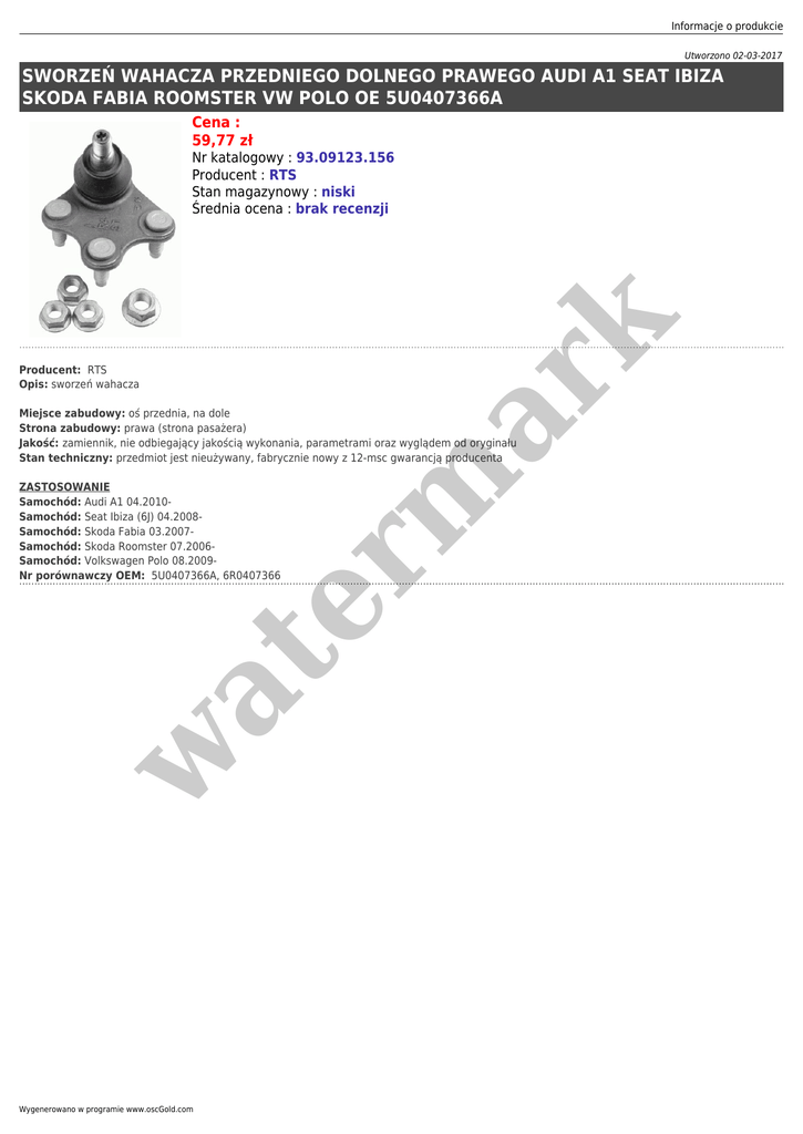 Informacje o produkcie Utworzono 02-03-2017 SWORZEŃ WAHACZA PRZEDNIEGO DOLNEGO PRAWEGO AUDI A1 SEAT IBIZA SKODA FABIA ROOMSTER VW POLO OE 5U0407366A Cena : 59,77 zł Producent: RTS Opis: sworzeń wahacza er m ar k Nr katalogowy : 93.09123.156 Producent : RTS Stan magazynowy : niski Średnia ocena : brak recenzji Miejsce zabudowy: oś przednia, na dole Strona zabudowy: prawa (strona pasażera) Jakość: zamiennik, nie odbiegający jakością wykonania, parametrami oraz wyglądem od oryginału Stan techniczny: przedmiot jest nieużywany, fabrycznie nowy z 12-msc gwarancją producenta w at ZASTOSOWANIE Samochód: Audi A1 04.2010Samochód: Seat Ibiza (6J) 04.2008Samochód: Skoda Fabia 03.2007Samochód: Skoda Roomster 07.2006Samochód: Volkswagen Polo 08.2009Nr porównawczy OEM: 5U0407366A, 6R0407366 Wygenerowano w programie www.oscGold.com