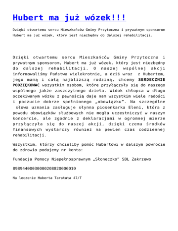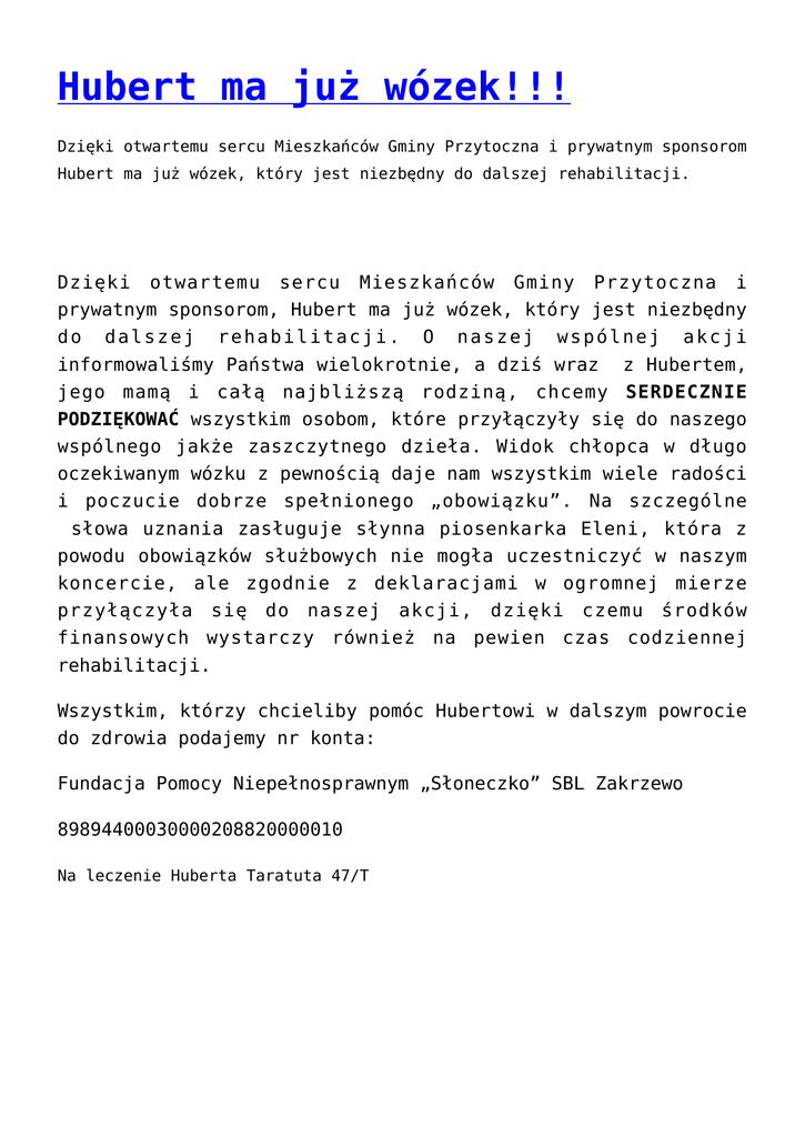 Hubert ma już wózek!!! Dzięki otwartemu sercu Mieszkańców Gminy Przytoczna i prywatnym sponsorom Hubert ma już wózek, który jest niezbędny do dalszej rehabilitacji. Dzięki otwartemu sercu Mieszkańców Gminy Przytoczna i prywatnym sponsorom, Hubert ma już wózek, który jest niezbędny do dalszej rehabilitacji. O naszej wspólnej akcji informowaliśmy Państwa wielokrotnie, a dziś wraz z Hubertem, jego mamą i całą najbliższą rodziną, chcemy SERDECZNIE PODZIĘKOWAĆ wszystkim osobom, które przyłączyły się do naszego wspólnego jakże zaszczytnego dzieła. Widok chłopca w długo oczekiwanym wózku z pewnością daje nam wszystkim wiele radości i poczucie dobrze spełnionego „obowiązku”. Na szczególne słowa uznania zasługuje słynna piosenkarka Eleni, która z powodu obowiązków służbowych nie mogła uczestniczyć w naszym koncercie, ale zgodnie z deklaracjami w ogromnej mierze przyłączyła się do naszej akcji, dzięki czemu środków finansowych wystarczy również na pewien czas codziennej rehabilitacji. Wszystkim, którzy chcieliby pomóc Hubertowi w dalszym powrocie do zdrowia podajemy nr konta: Fundacja Pomocy Niepełnosprawnym „Słoneczko” SBL Zakrzewo 89894400030000208820000010 Na leczenie Huberta Taratuta 47/T Hubert ma już wózek!!! Hubert ma już wózek!!! Hubert ma już wózek!!!